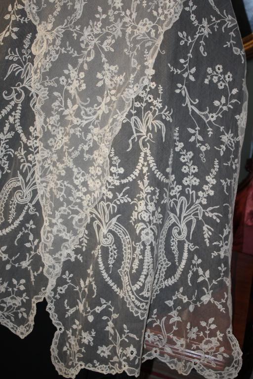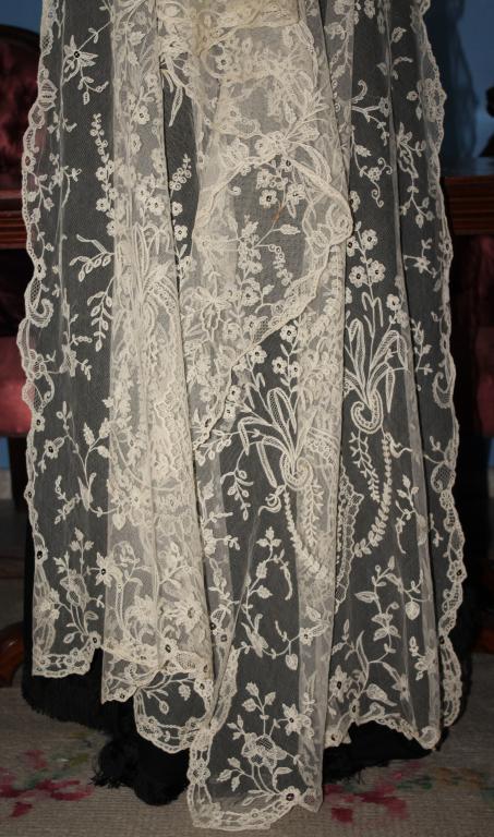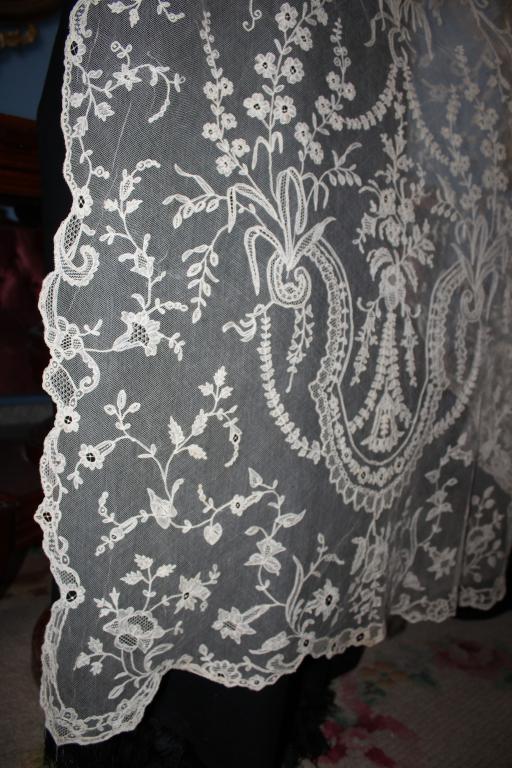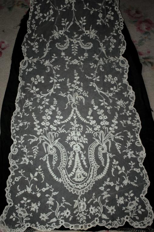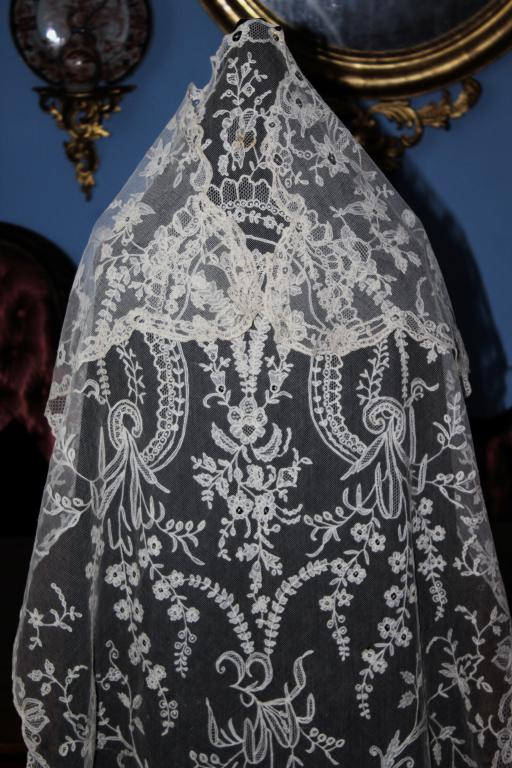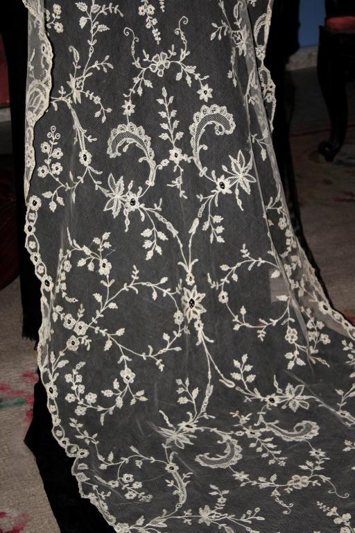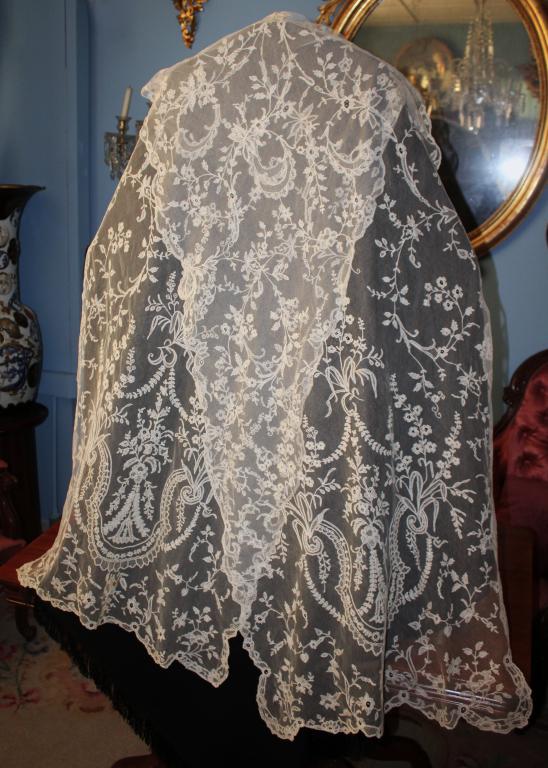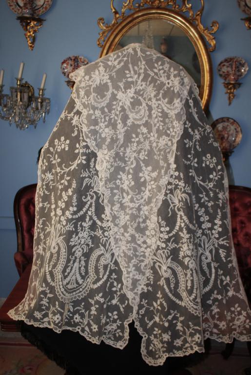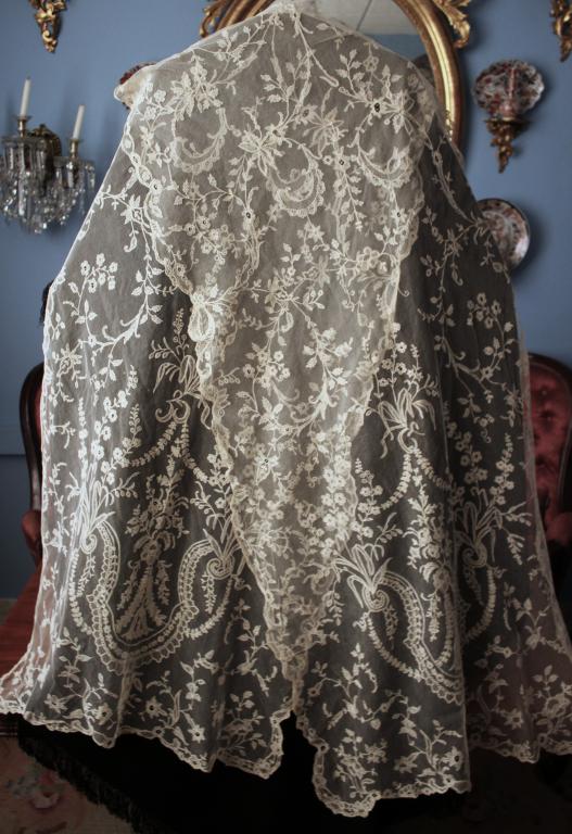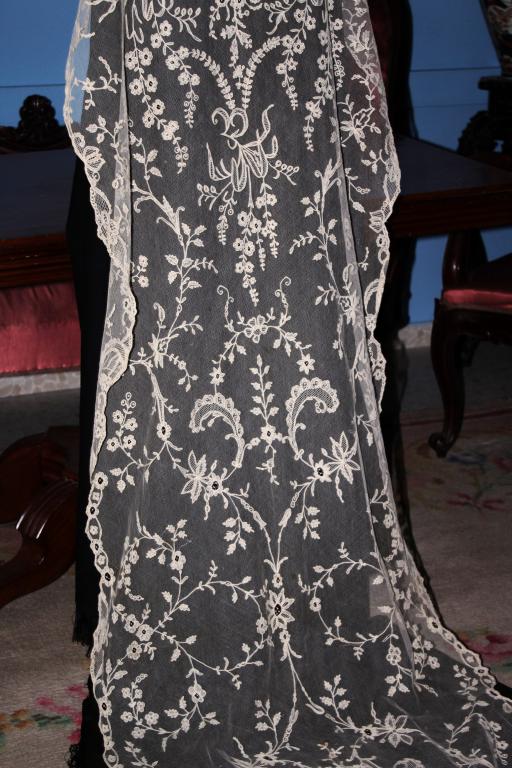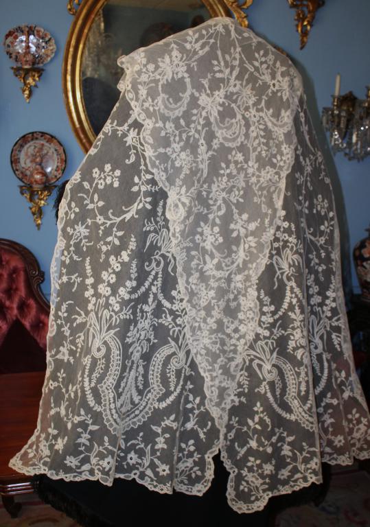 Preciosa mantilla de novia de finales del Siglo XIX (aproximadamente de 1890) en encaje de Bruselas, de forma rectangular o de toalla,  bordada a mano sobre un tul de seda en punto y aplique de aguja,  para los contornos y para todo el relleno.