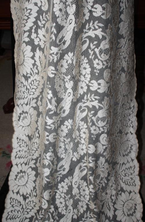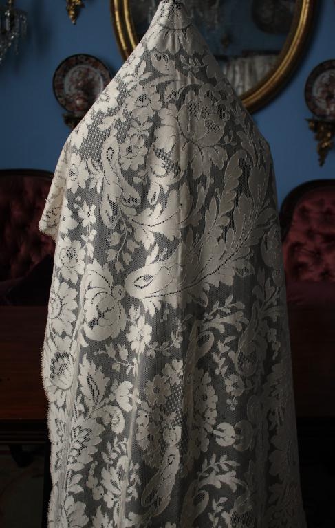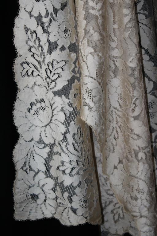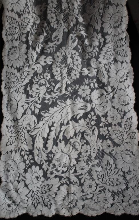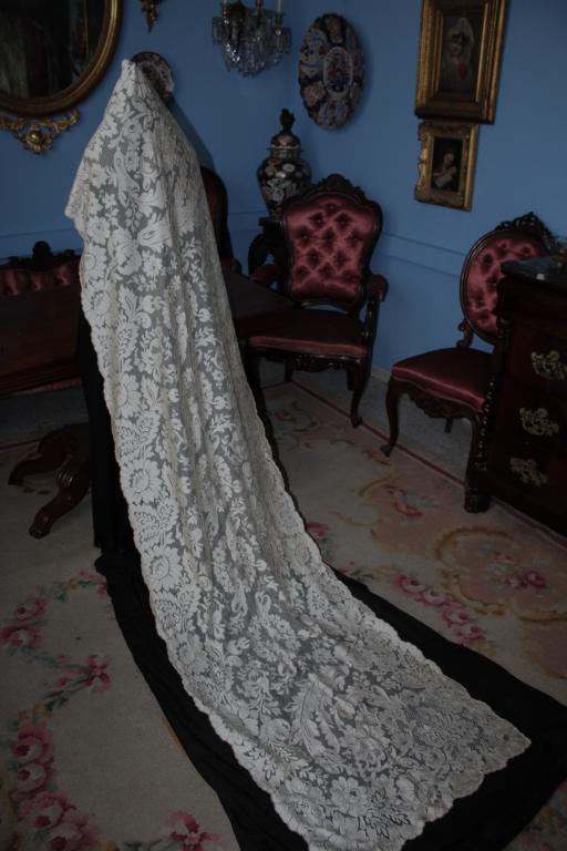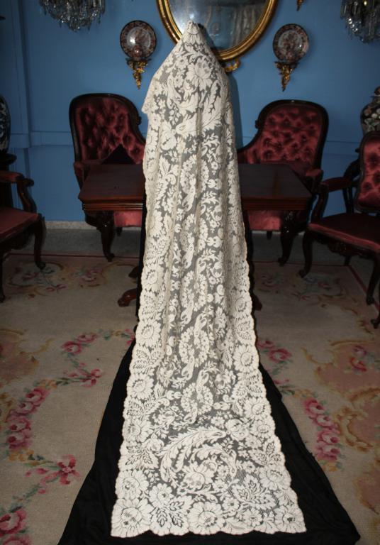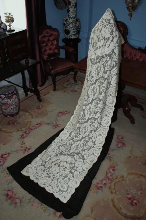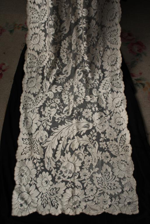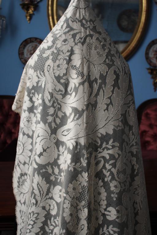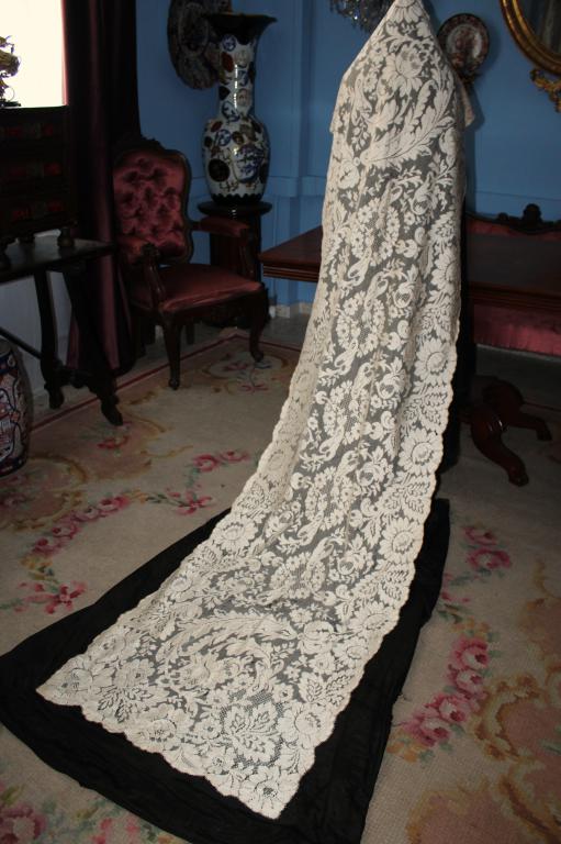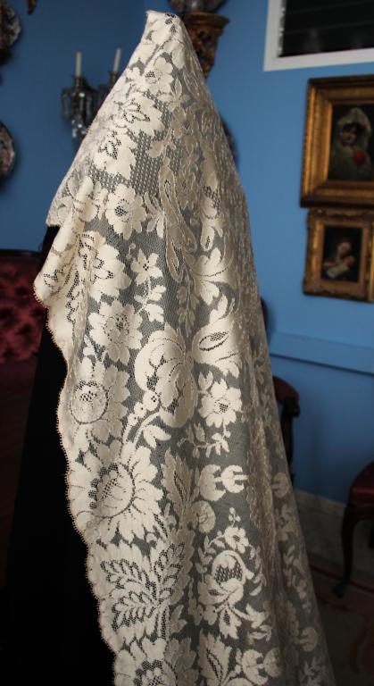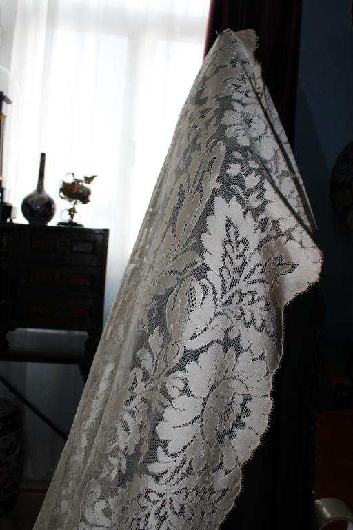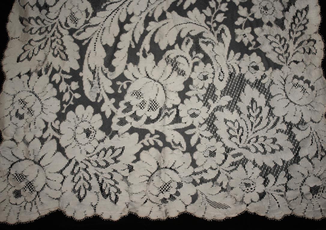 Su temática es de flores y hojas . Una obra de arte y refinamiento.  Buen estado de conservación. Se puede utilizar como mantilla y también como velo de novia.