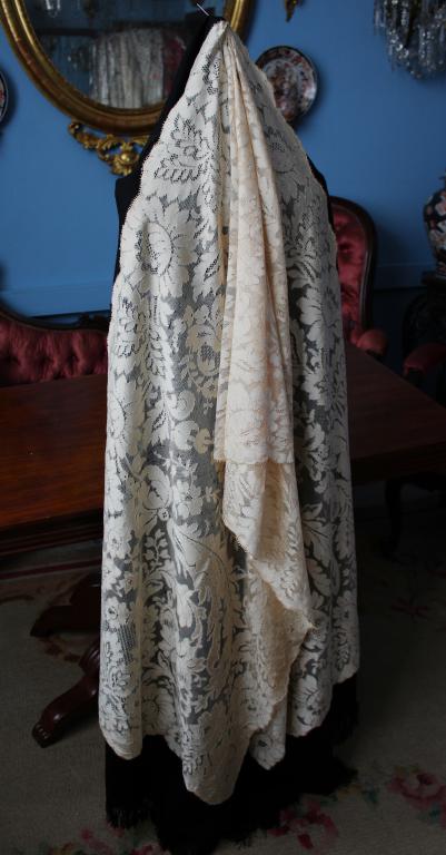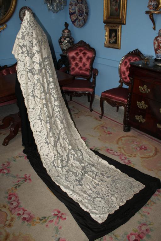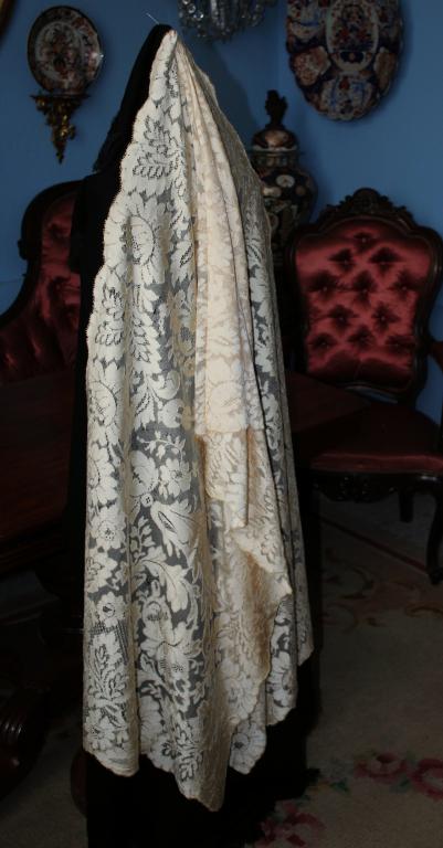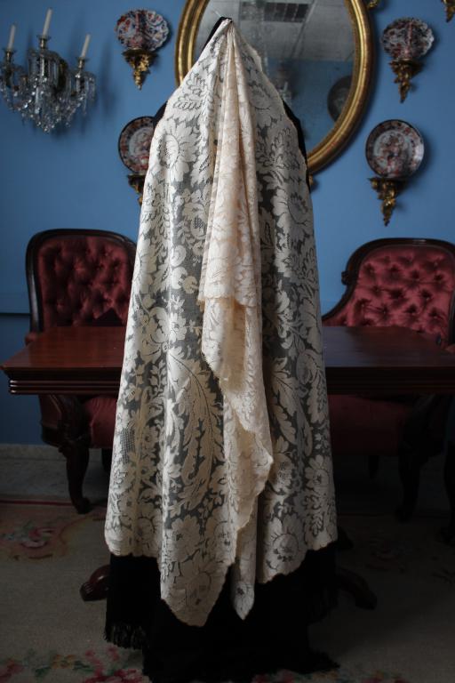 Magnífica mantilla beige en seda de encaje de blonda francesa de finales del siglo XIX. El diseño único y maravilloso.