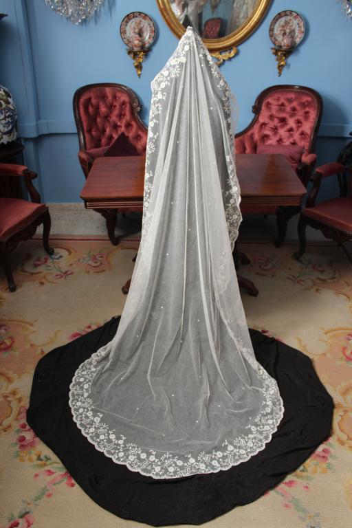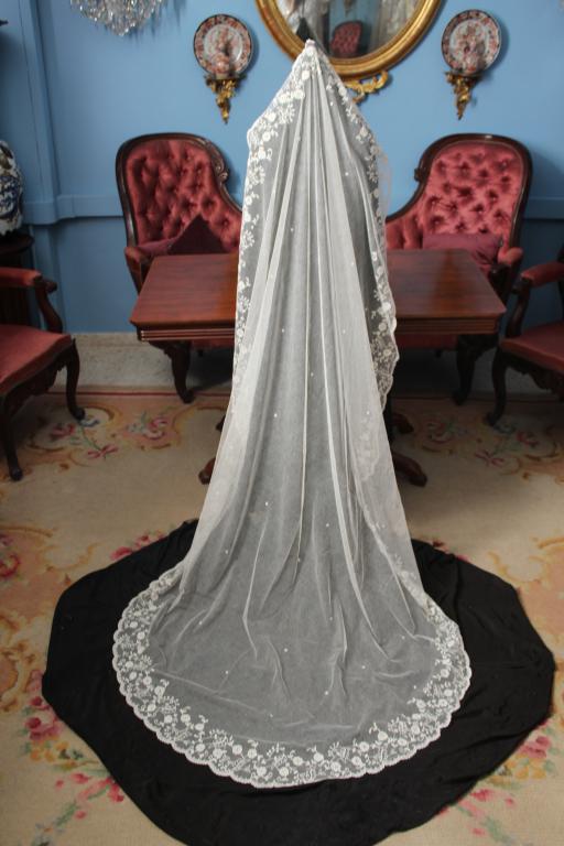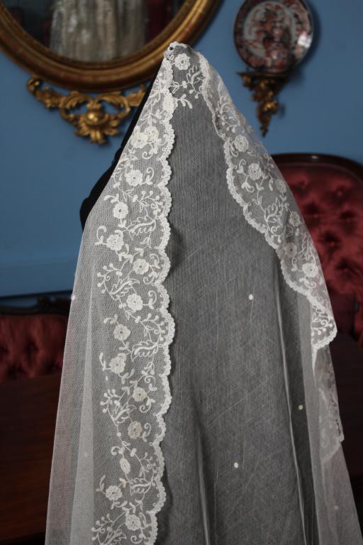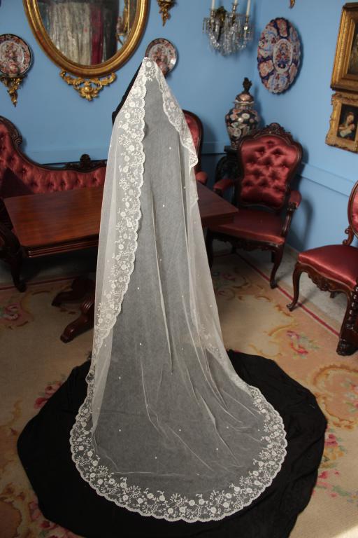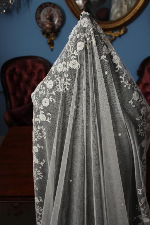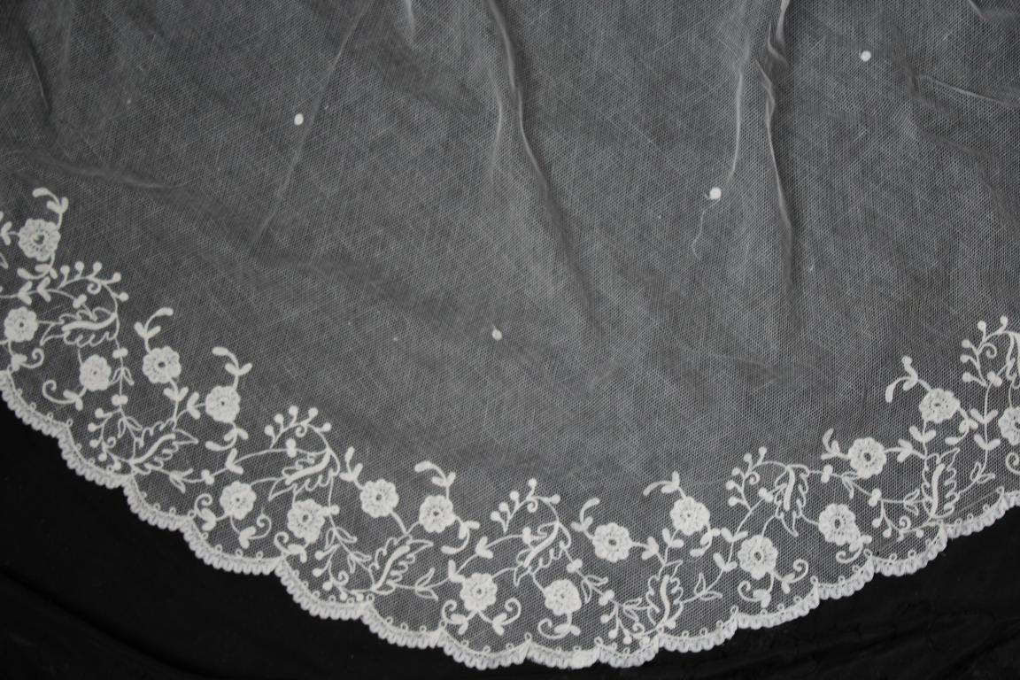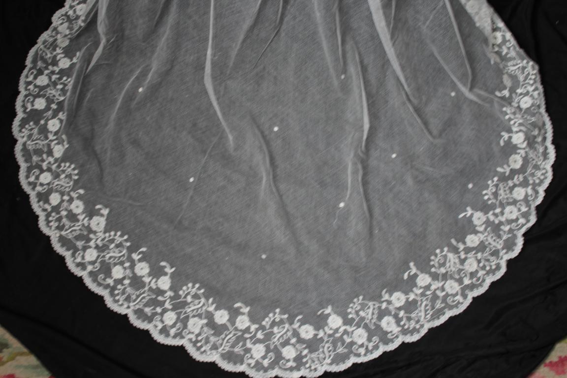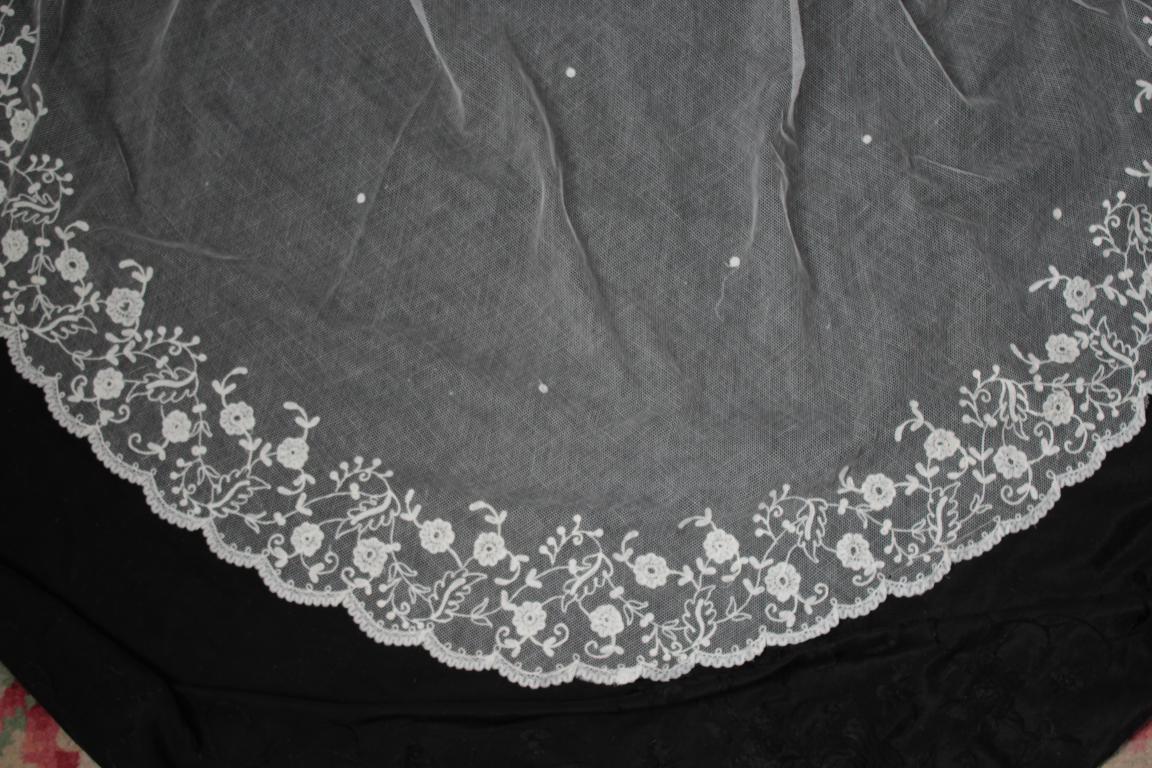 Este es un velo Victoriano de novia extraordinario de finales del siglo XIX (1890), bordado sobre tambor en el tul de muselina con dibujos en todo el borde del mismo.