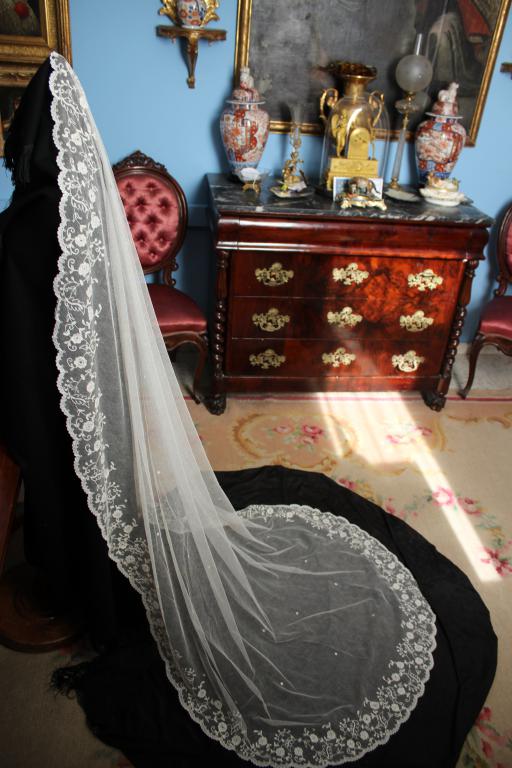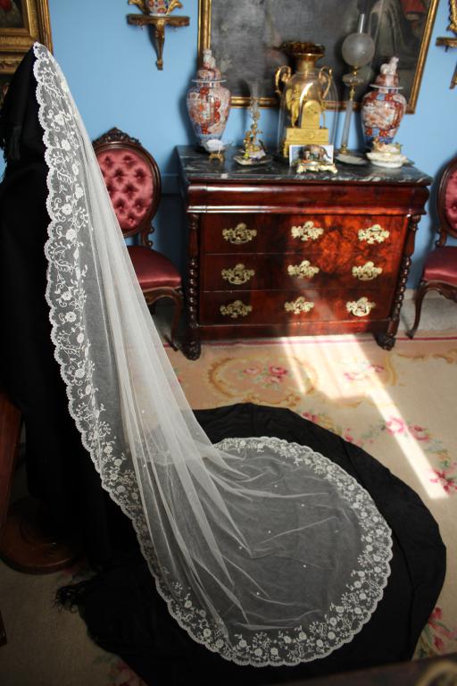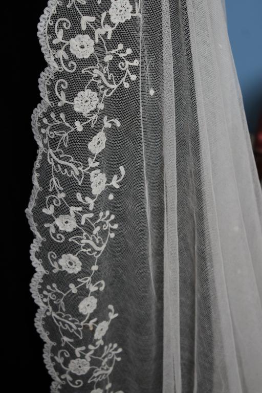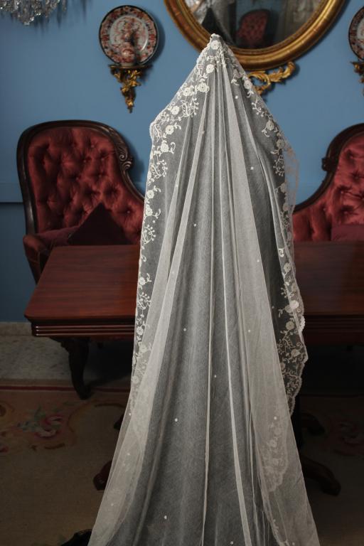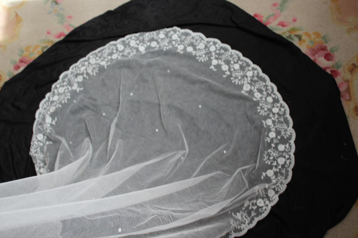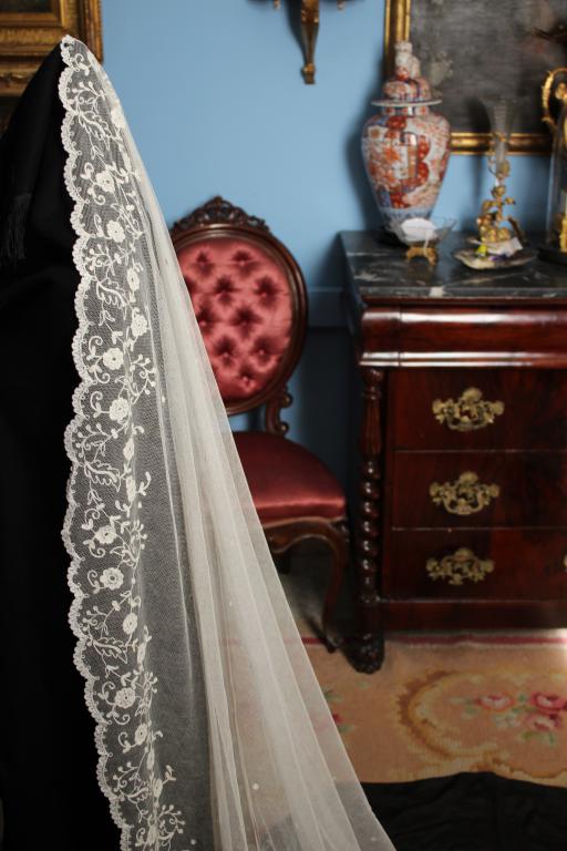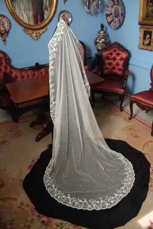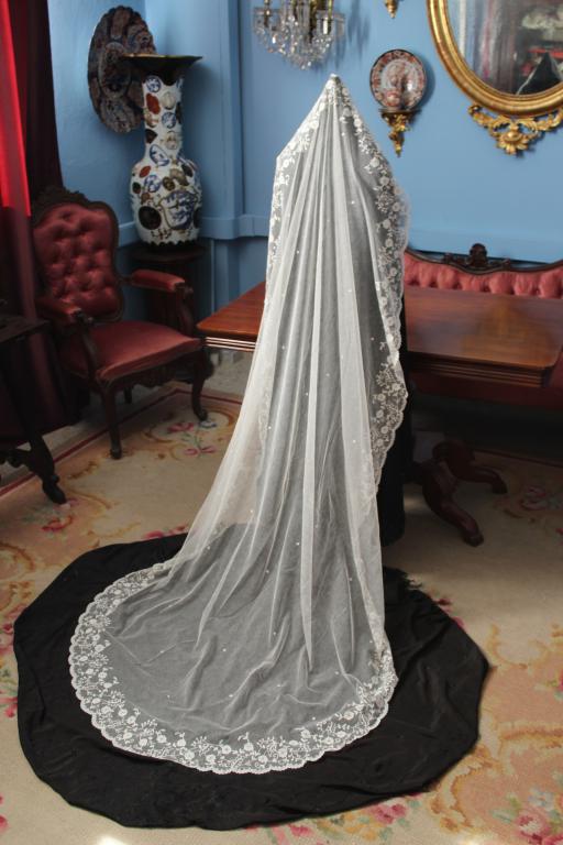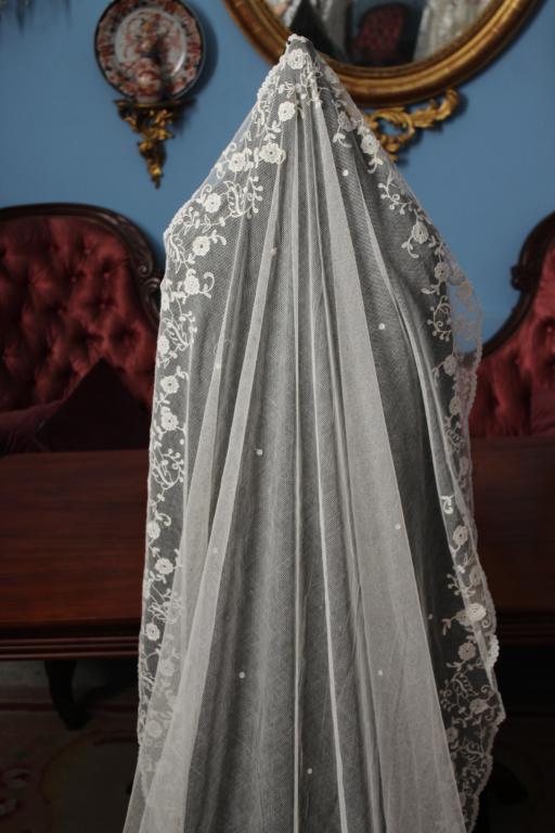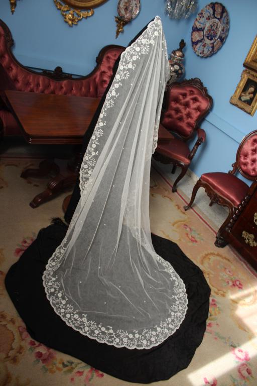 Este es un velo Victoriano de novia extraordinario de finales del siglo XIX (1890), bordado sobre tambor en el tul de muselina con dibujos en todo el borde del mismo.