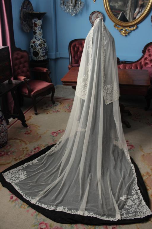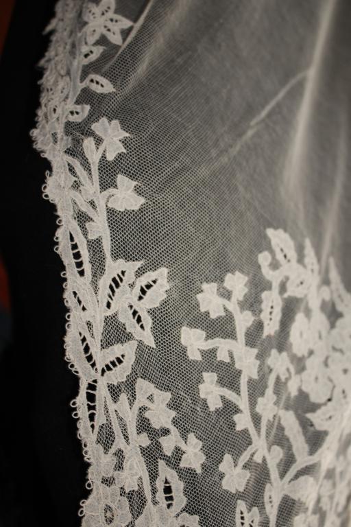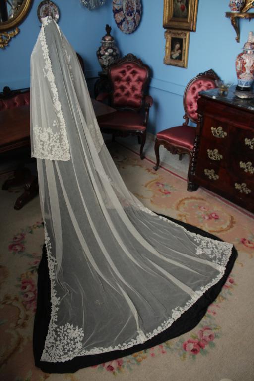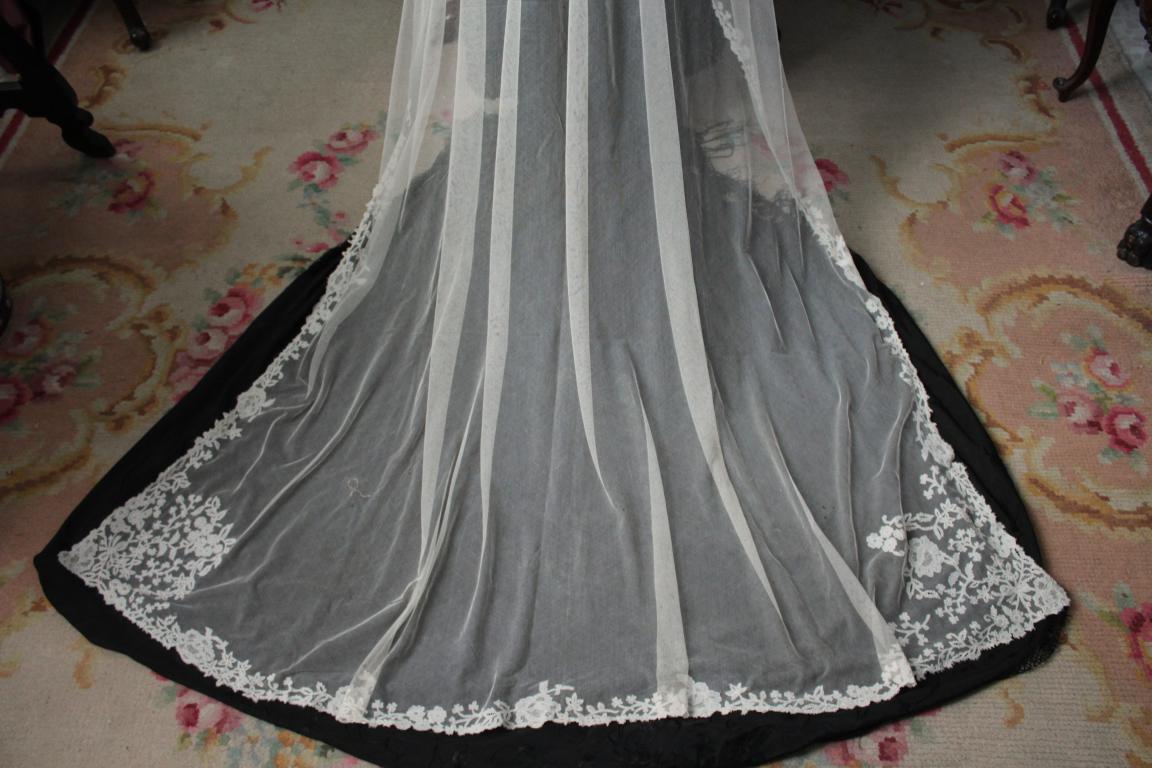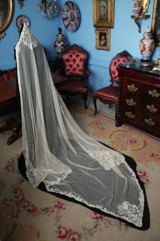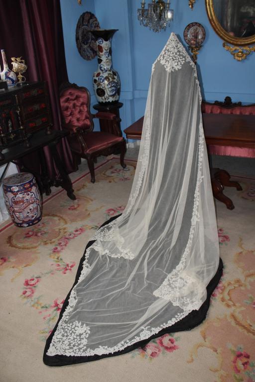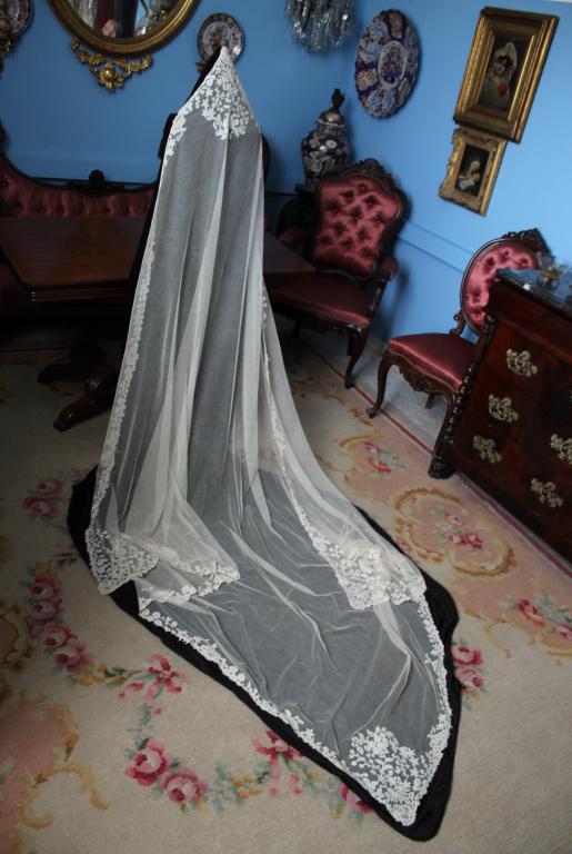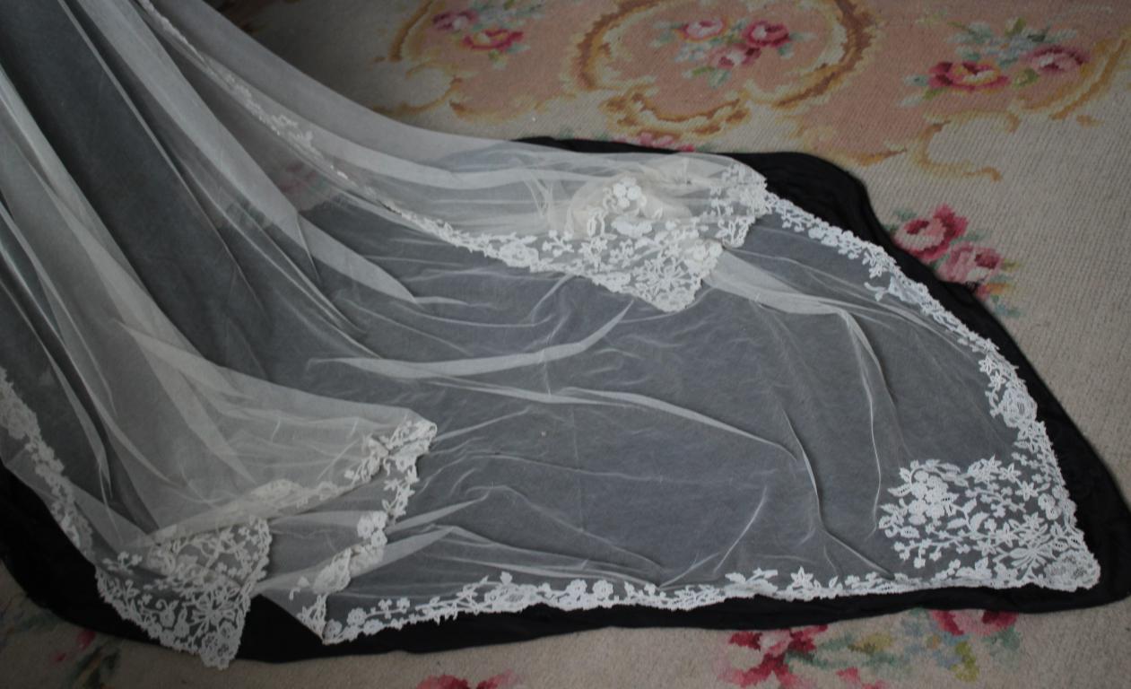 Magnífico y espectacular velo de encaje de Honiton en bolillos de finales del siglo XIX. Bordado a mano  sobre tul de seda. El diseño único y maravilloso. De color beige o crudo. Totalmente festonreado en todo el perimetro, siendo en las esquinas donde hay mayor profusion de encajes.