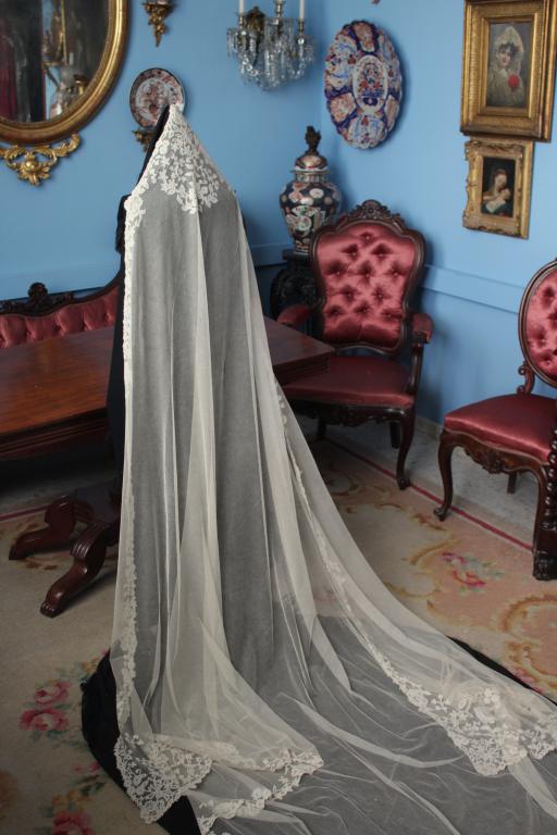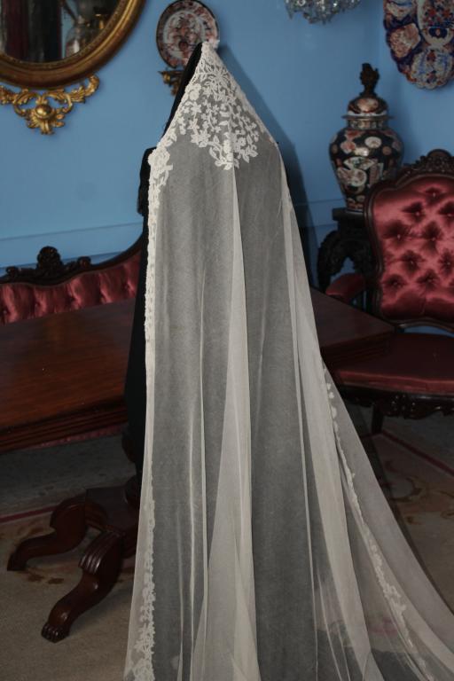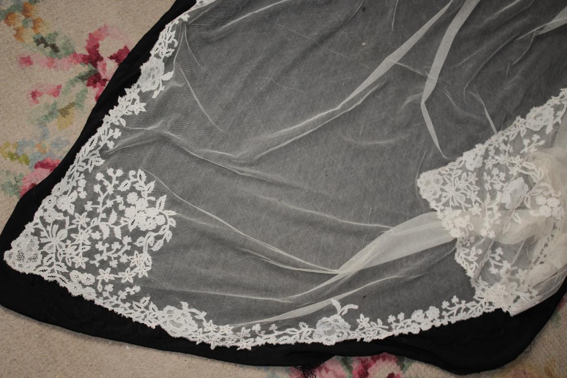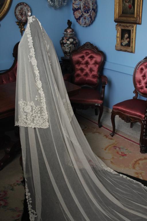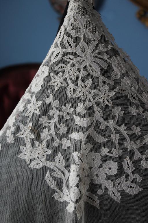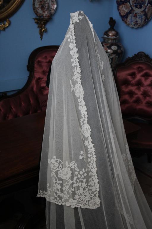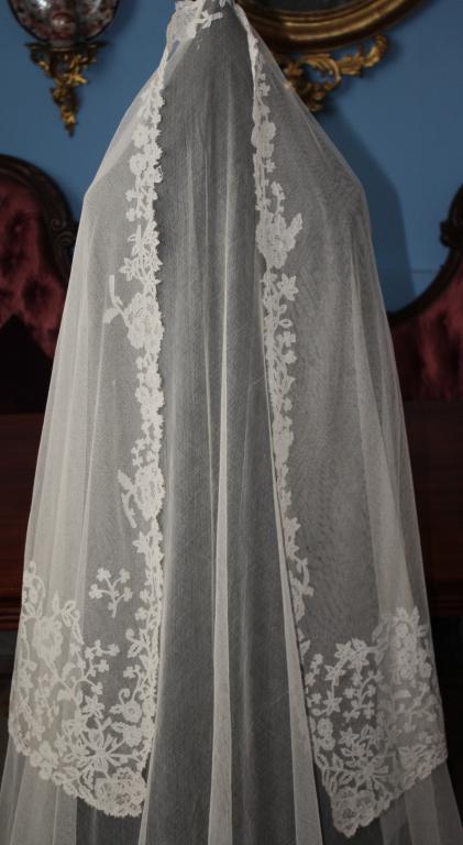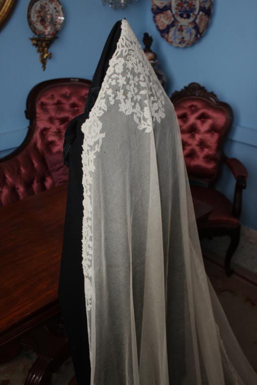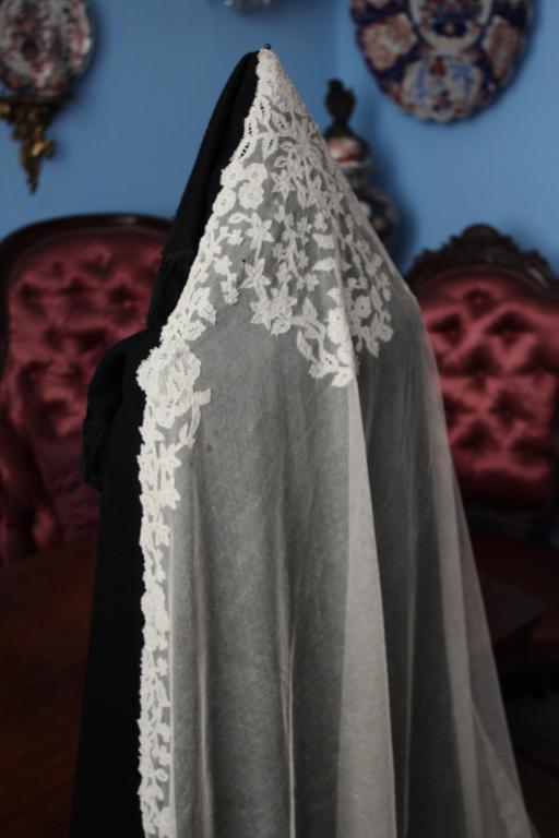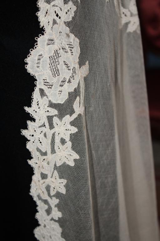 Magnífico y espectacular velo de encaje de Honiton en bolillos de finales del siglo XIX. Bordado a mano  sobre tul de seda. El diseño único y maravilloso. De color beige o crudo. Totalmente festonreado en todo el perimetro, siendo en las esquinas donde hay mayor profusion de encajes.