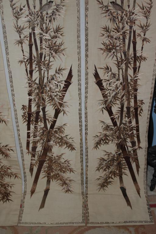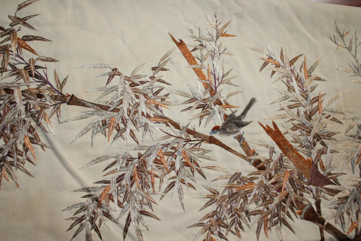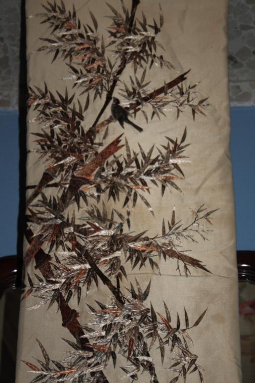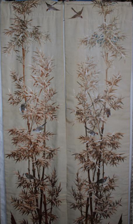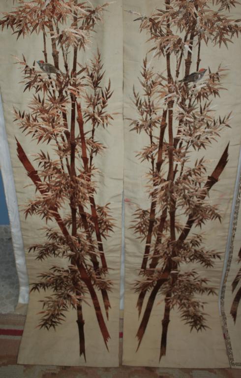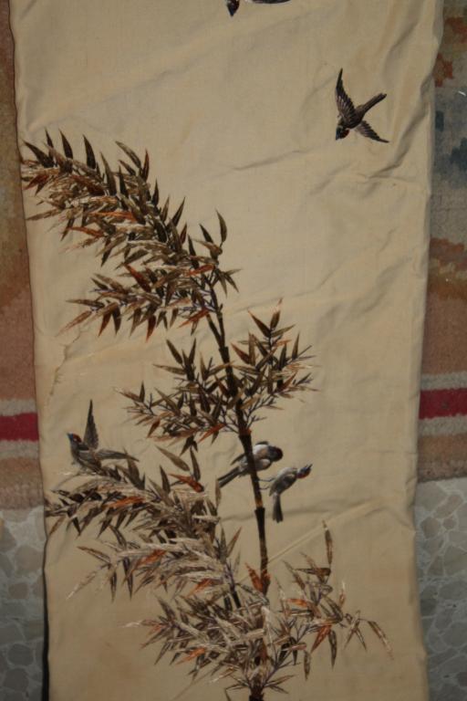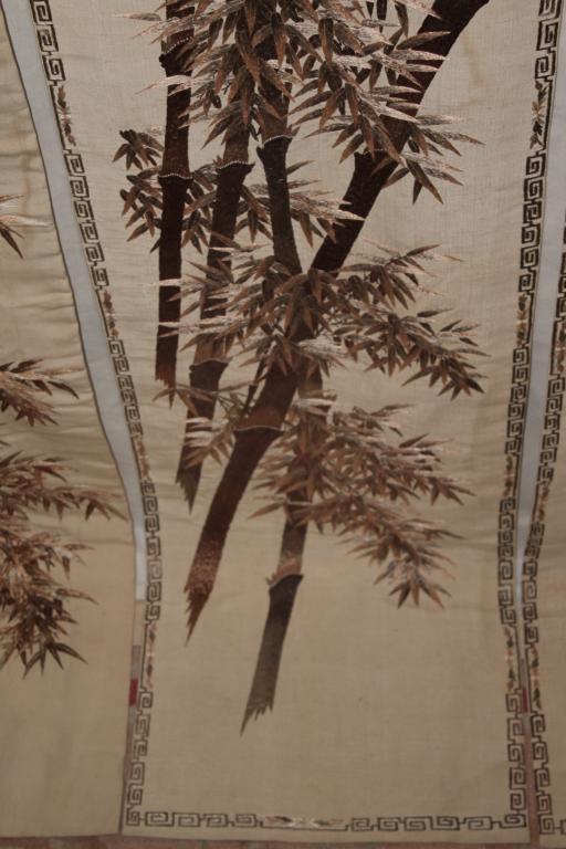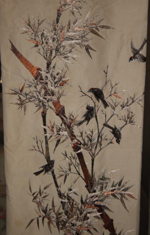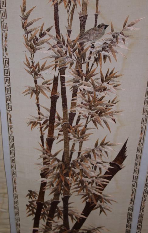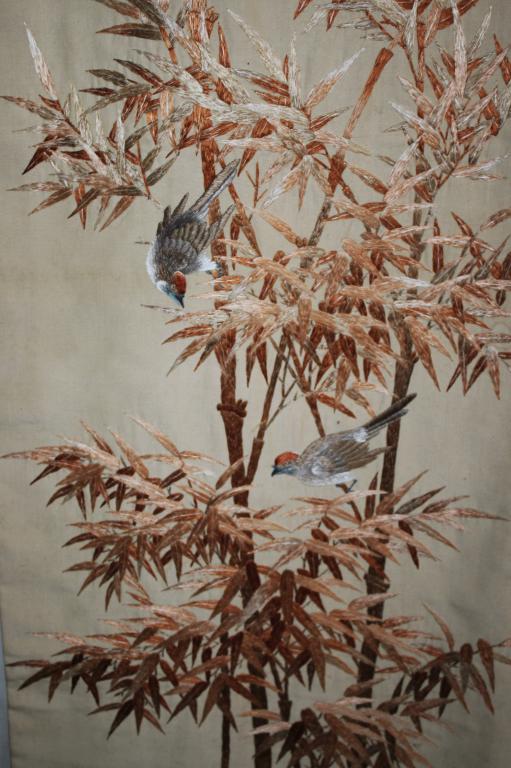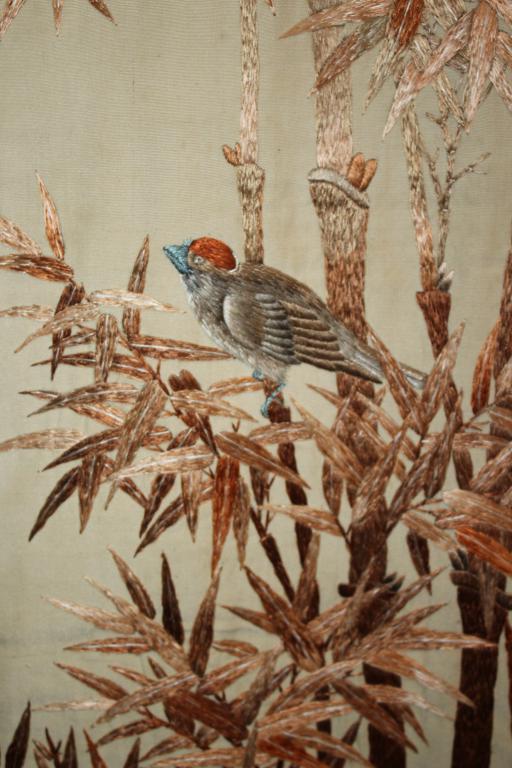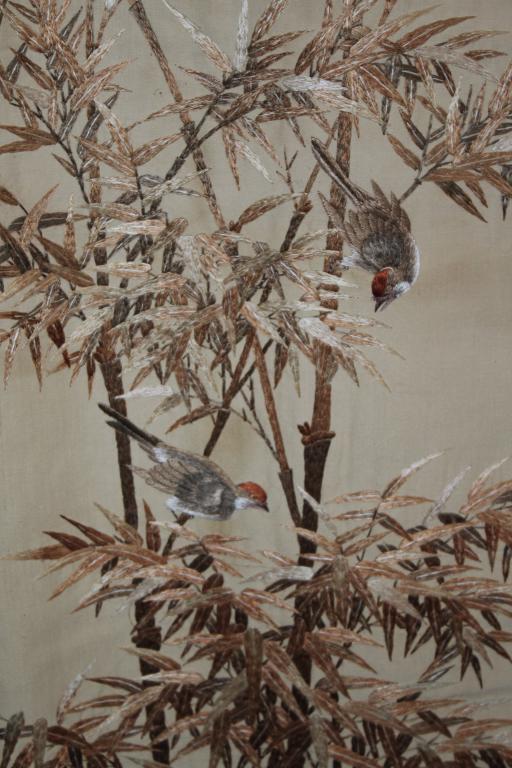 Su composición en un bosque de bambú, con dos grullas y una bandada de pájaros, haciendo una composición equilibrada y de gran belleza, bordadas las grullas en hilos negro, , varias tonalidades de grises y blancos, y las cañas de bambú en colores ocres y cobre, con ramas, hojas y tallos bordadas magníficamente, donde destacan pájaros por doquier.