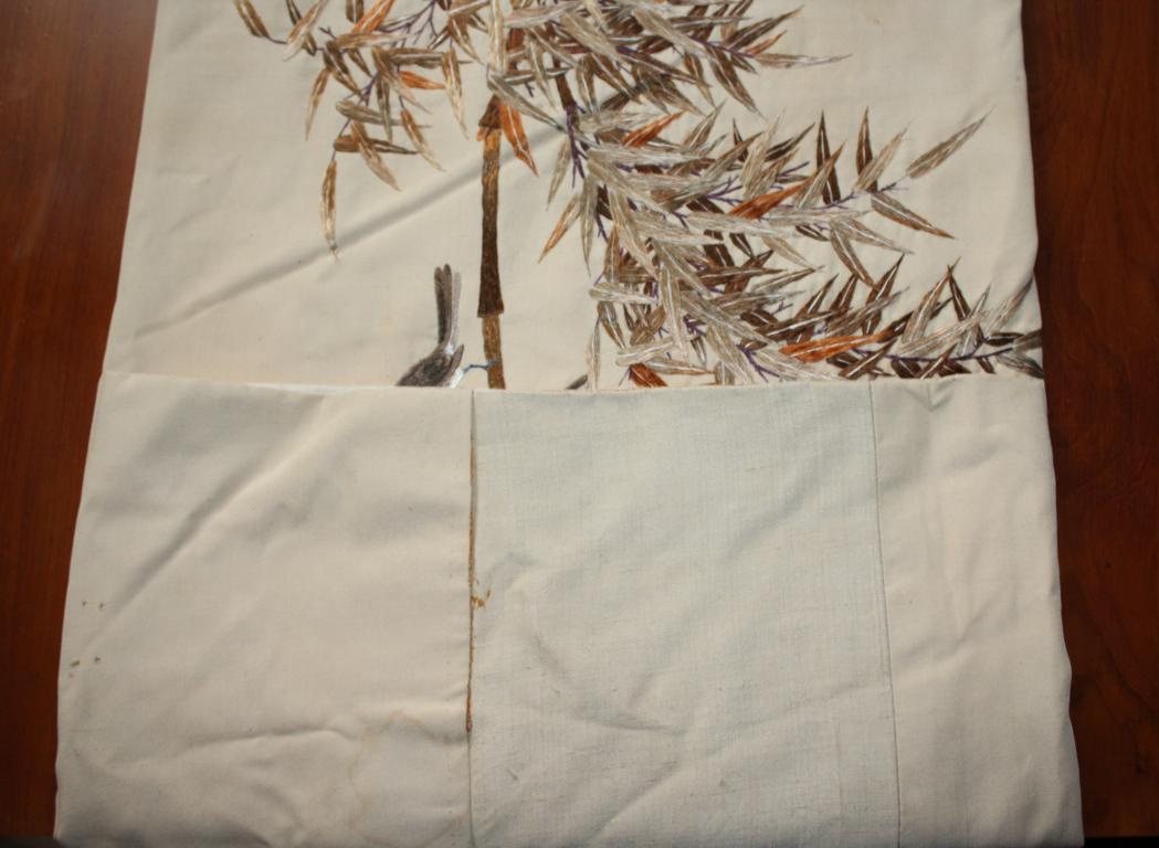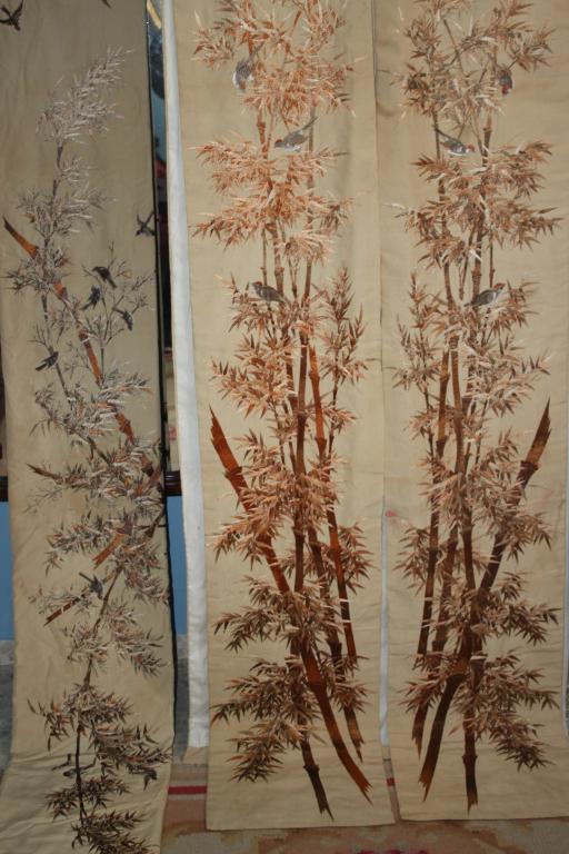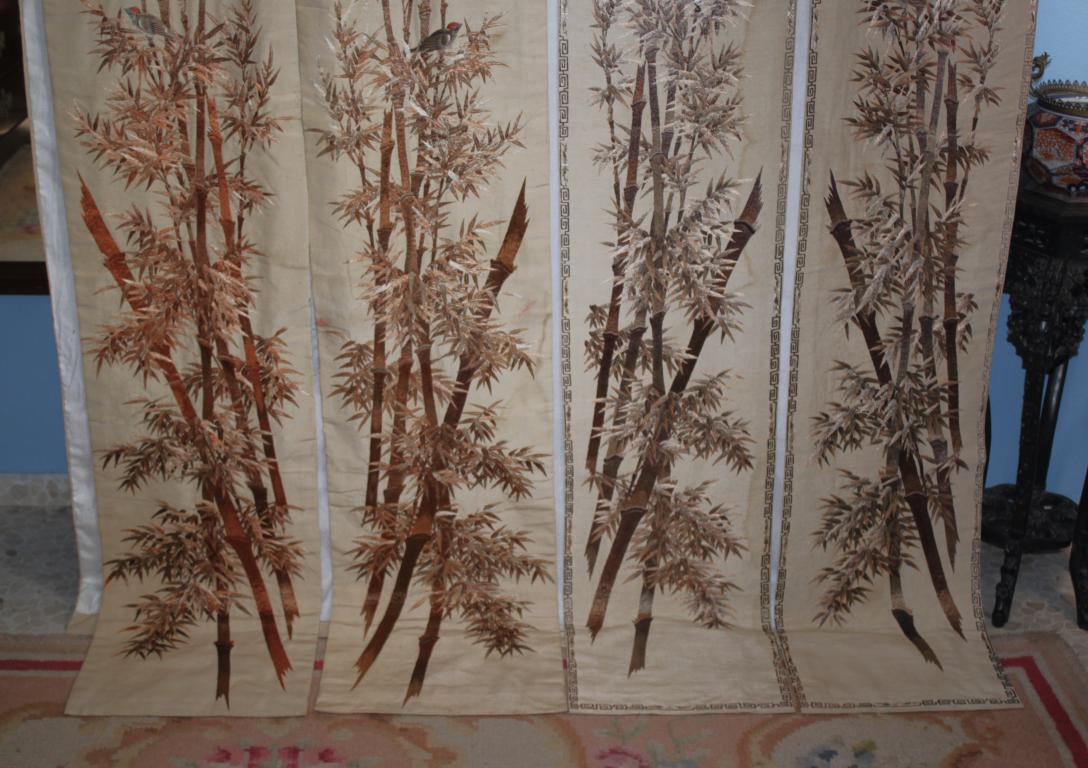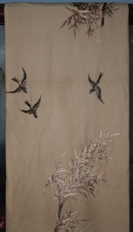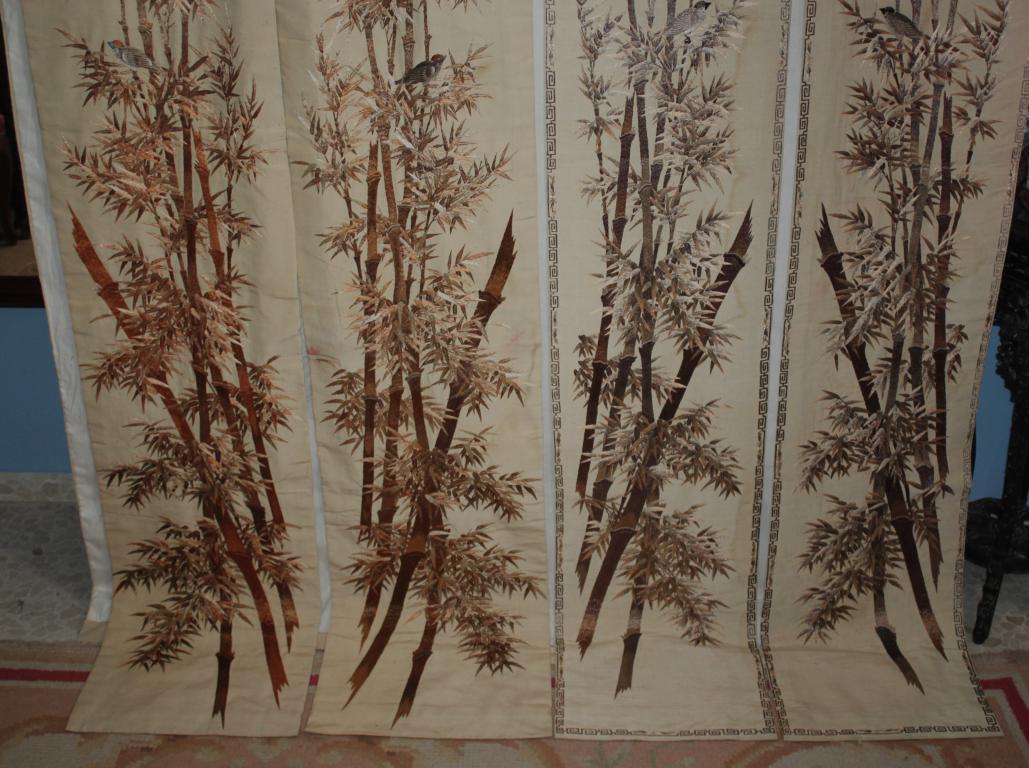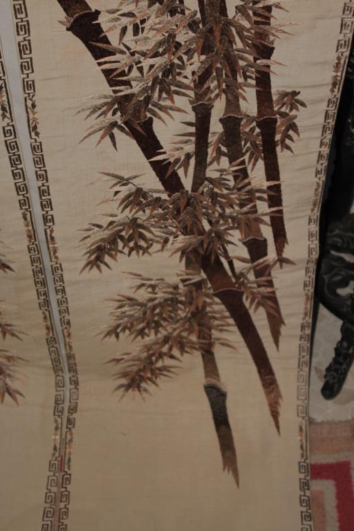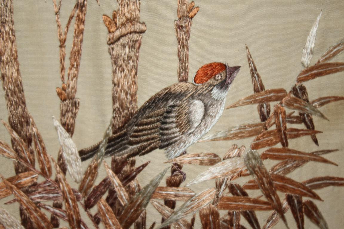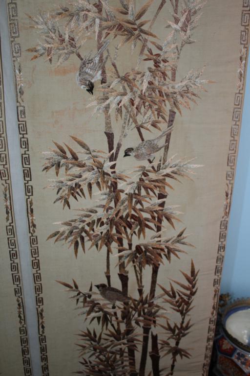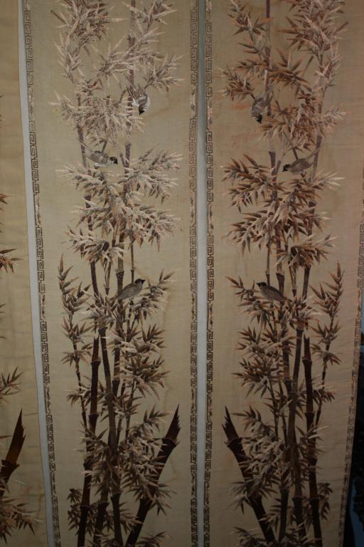 Su composición en un bosque de bambú, con dos grullas y una bandada de pájaros, haciendo una composición equilibrada y de gran belleza, bordadas las grullas en hilos negro, , varias tonalidades de grises y blancos, y las cañas de bambú en colores ocres y cobre, con ramas, hojas y tallos bordadas magníficamente, donde destacan pájaros por doquier.