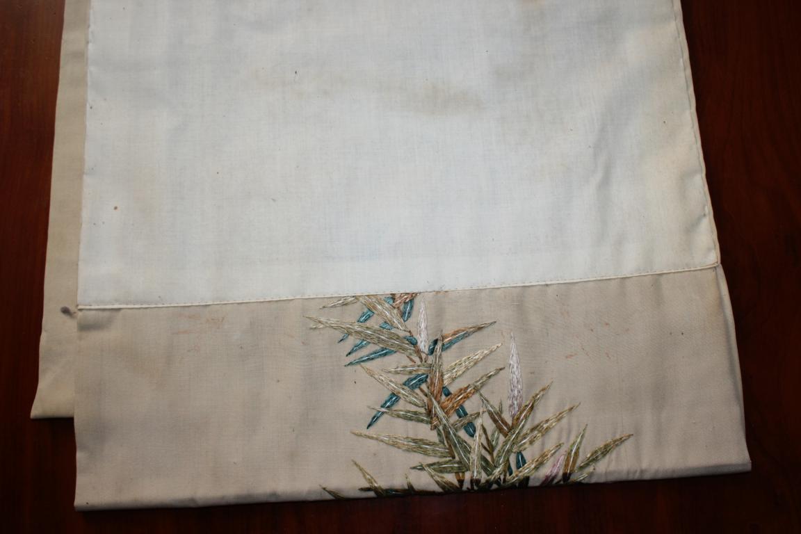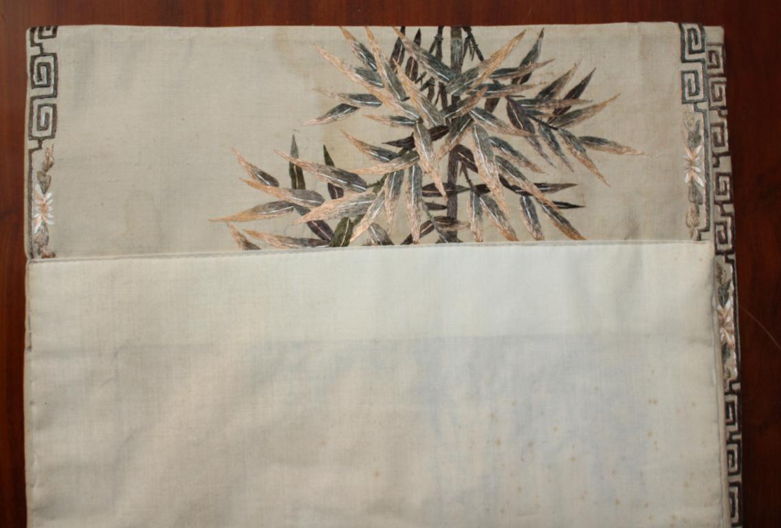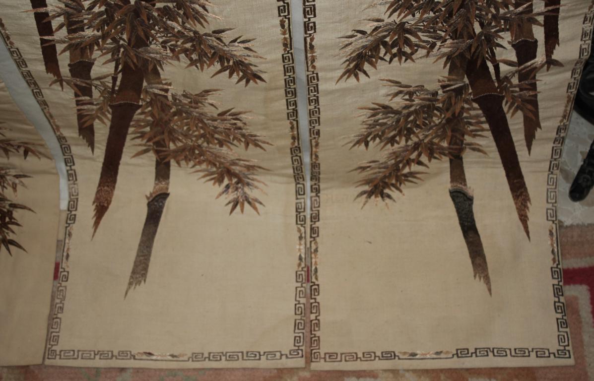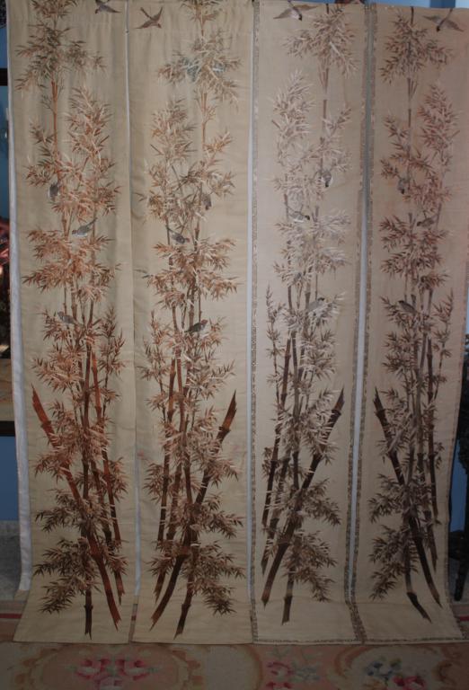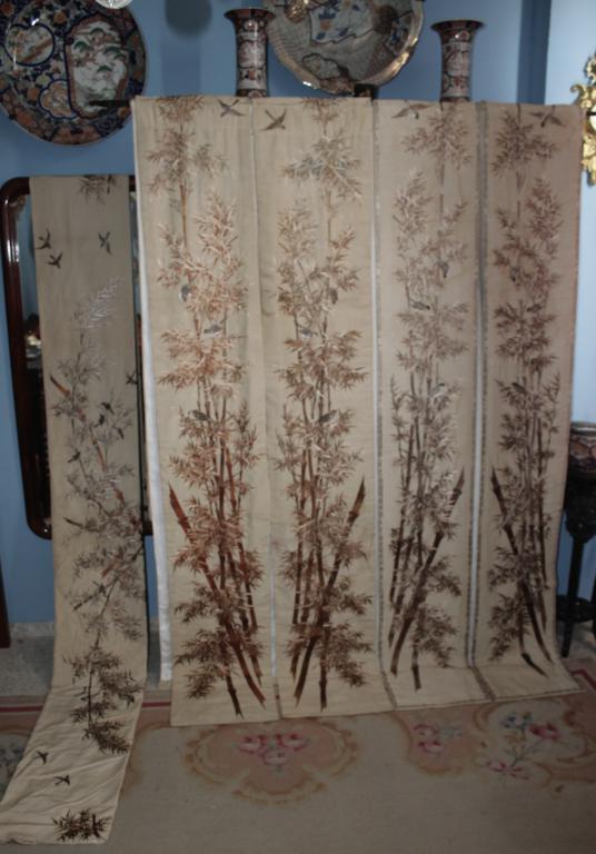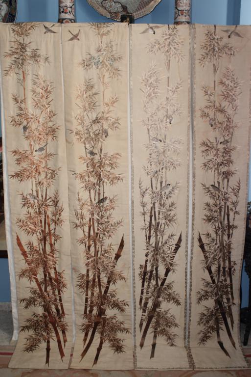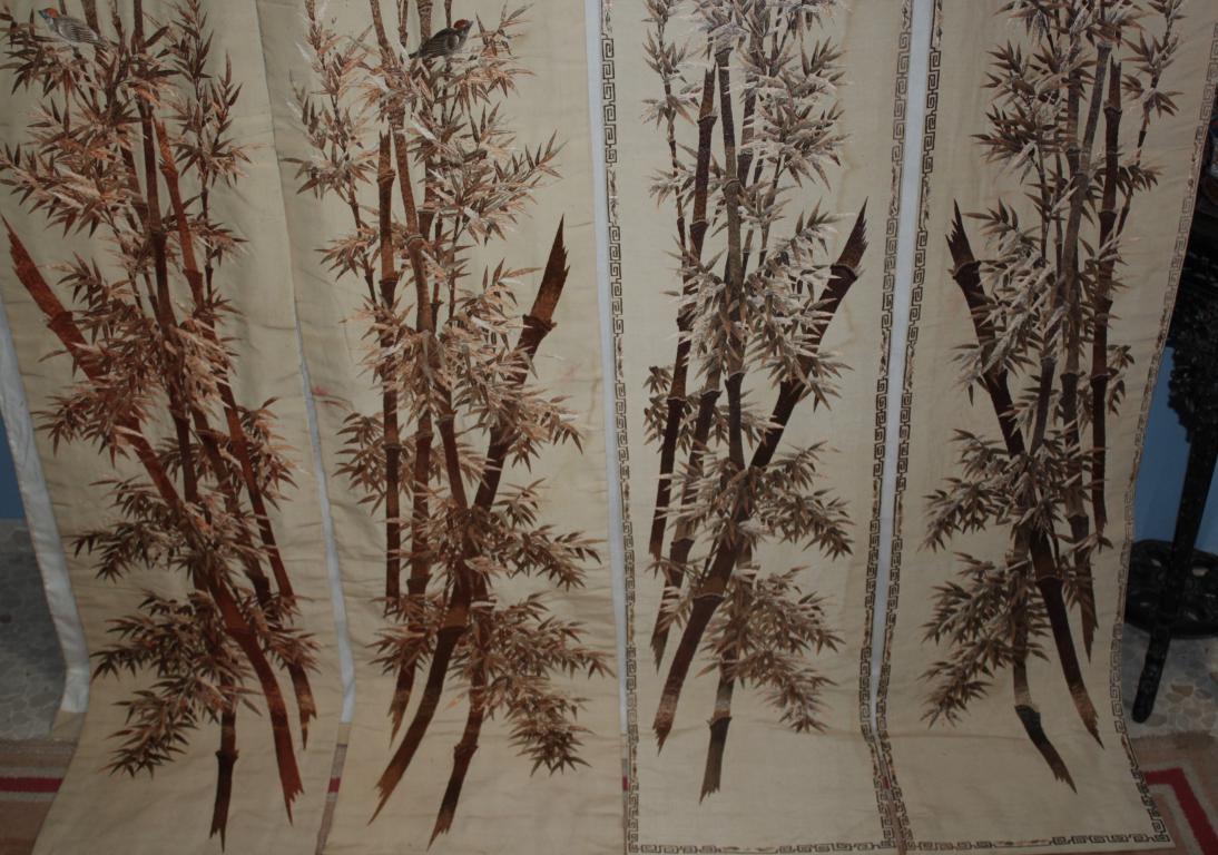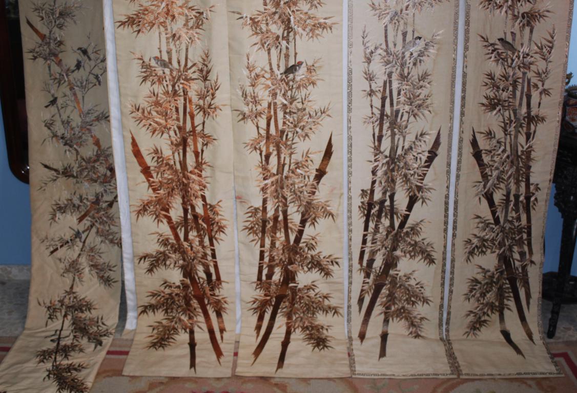 Su composición en un bosque de bambú, con dos grullas y una bandada de pájaros, haciendo una composición equilibrada y de gran belleza, bordadas las grullas en hilos negro, , varias tonalidades de grises y blancos, y las cañas de bambú en colores ocres y cobre, con ramas, hojas y tallos bordadas magníficamente, donde destacan pájaros por doquier.