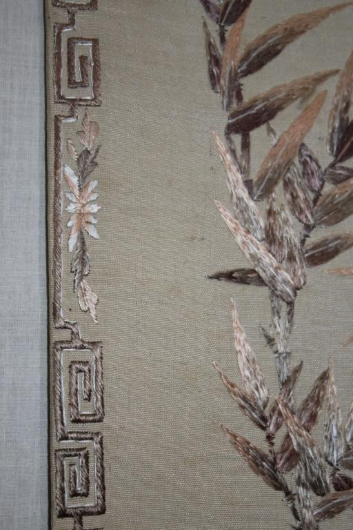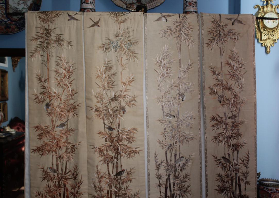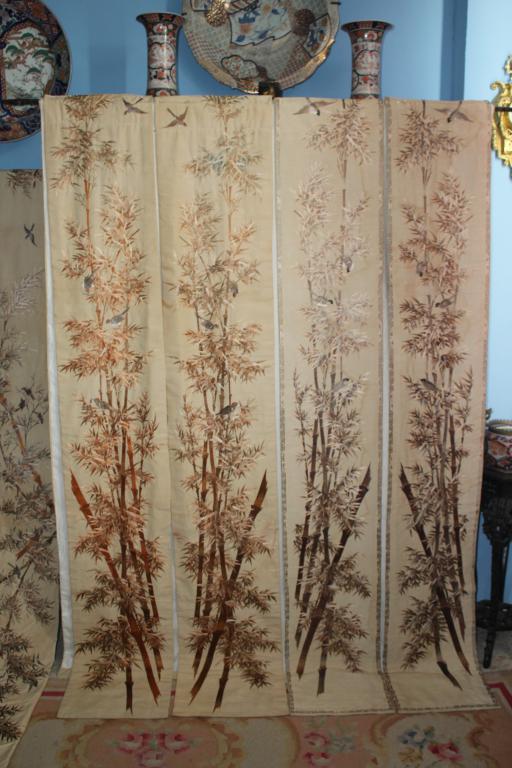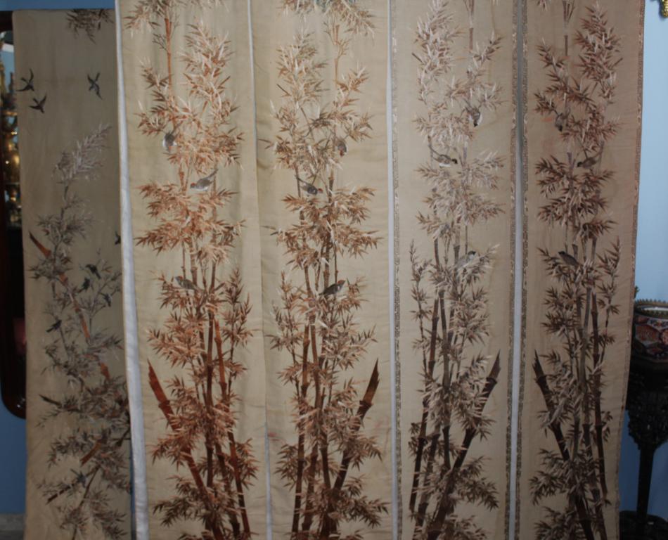 Extraordinario Tapiz cantonés de finales del Siglo XIX o principios del Siglo XX, realizado en seda beige y bordado magníficamente en hilos de seda en tonos grises, marrones, cobre, negro, blanco, etc