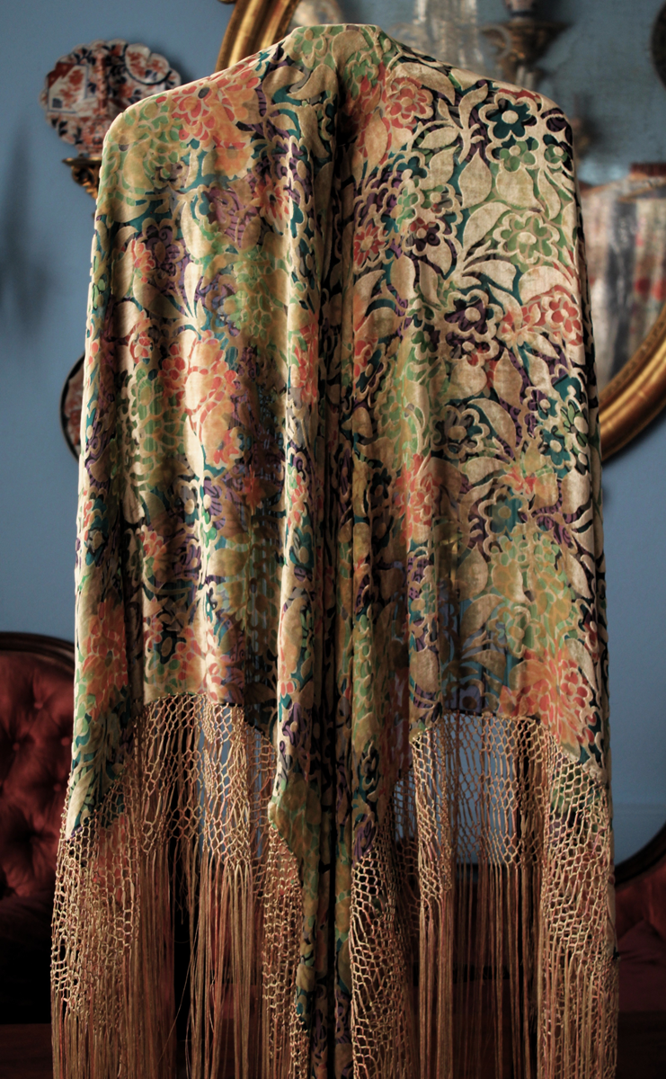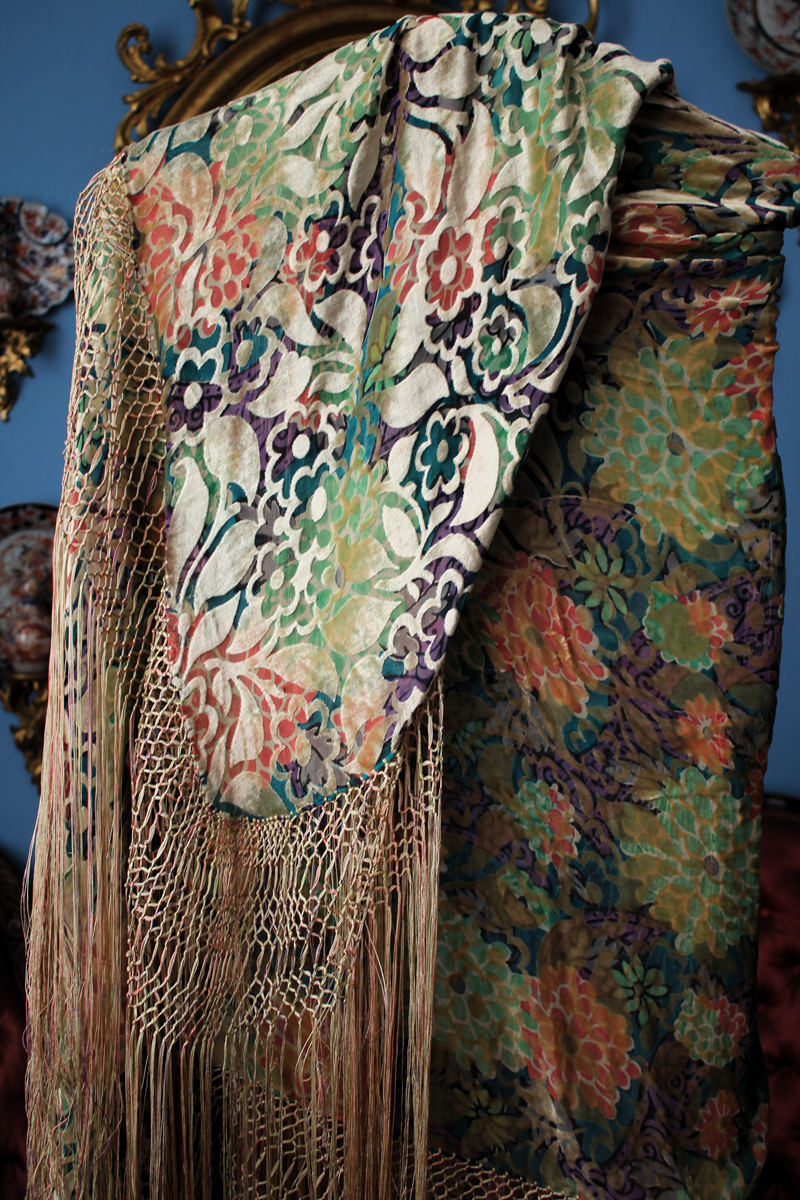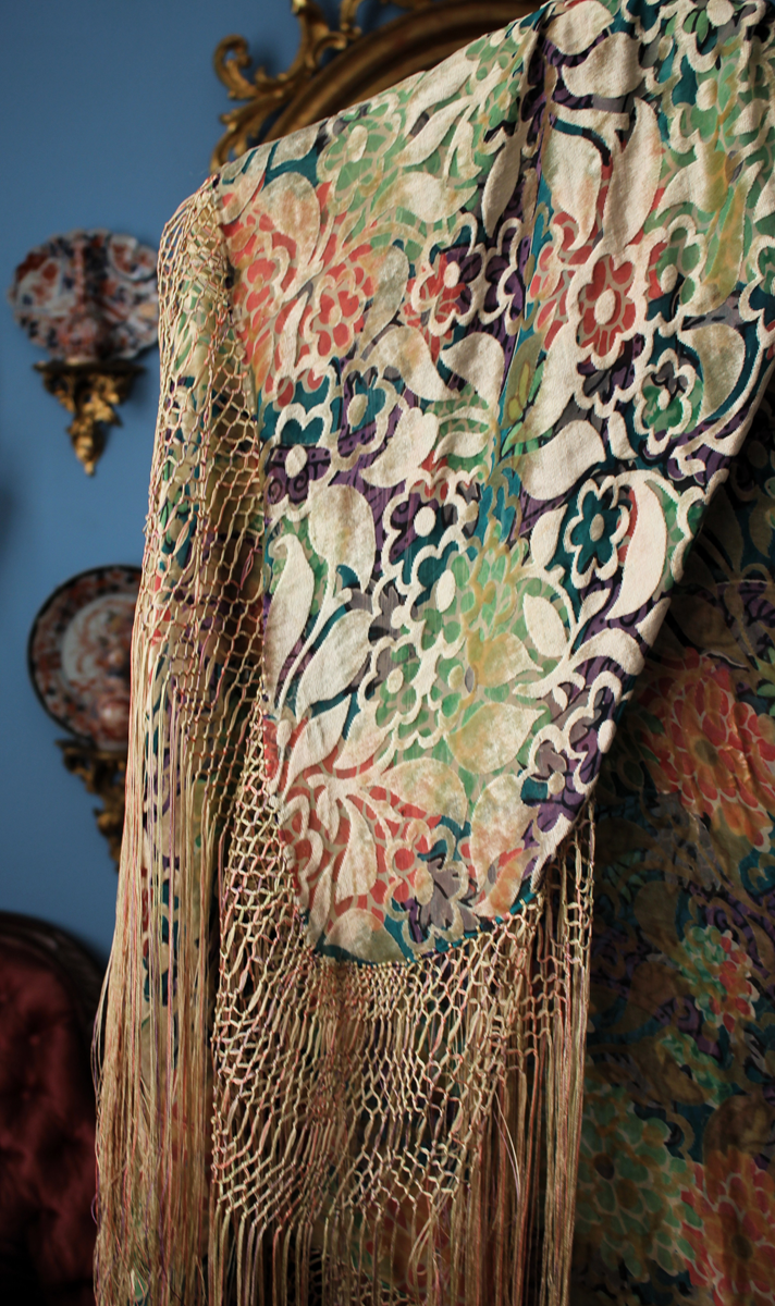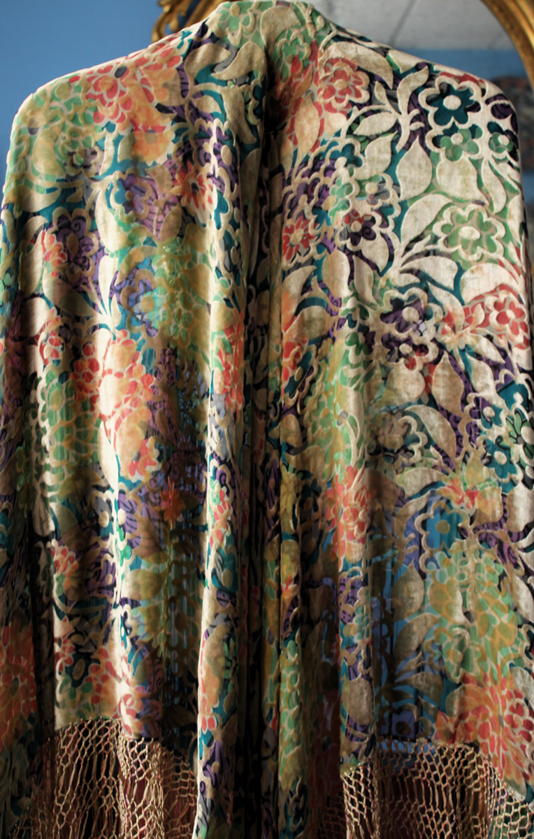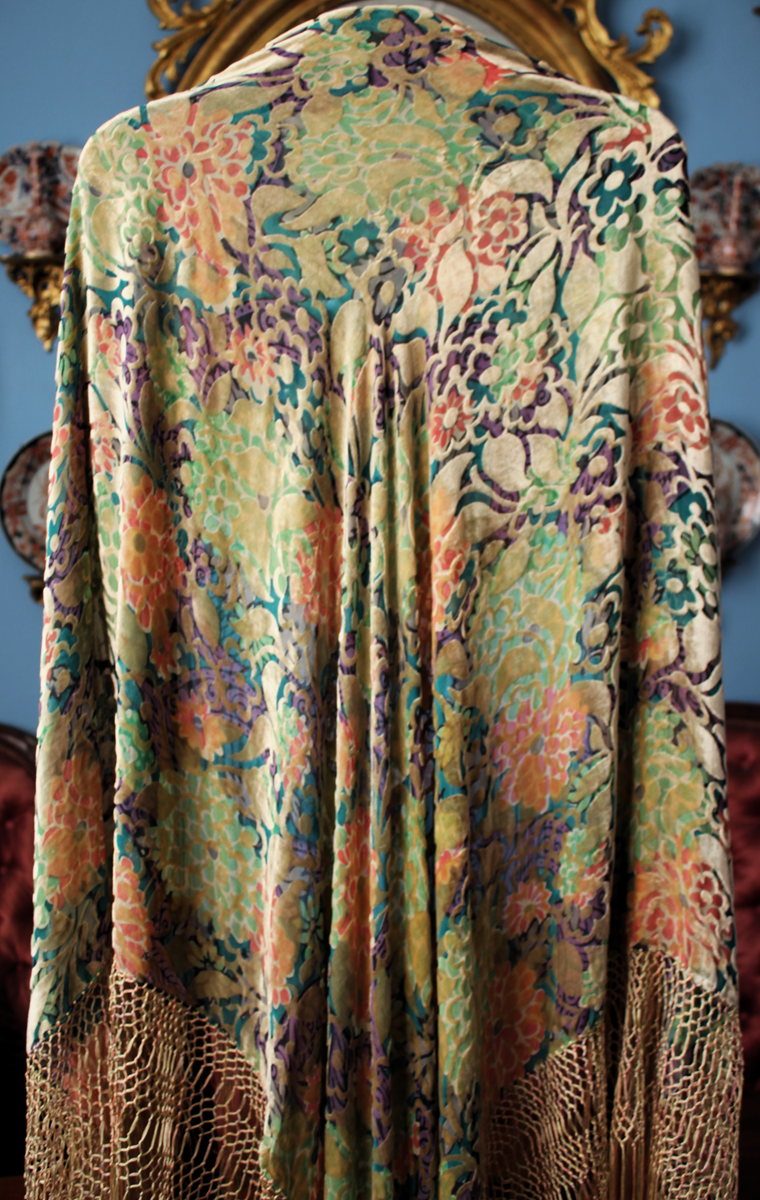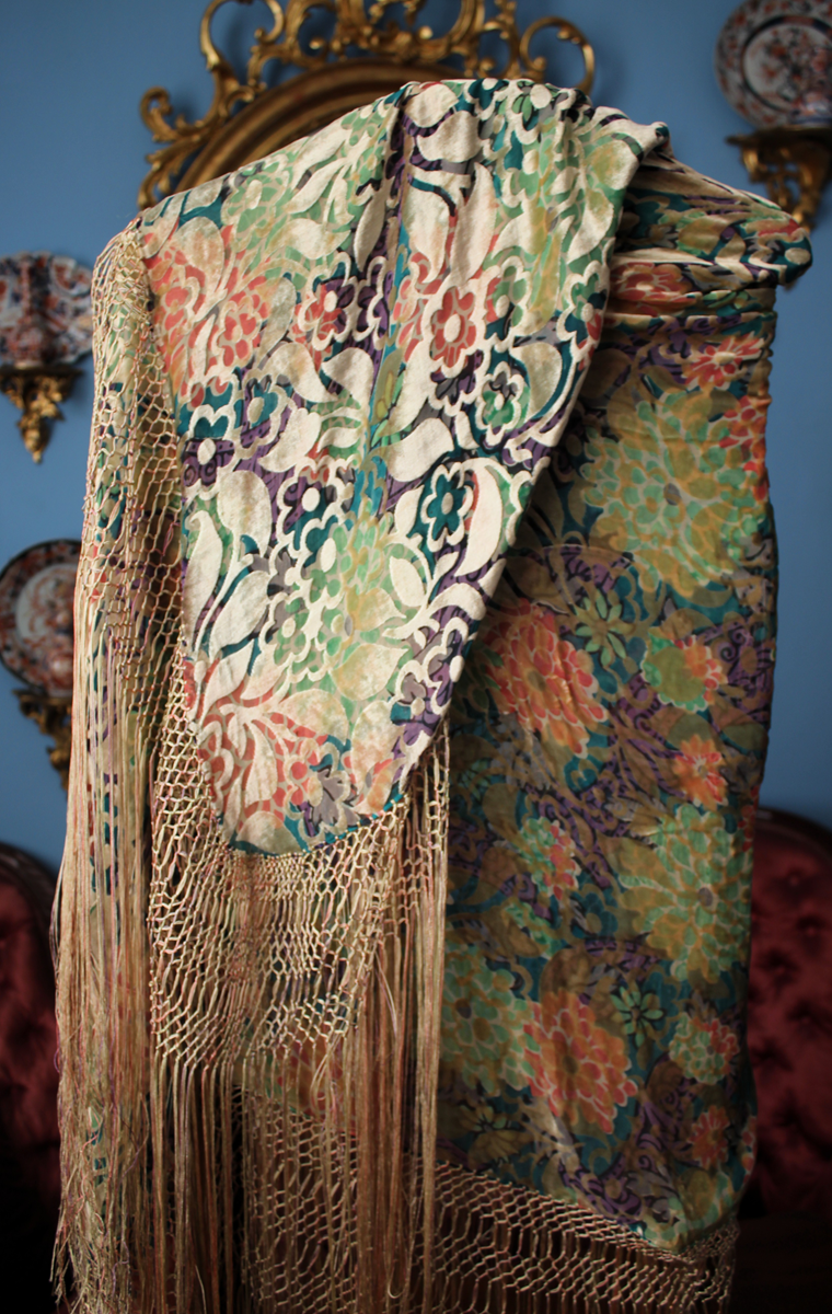 Mantón del primer tercio del Siglo XX (1920) , de época Art. Decó, en terciopelo de colores y seda en  color verde azulada semitransparente, con dibujo geométrico de flores, donde se entrecruzan las mismas, formando una composición  peculiar en colores que según la luz se alternan colores diferentes resultando un efecto visual armonioso y muy hermoso.