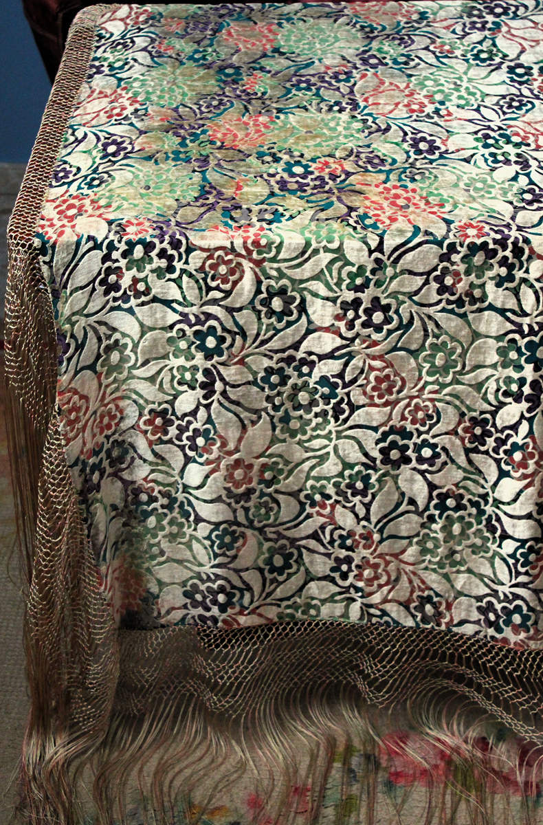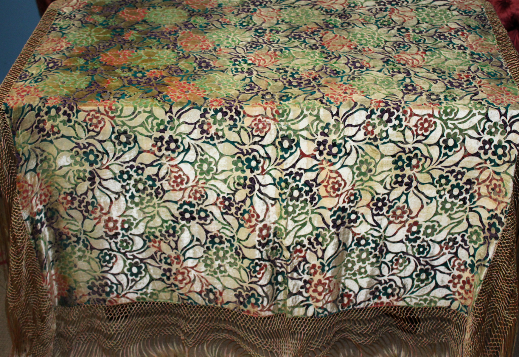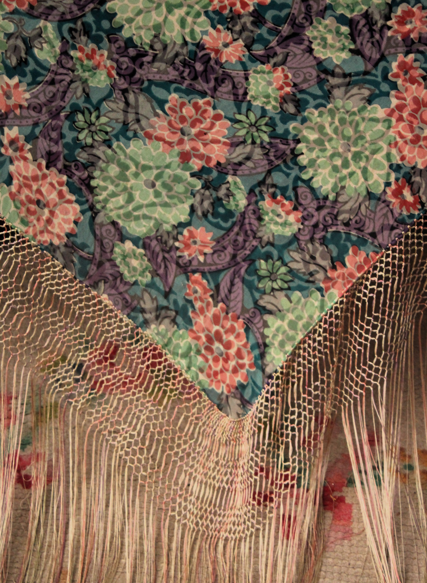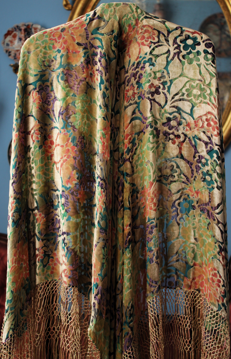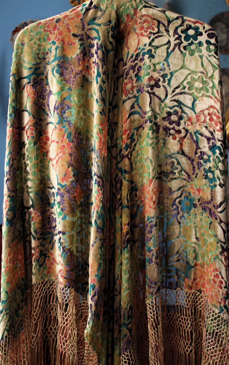 Mantón del primer tercio del Siglo XX (1920) , de época Art. Decó, en terciopelo de colores y seda en  color verde azulada semitransparente, con dibujo geométrico de flores, donde se entrecruzan las mismas, formando una composición  peculiar en colores que según la luz se alternan colores diferentes resultando un efecto visual armonioso y muy hermoso.