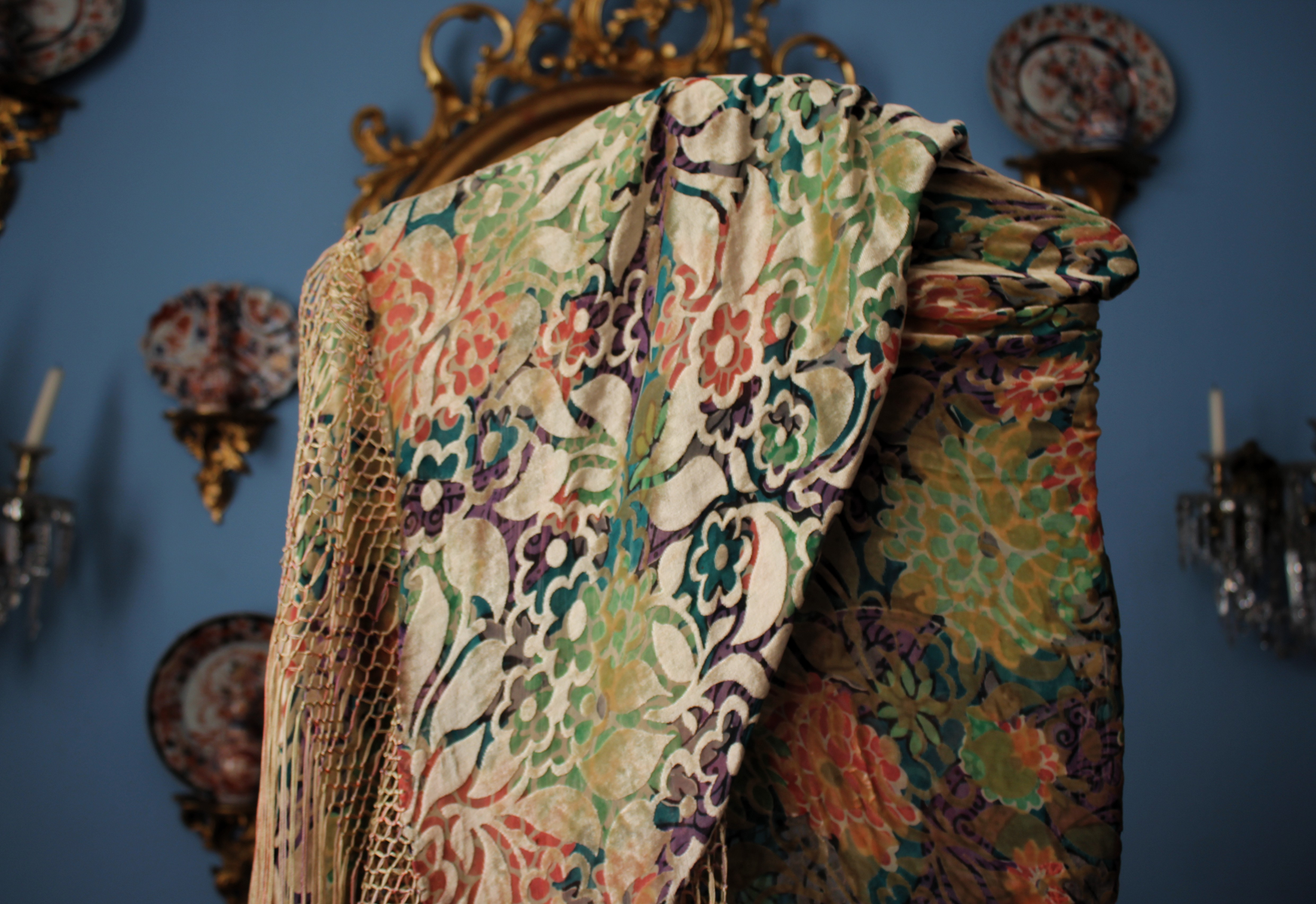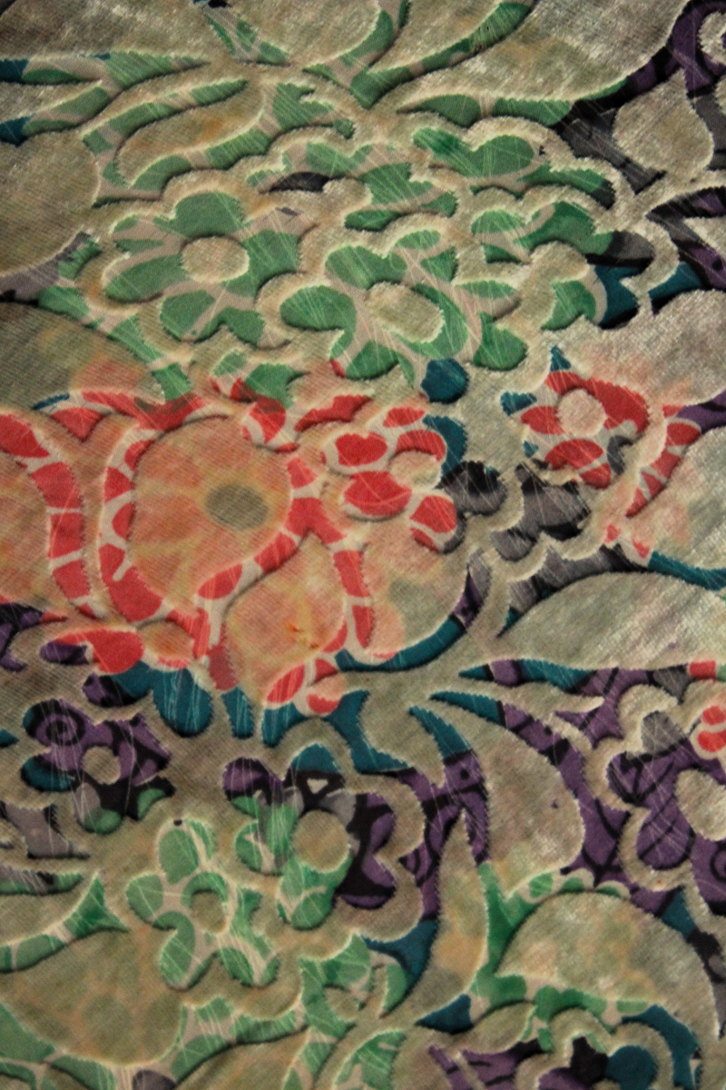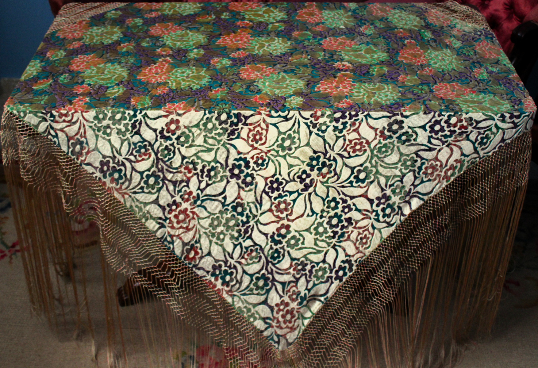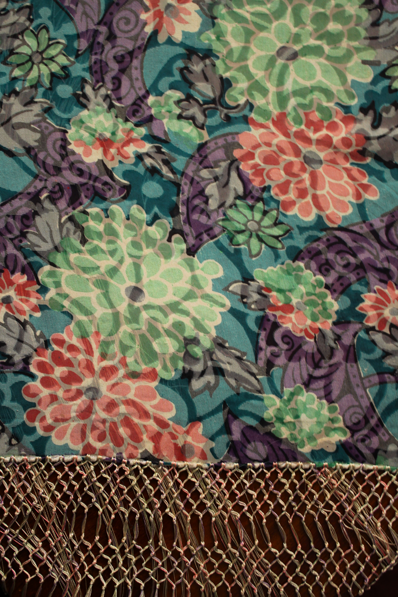 Mantón del primer tercio del Siglo XX (1920) , de época Art. Decó, en terciopelo de colores y seda en  color verde azulada semitransparente, con dibujo geométrico de flores, donde se entrecruzan las mismas, formando una composición  peculiar en colores que según la luz se alternan colores diferentes resultando un efecto visual armonioso y muy hermoso.