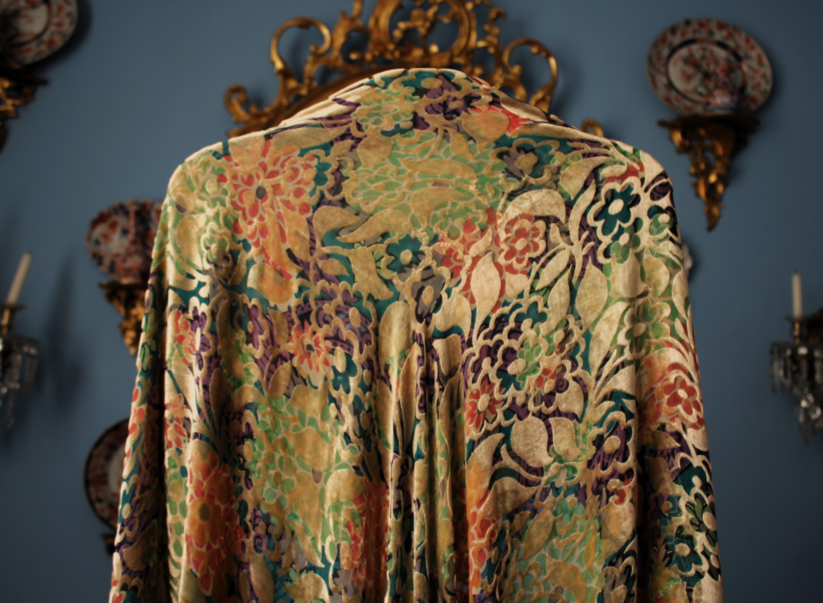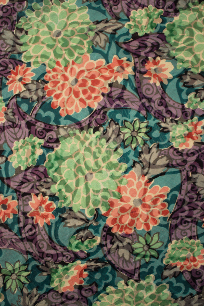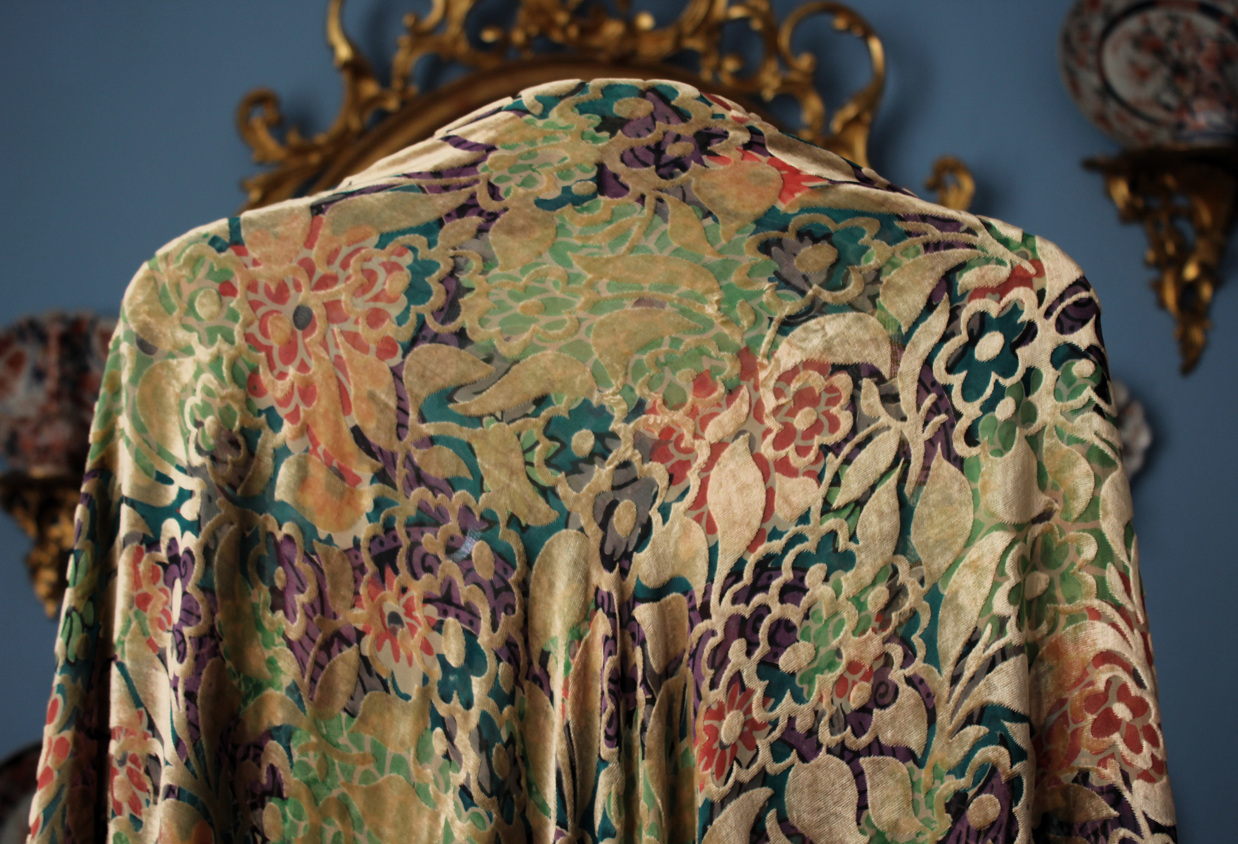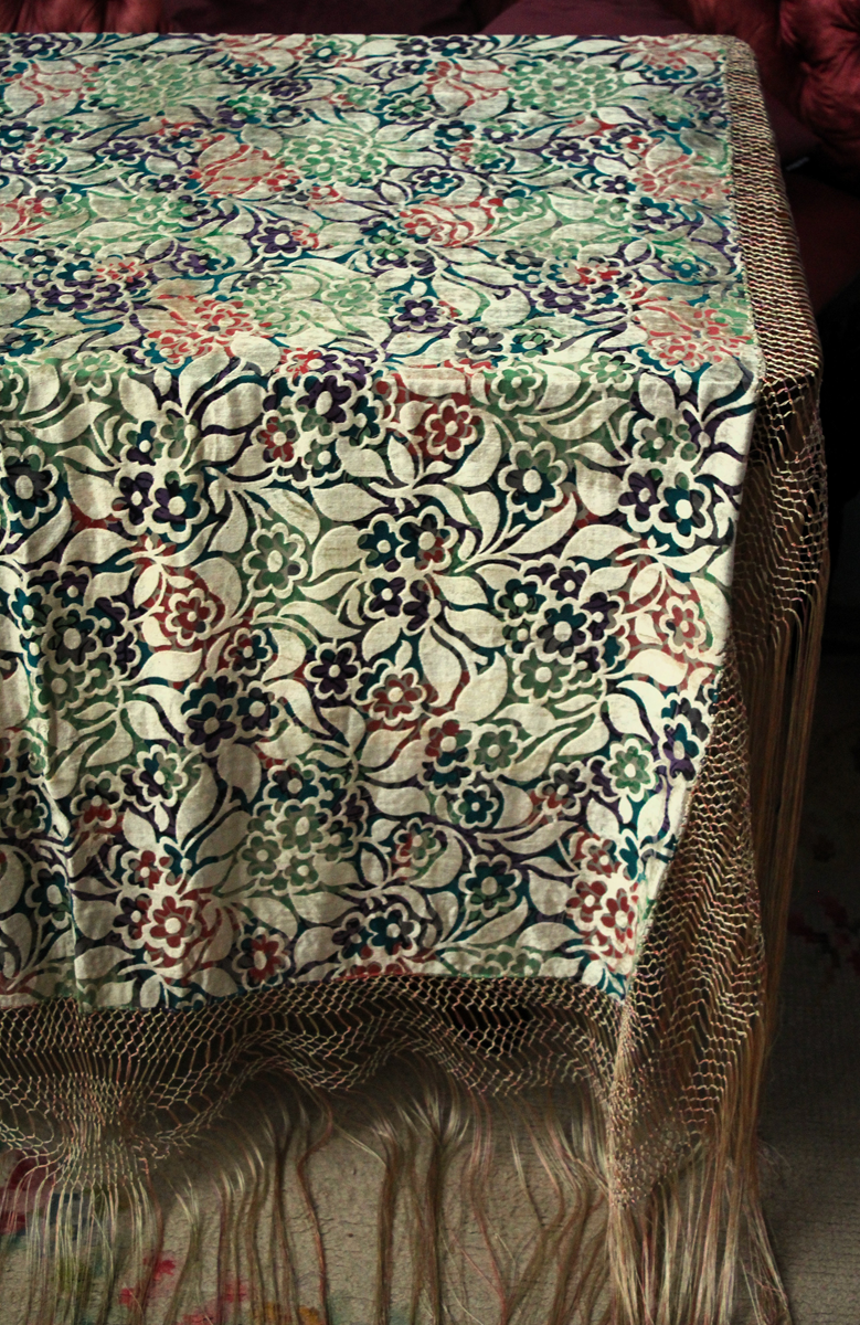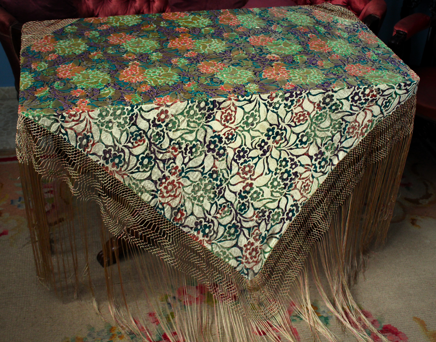 Mantón del primer tercio del Siglo XX (1920) , de época Art. Decó, en terciopelo de colores y seda en  color verde azulada semitransparente, con dibujo geométrico de flores, donde se entrecruzan las mismas, formando una composición  peculiar en colores que según la luz se alternan colores diferentes resultando un efecto visual armonioso y muy hermoso.