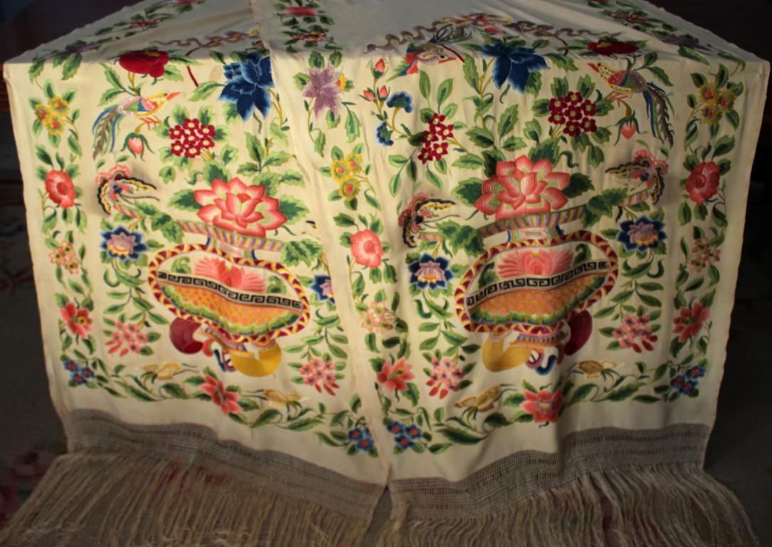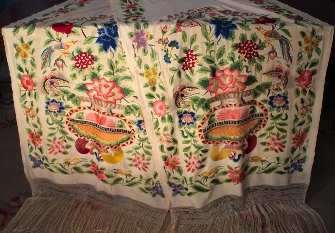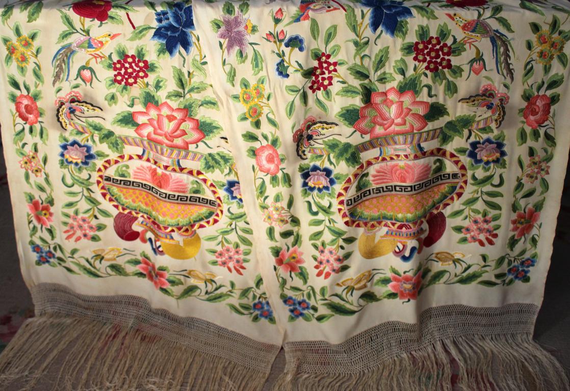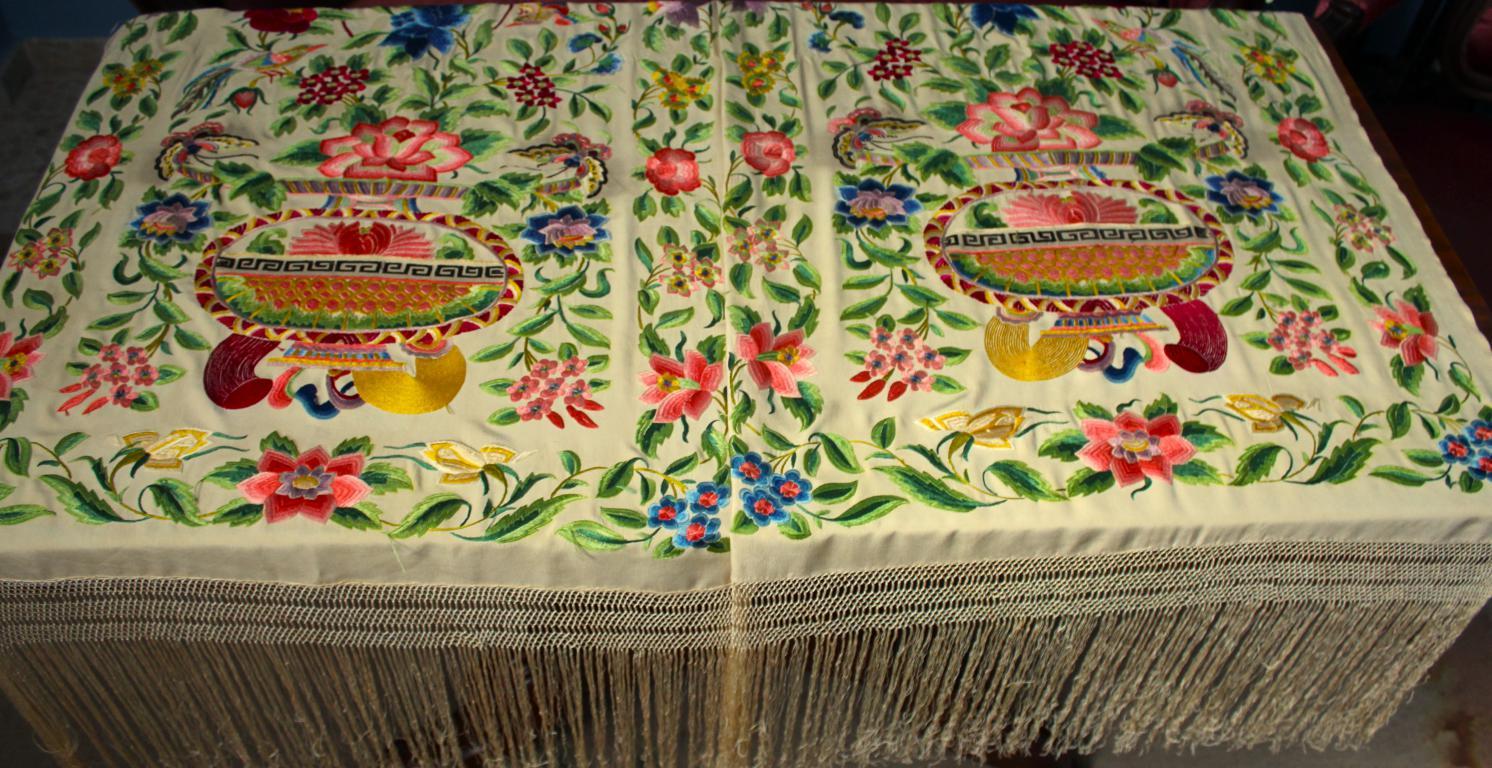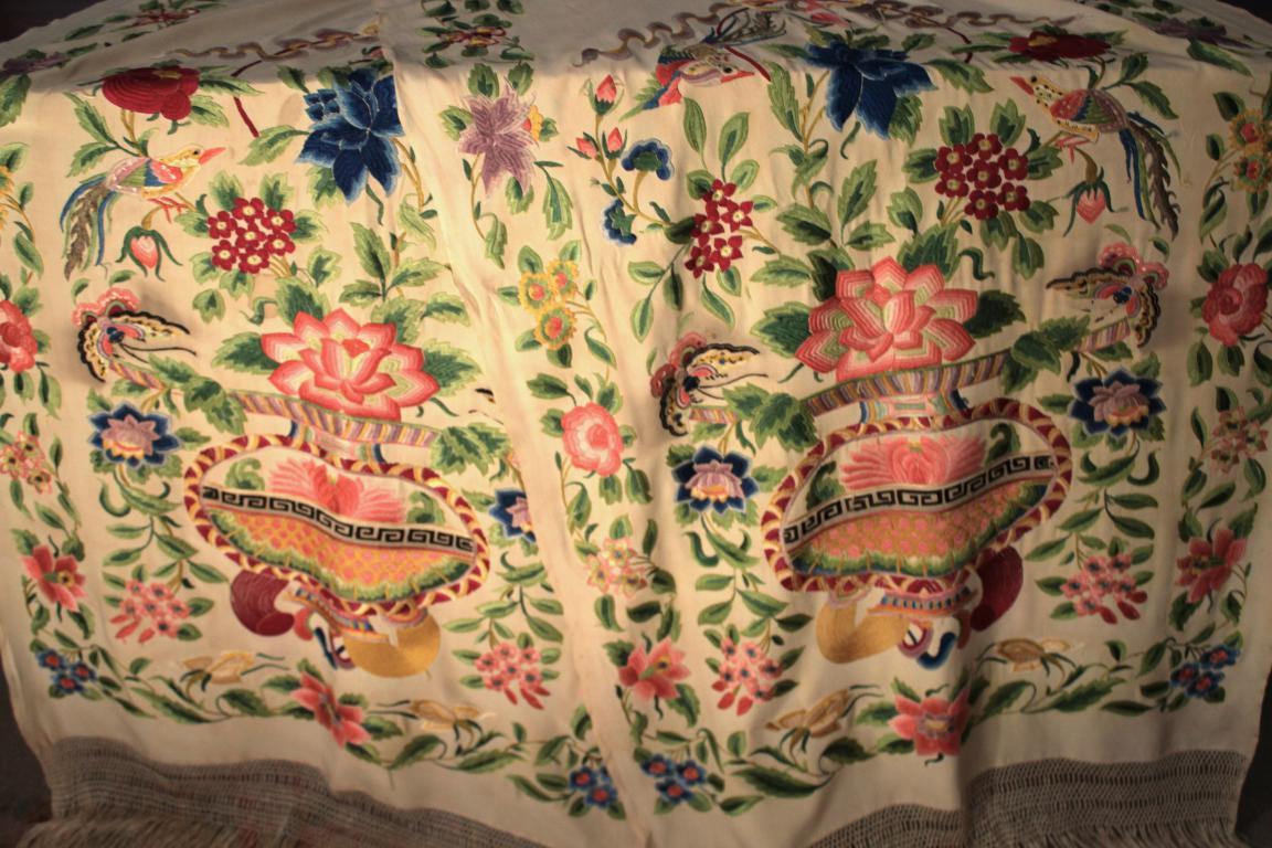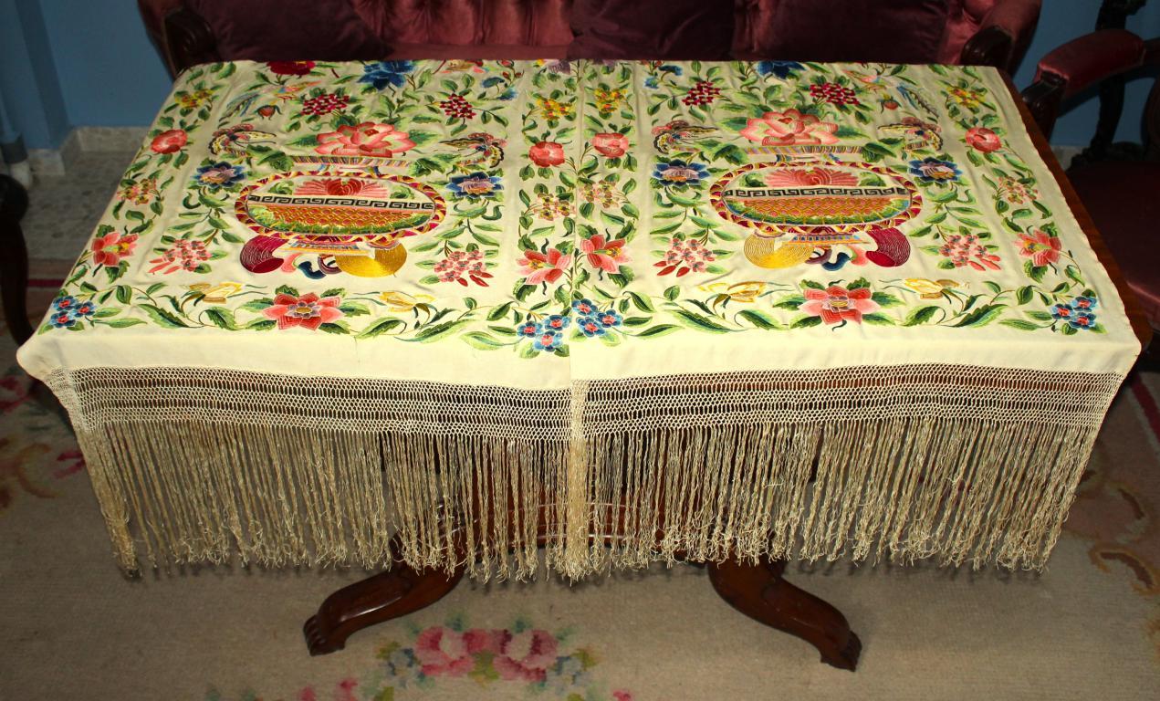 Mantón-Chal de Manila Imperio, Cantonés (China), muy antiguo del ultimo tercio del Siglo XIX, bordado en una magnifica seda fría realizada en telar, de un color beige-amarilla clara.