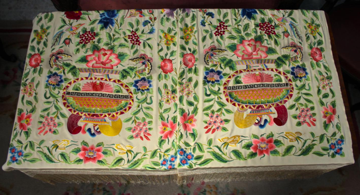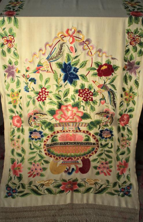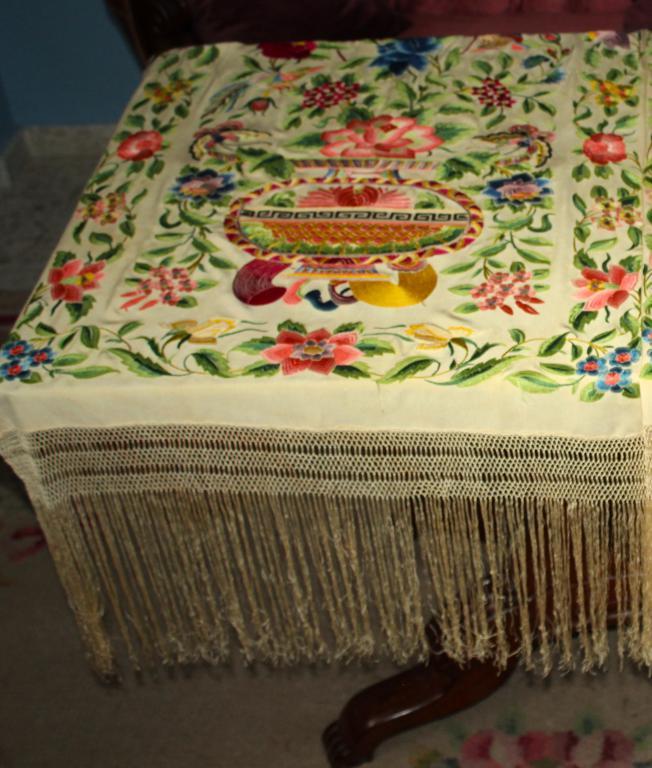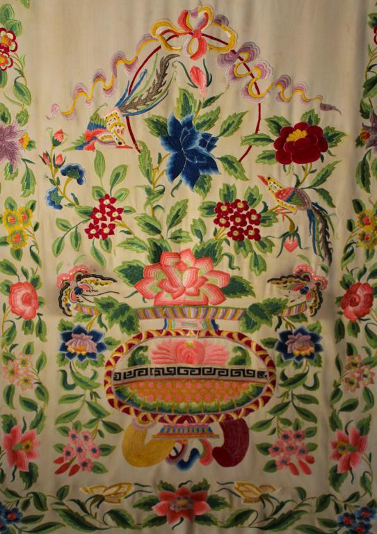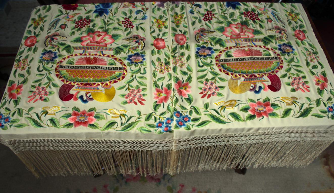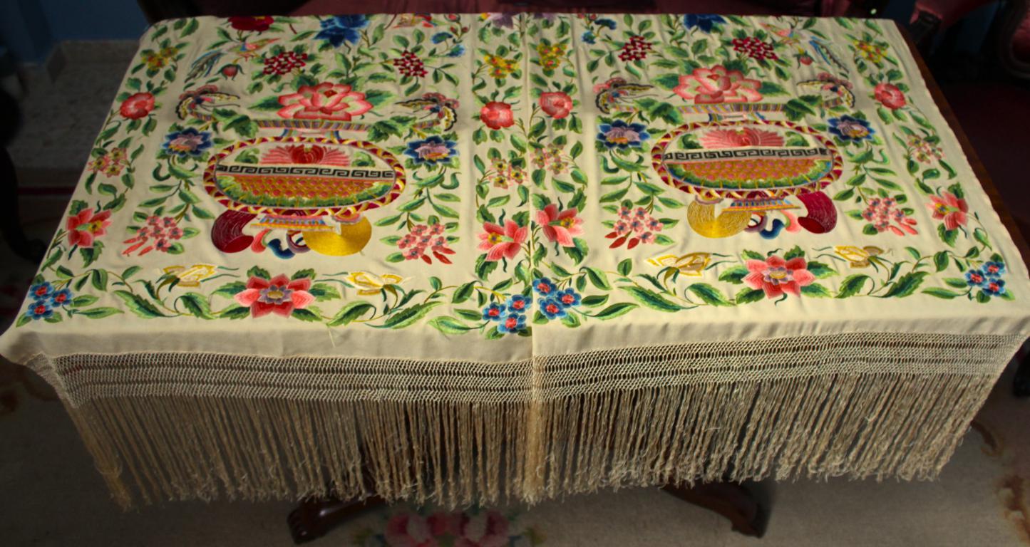 Mantón-Chal de Manila Imperio, Cantonés (China), muy antiguo del ultimo tercio del Siglo XIX, bordado en una magnifica seda fría realizada en telar, de un color beige-amarilla clara.