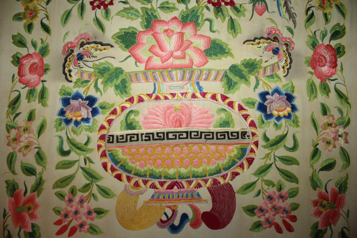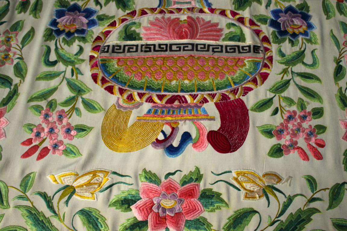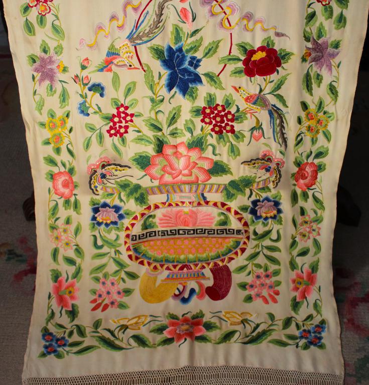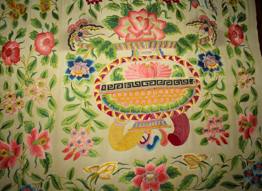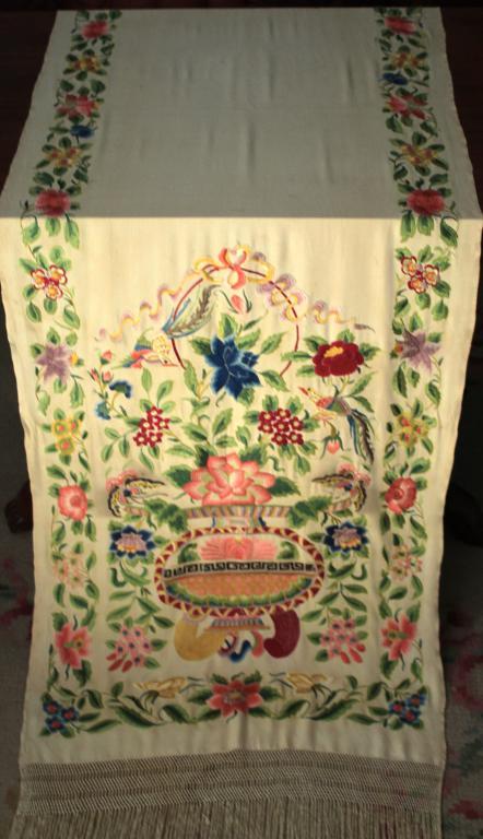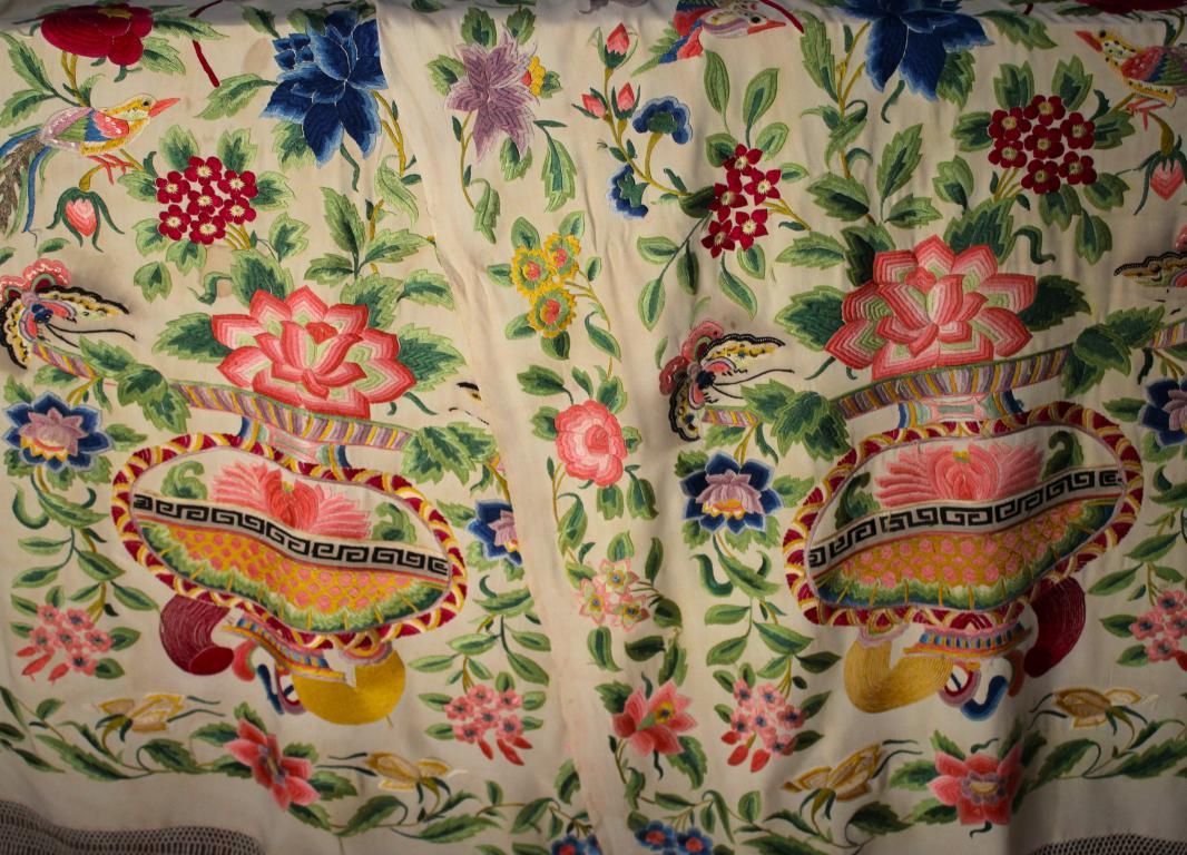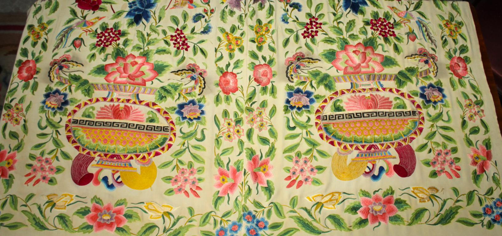 Mantón-Chal de Manila Imperio, Cantonés (China), muy antiguo del ultimo tercio del Siglo XIX, bordado en una magnifica seda fría realizada en telar, de un color beige-amarilla clara.