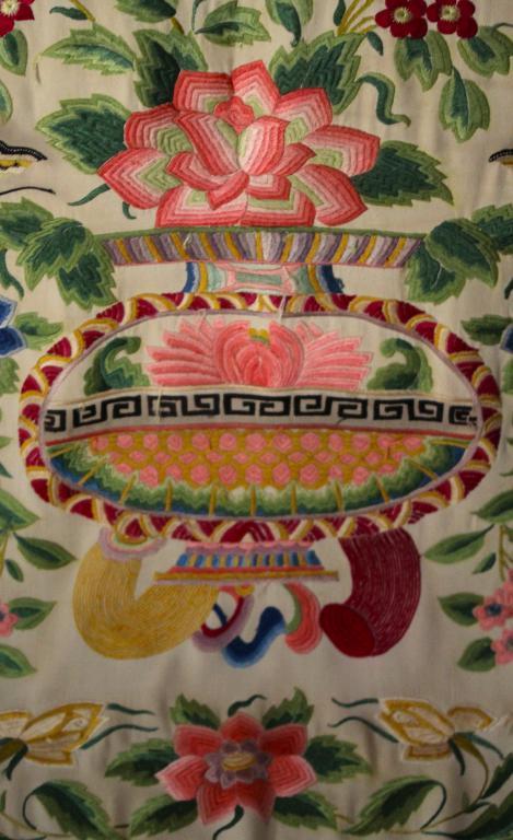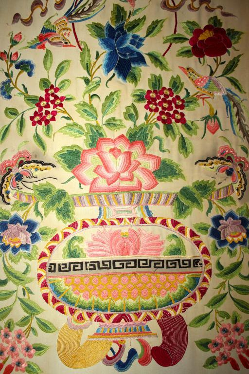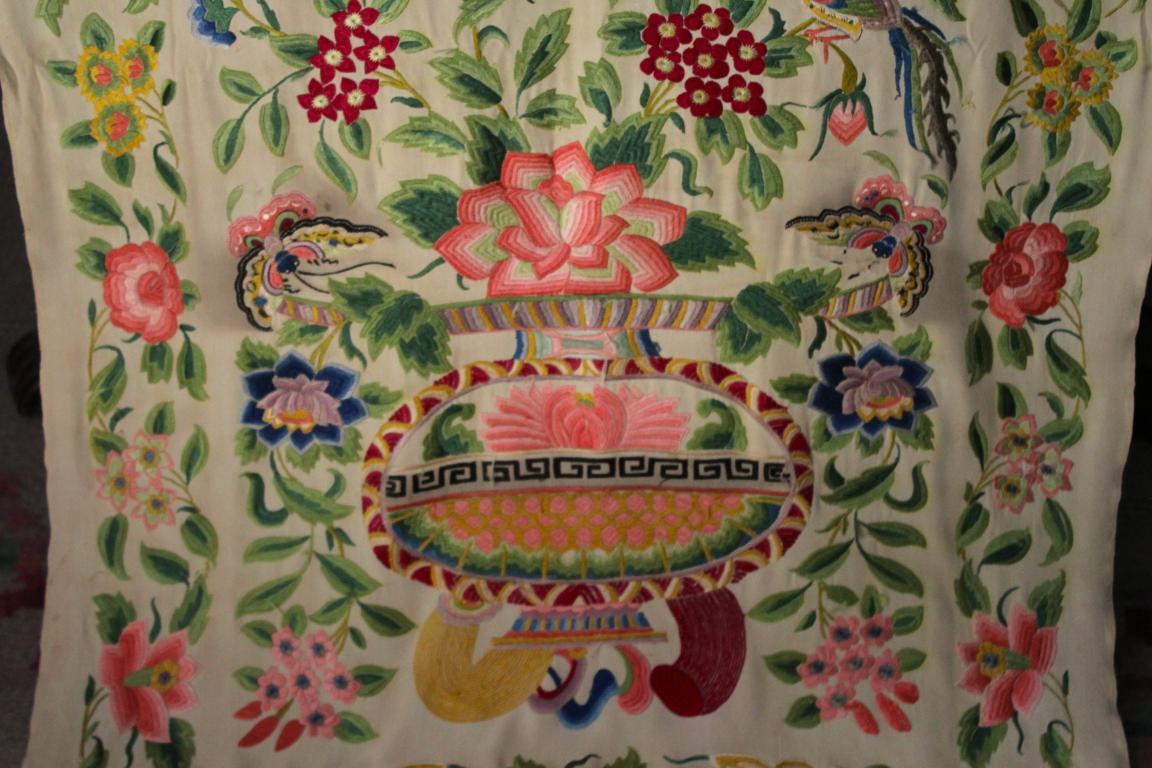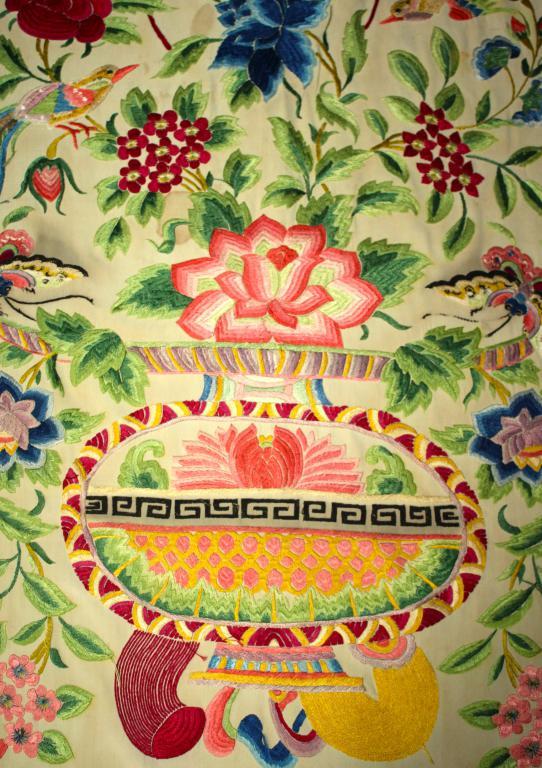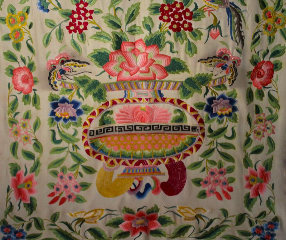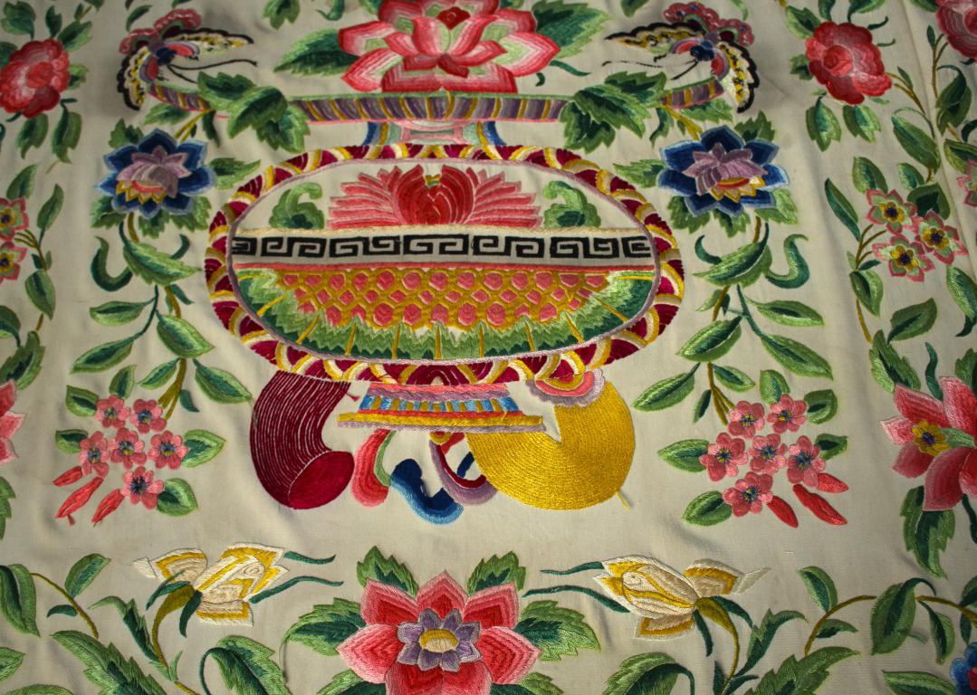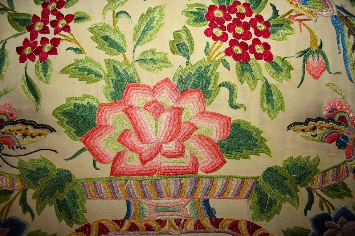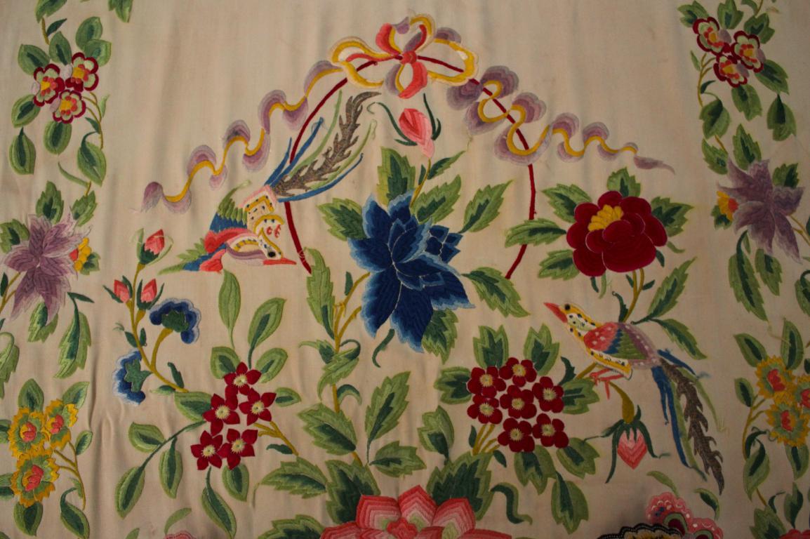 Mantón-Chal de Manila Imperio, Cantonés (China), muy antiguo del ultimo tercio del Siglo XIX, bordado en una magnifica seda fría realizada en telar, de un color beige-amarilla clara.