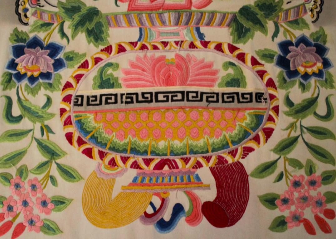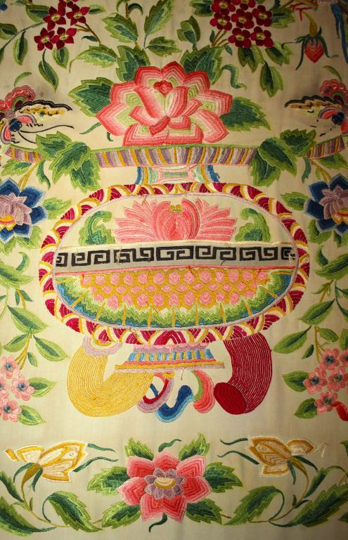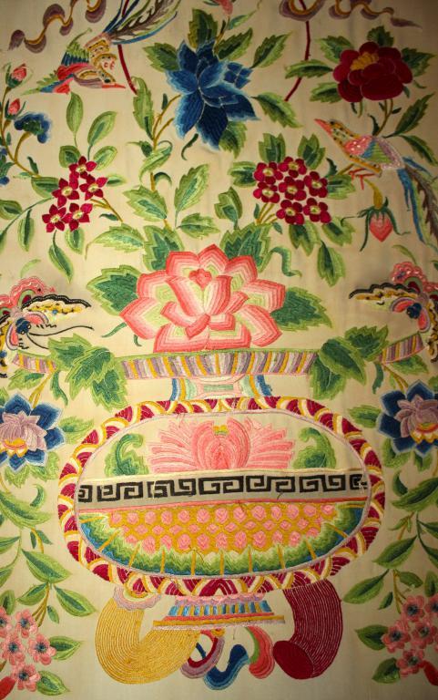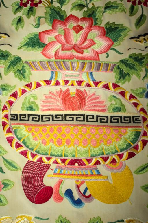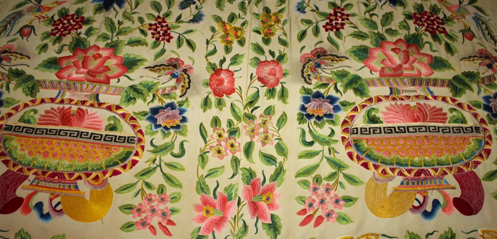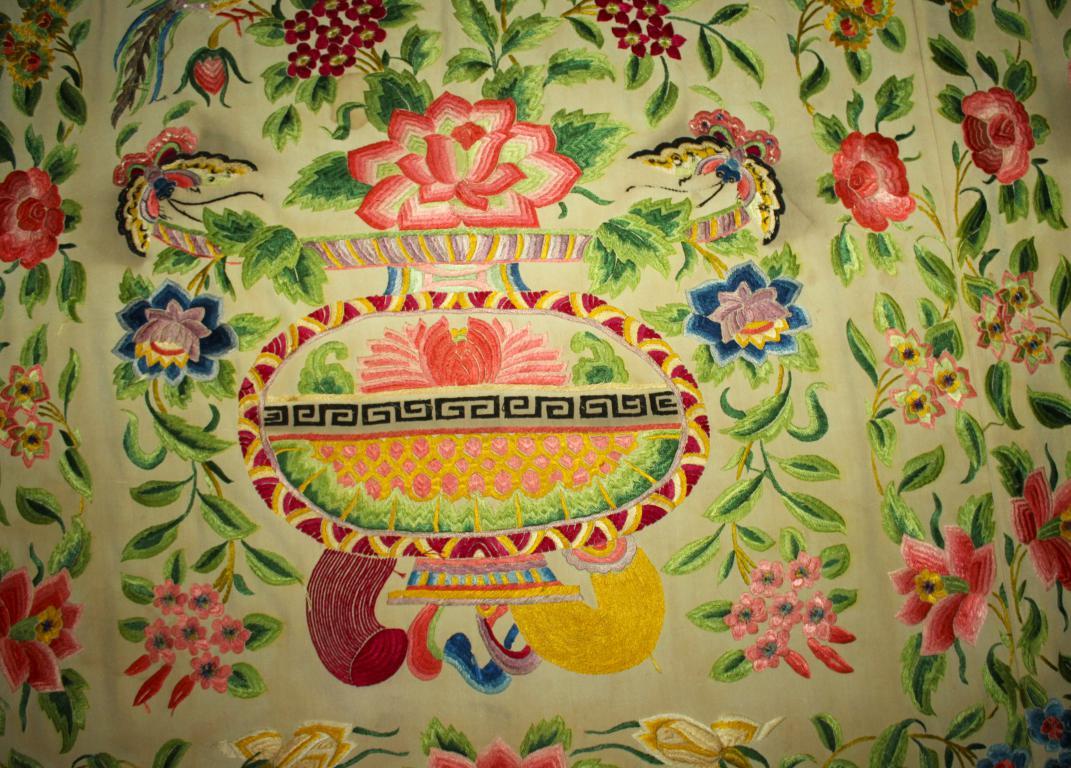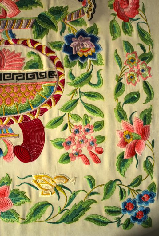 Una amplia cenefa de flores y hojas recorre todo el chal, teniendo en cxa una de las esquinas un magnifico bordado de una ceta con flores, hojas, mariposas, lazos, grecas, de colores vibrantes, donde destacan los verdes, los rosas, los azules, los amarillos etc, que hace que el bordado destaque sobre el fondo de la seda, destacando un refinado diseño de flores y hojas en su cesto. Se encuentra en muy buen estado de conservación.
