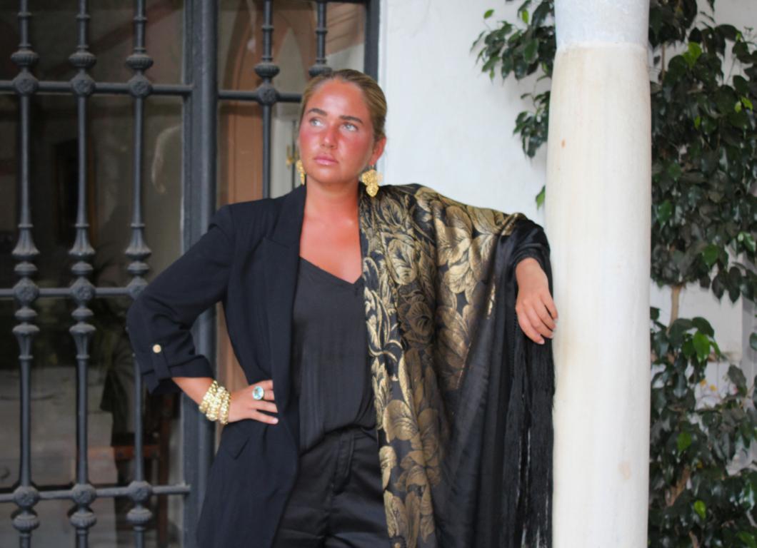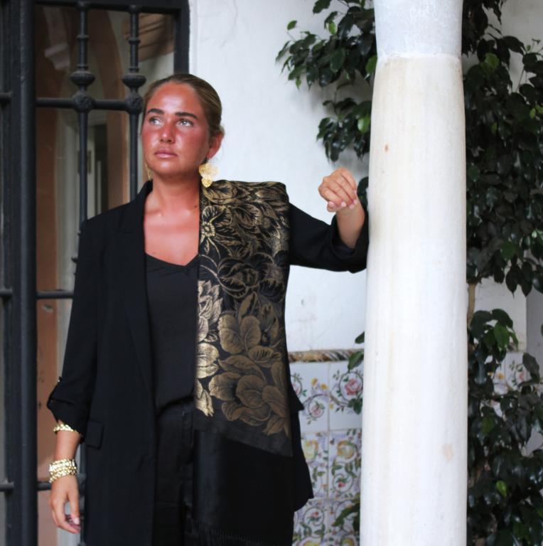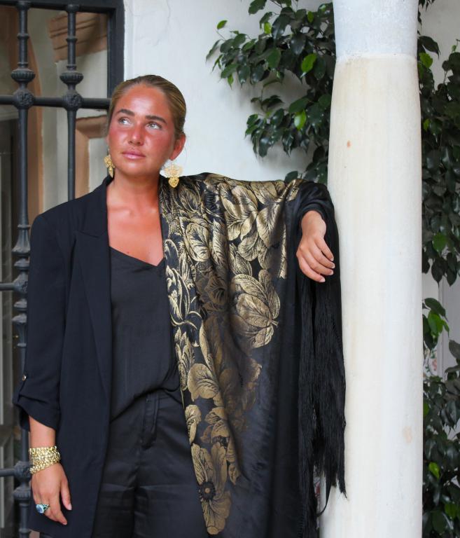 Espectacular mantón/chal Art Decó de los años 20 (1925) de lame dorado en finísima seda color negro con hilos dorados.  Con diseño geométrico de flores y hojas, estando la seda y el lame (laminas) en perfecto estado de conservación, sin que el paso de los años hubiese oscurecidos el dorado.