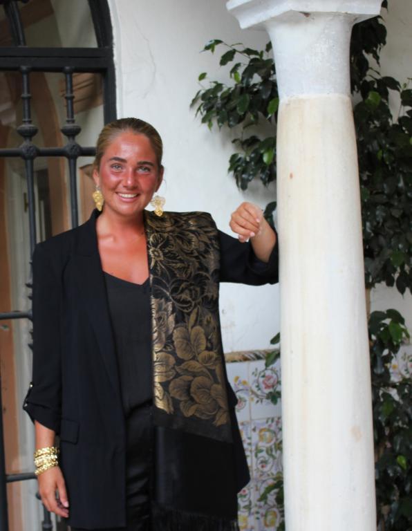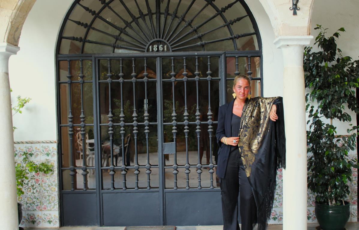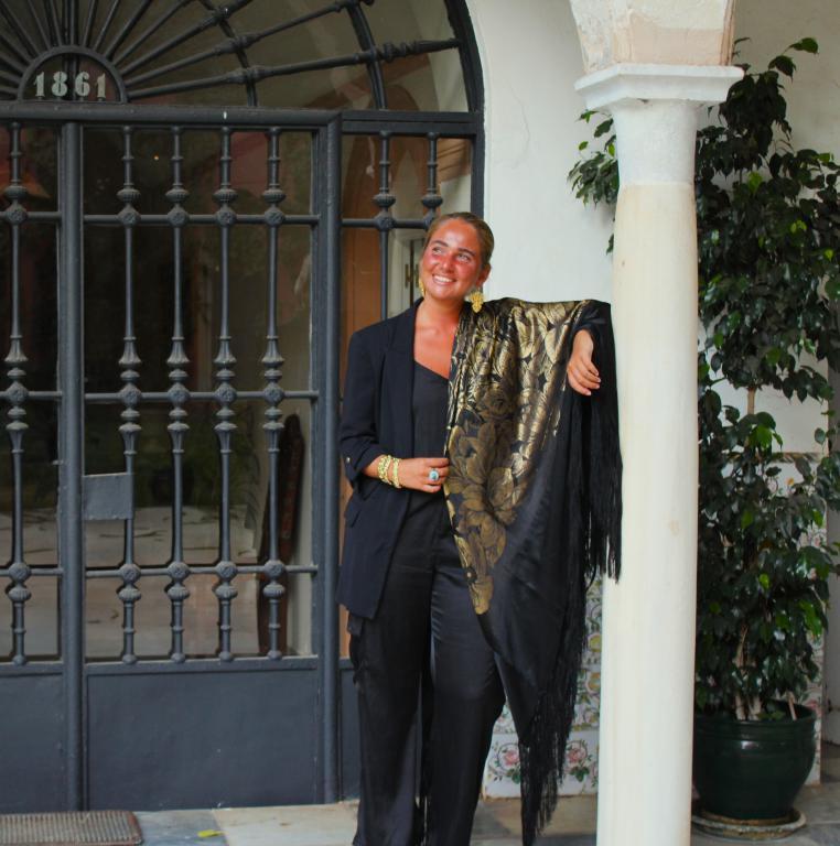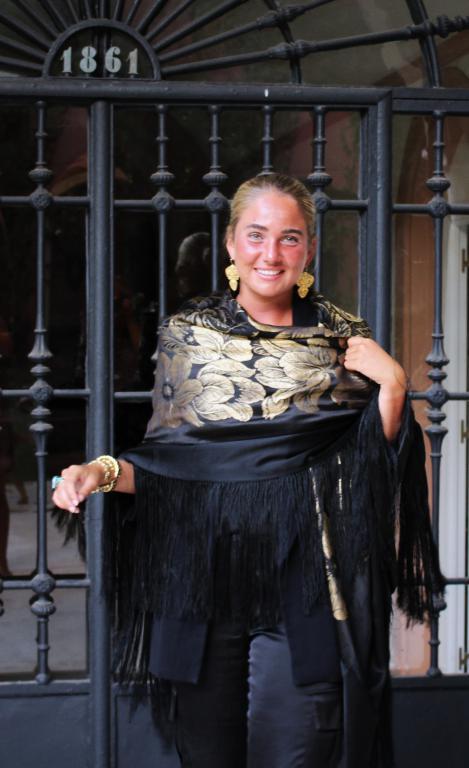 El chal es cuadrado, y  tiene flecos  anudados a mano por todo su contorno, con hilos de seda de color negro, todo de época. Su estado de conservación es excelente.