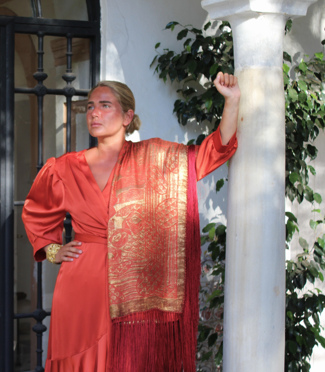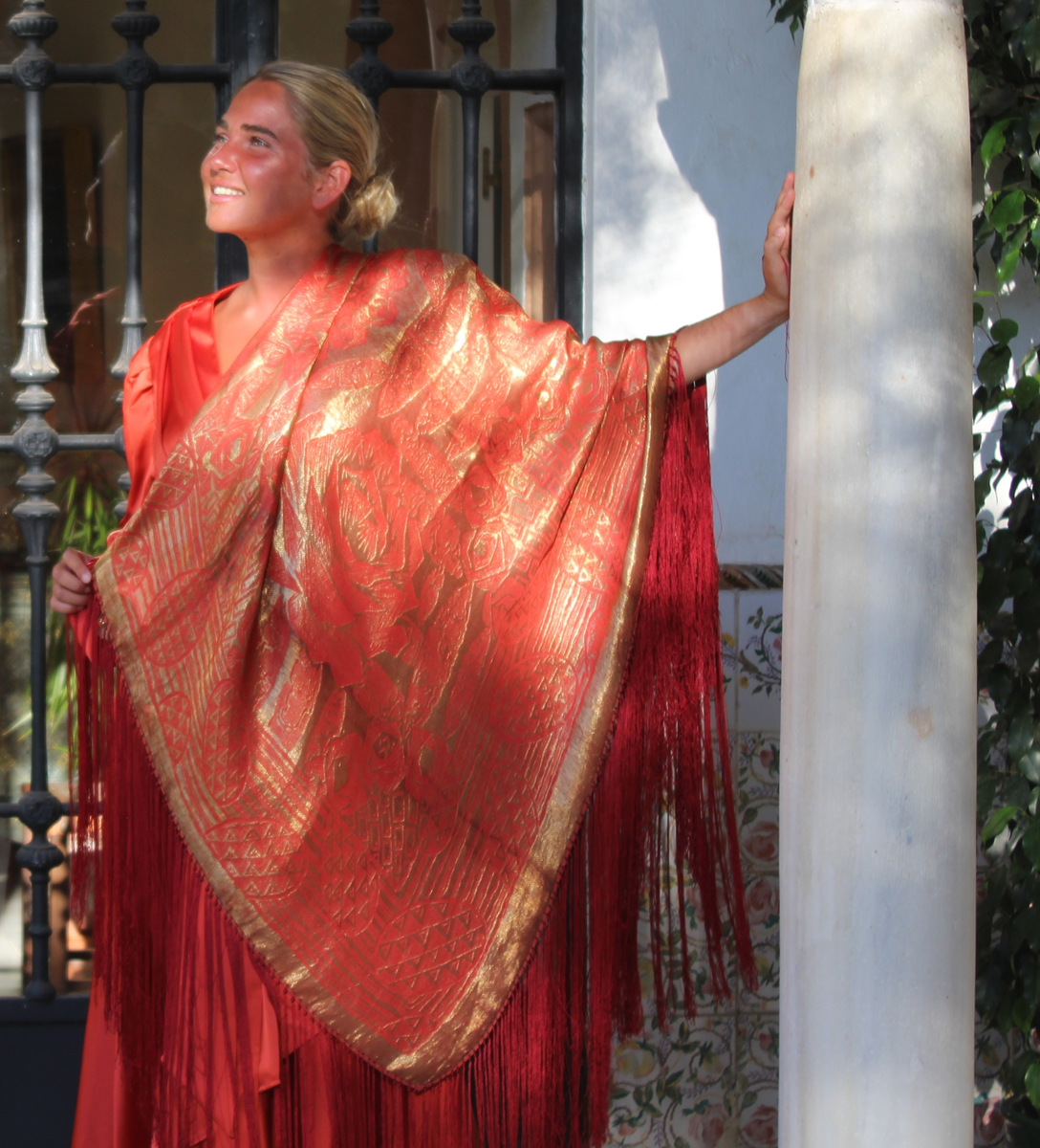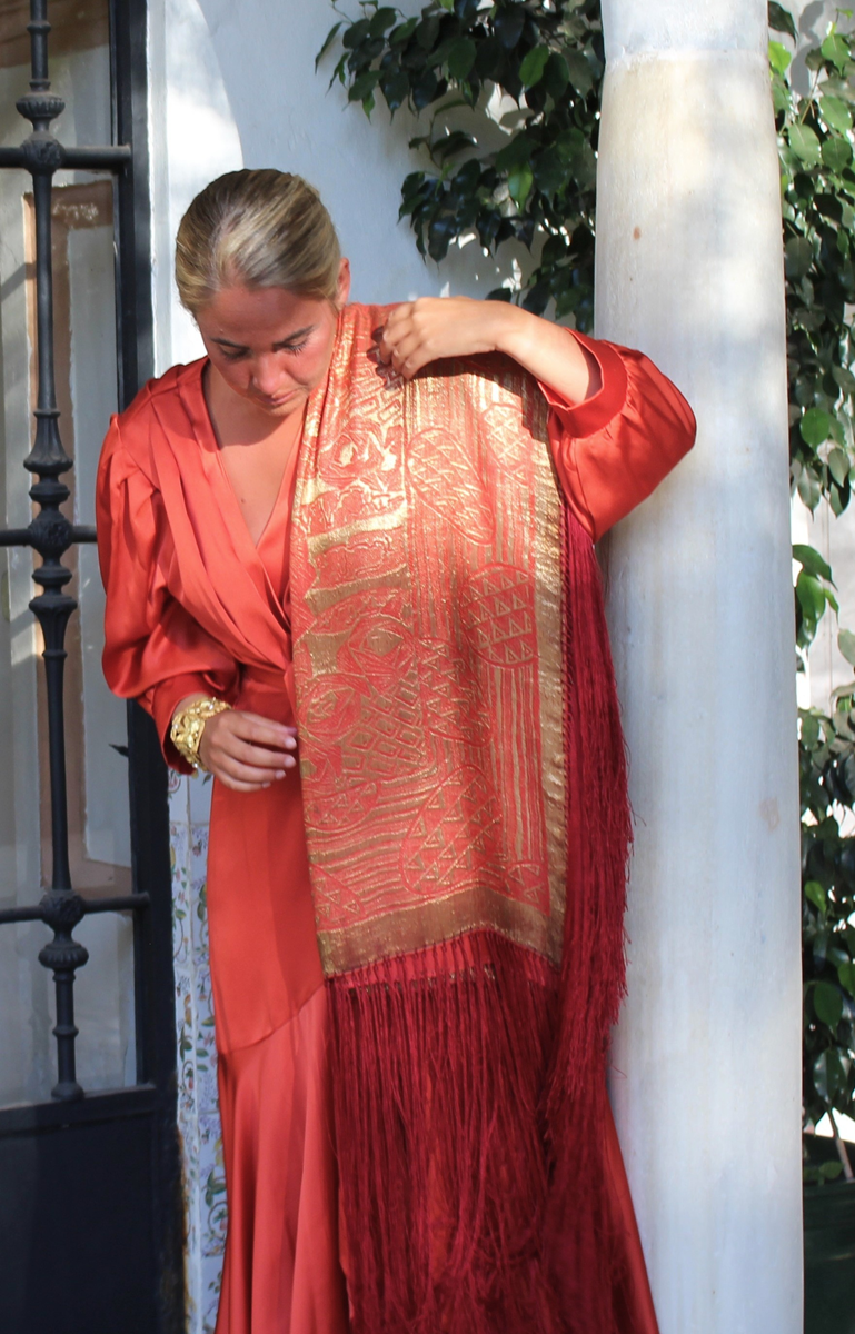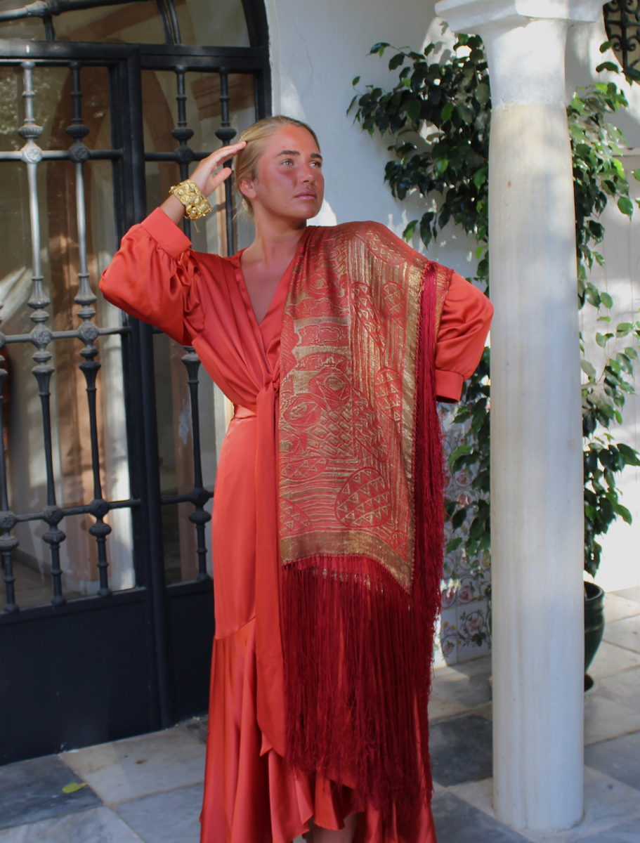 Espectacular Mantón/Chal Art Deco de los años 20 (1925) de lame dorado en finísima seda color naranja caldera. Con diseño geométricos, estando la seda y el lame (laminas) en perfecto estado de conservación, sin que el paso de los años hubiese oscurecidos el dorado.
