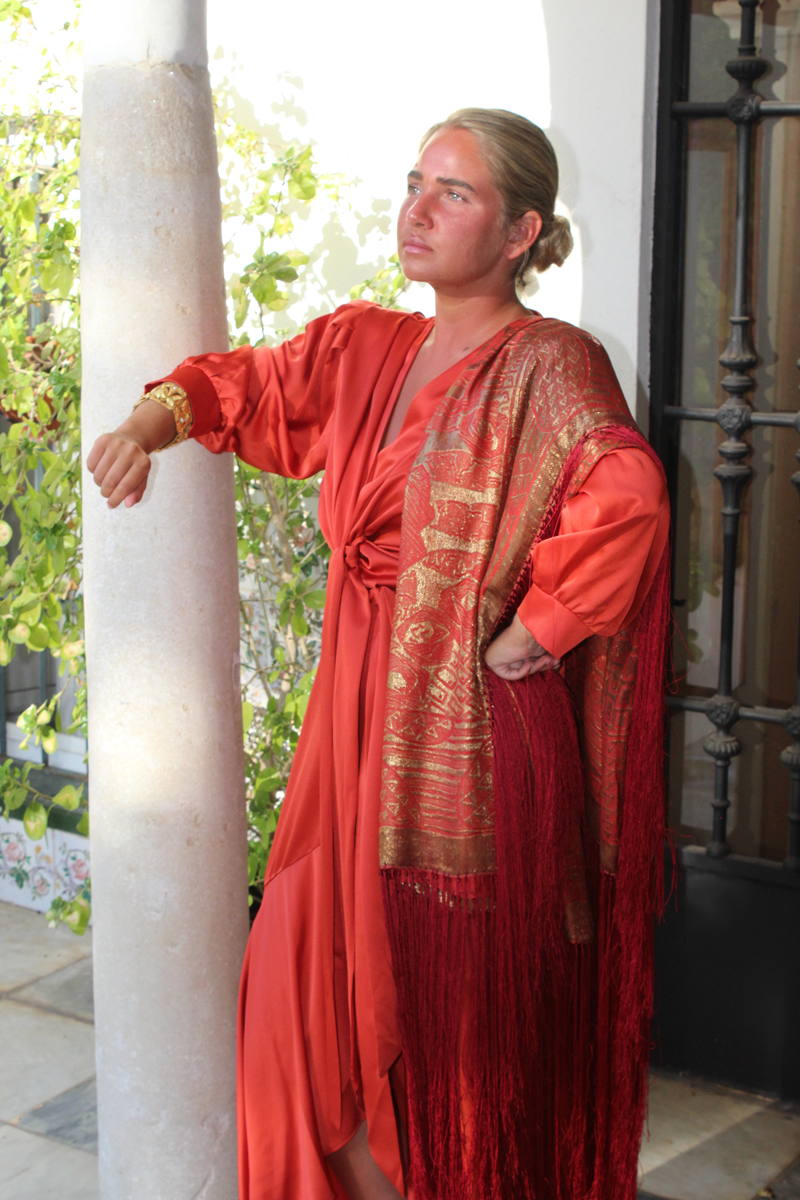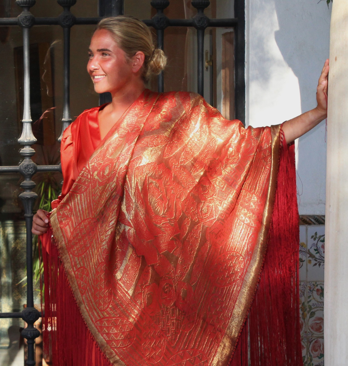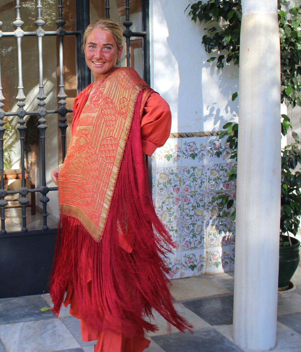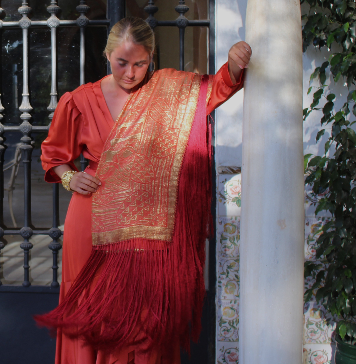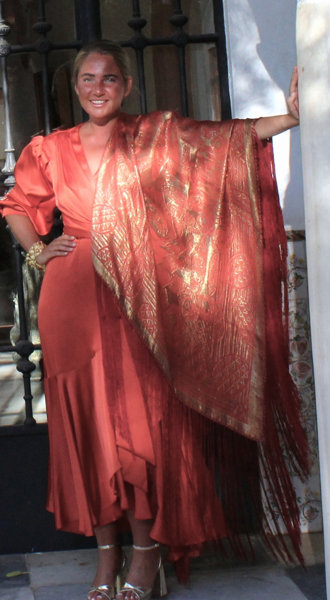 Espectacular Mantón/Chal Art Deco de los años 20 (1925) de lame dorado en finísima seda color naranja caldera. Con diseño geométricos, estando la seda y el lame (laminas) en perfecto estado de conservación, sin que el paso de los años hubiese oscurecidos el dorado.
