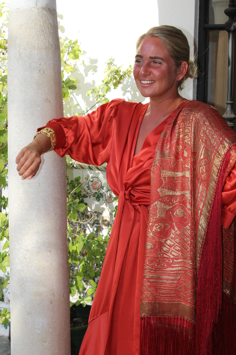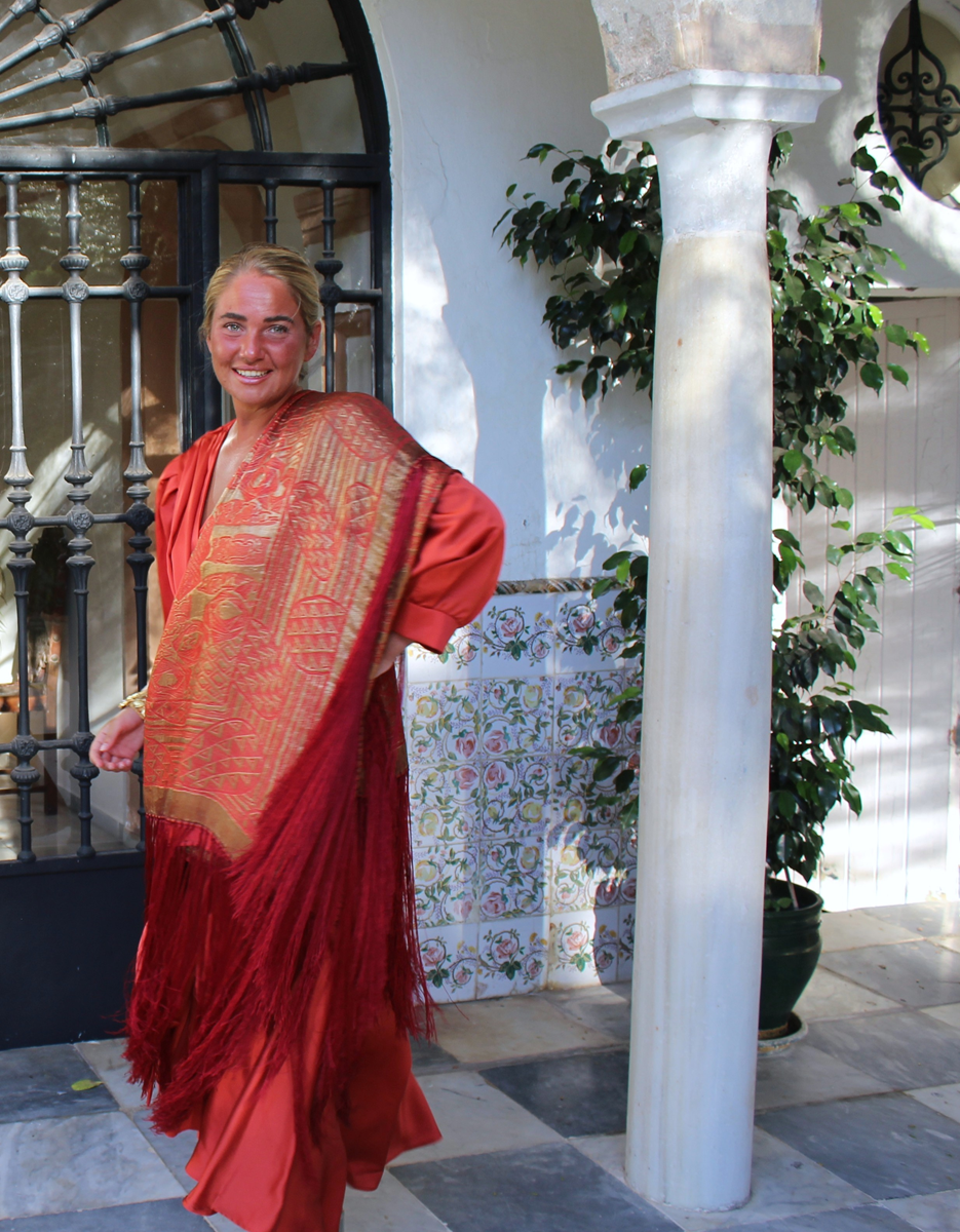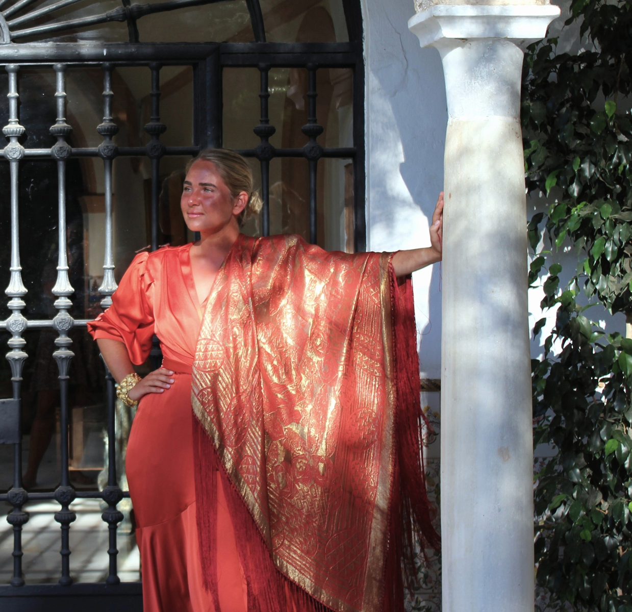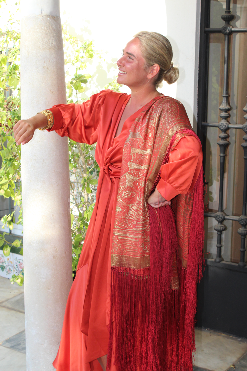 Espectacular Mantón/Chal Art Deco de los años 20 (1925) de lame dorado en finísima seda color naranja caldera. Con diseño geométricos, estando la seda y el lame (laminas) en perfecto estado de conservación, sin que el paso de los años hubiese oscurecidos el dorado.