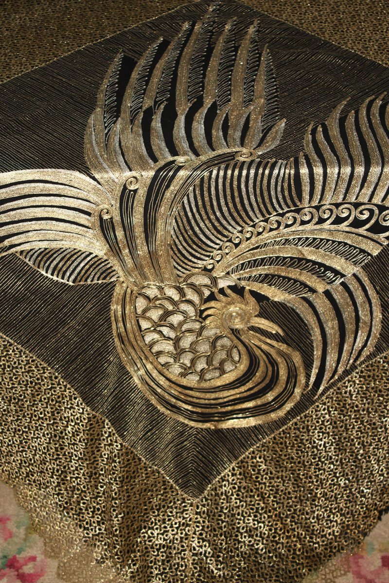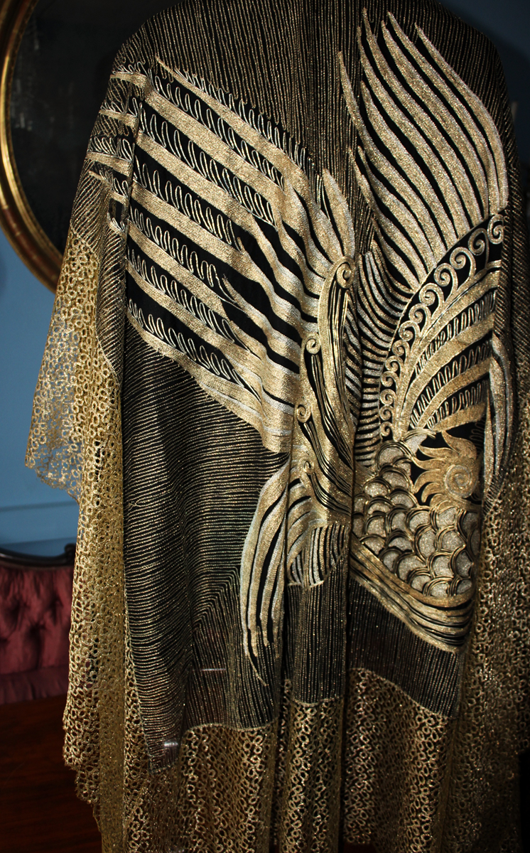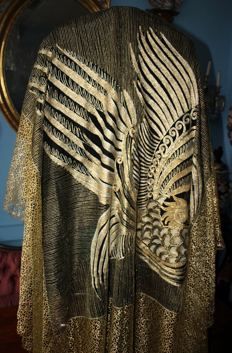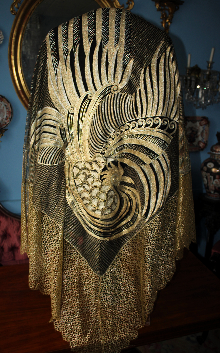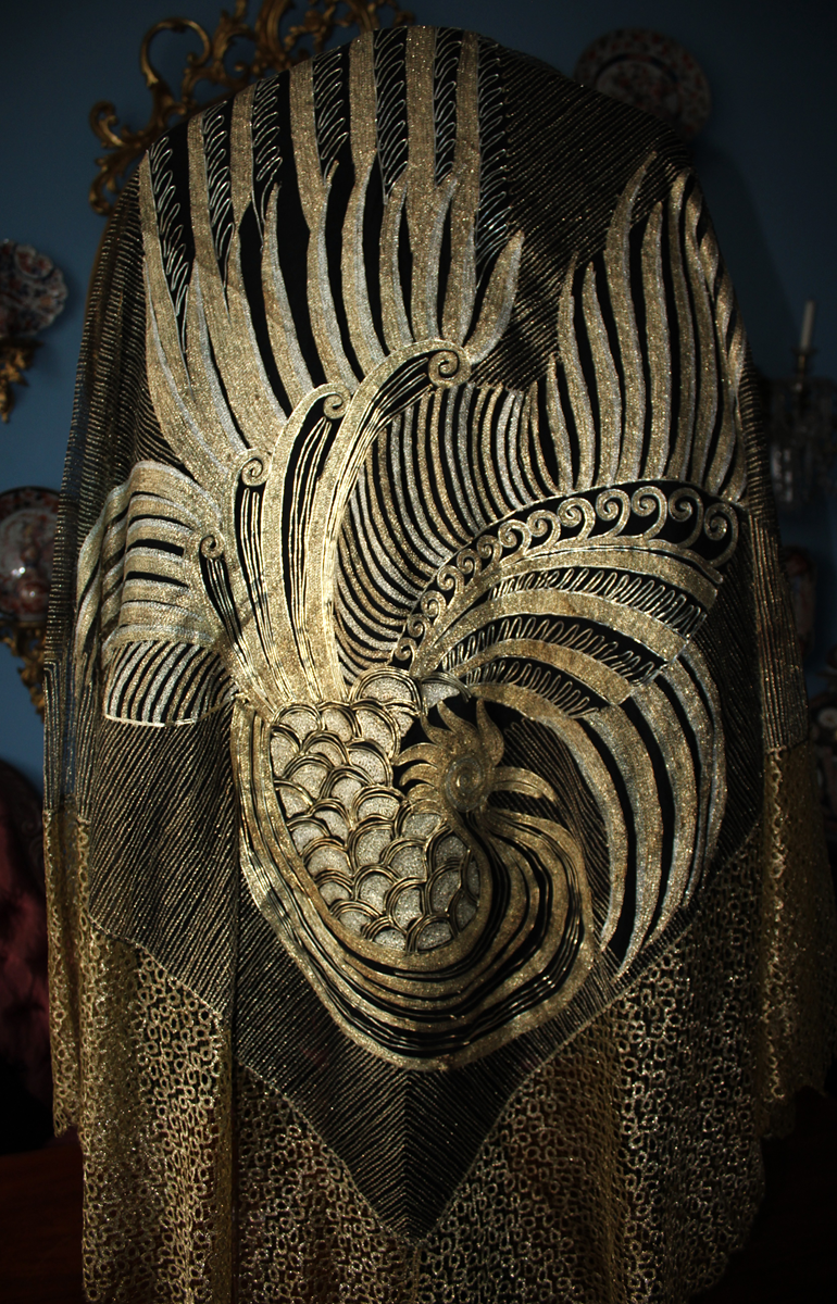 Rarísimo mantón o Chal antiguo Chino, bordado en laminas e hilos de oro y plata, de principios del Siglo XX, con motivos bordado de un Ave Fénix , con plumas, cresta, alas, volutas, etc. El ave fénix en la cultura china, conocida como Feng Huang, que representa la virtud, la gracias, la unión del Yin y el Yang, y el poder femenino de la emperatriz..