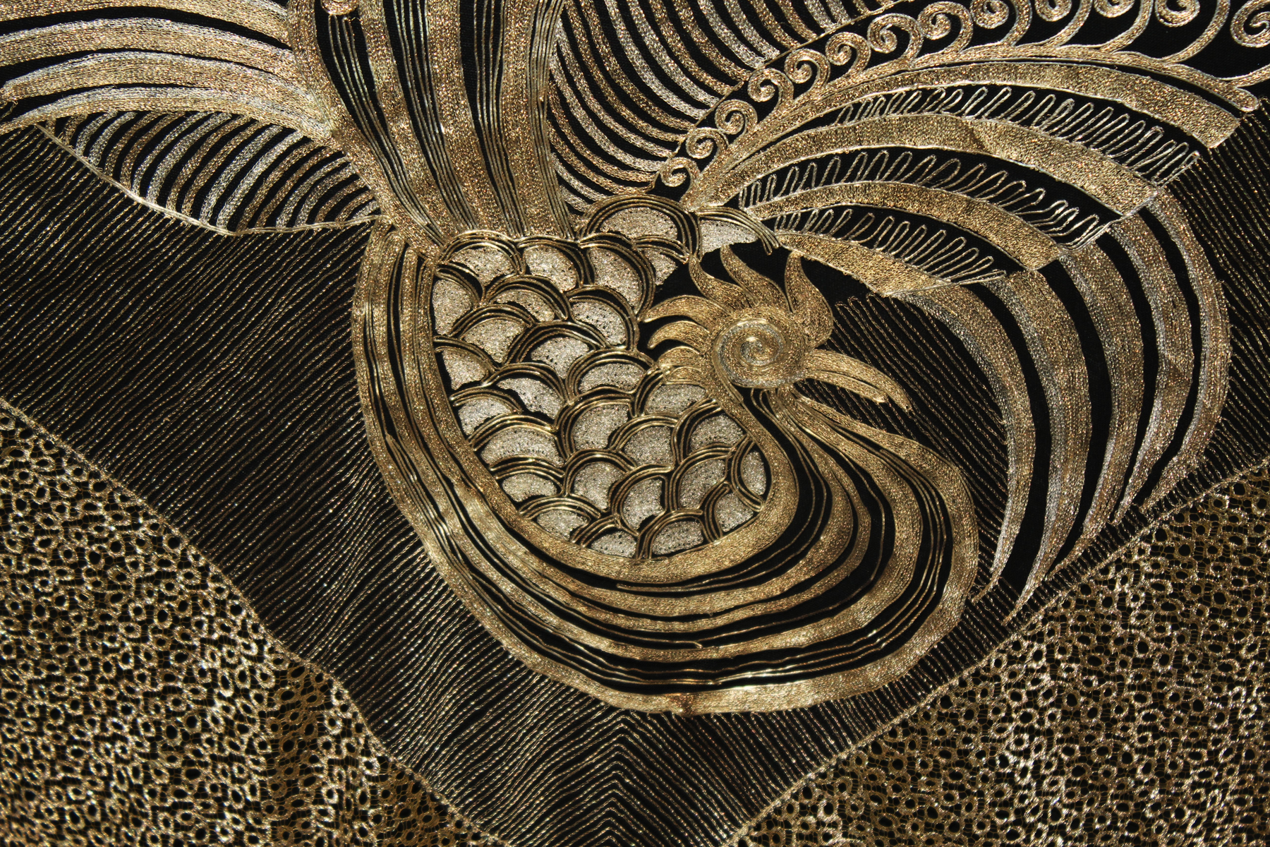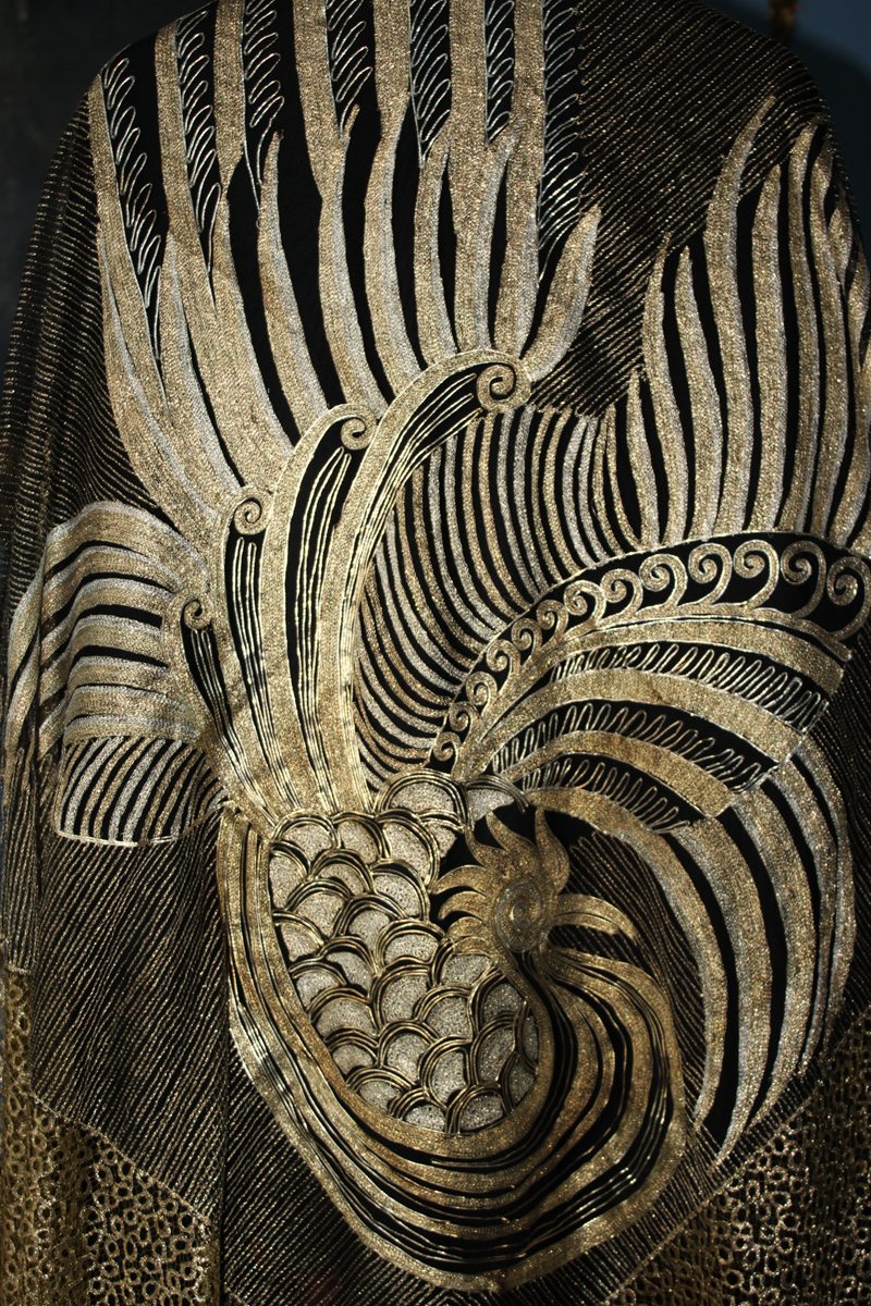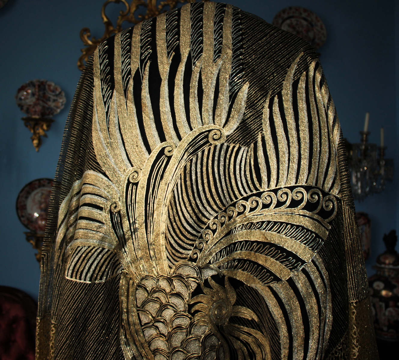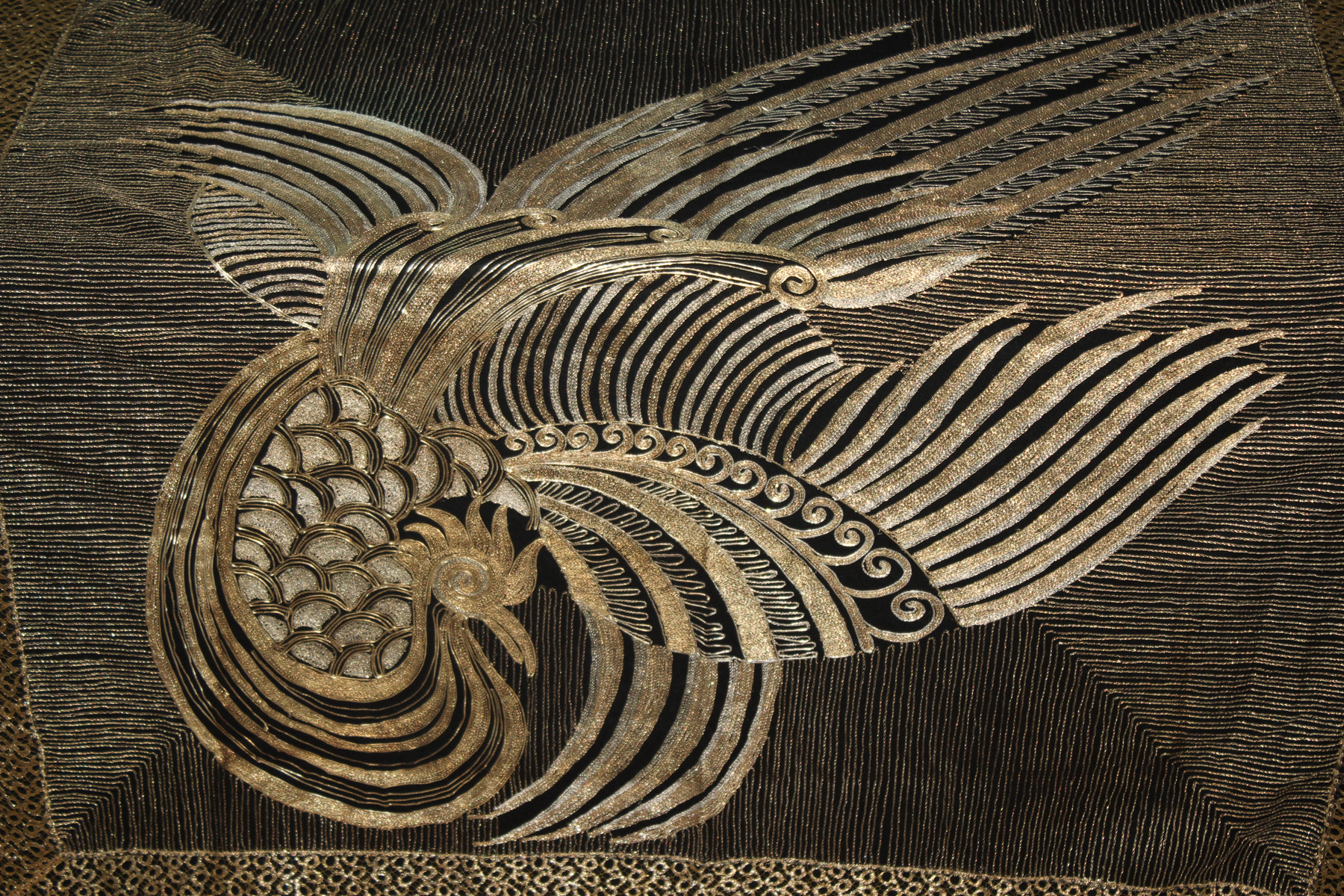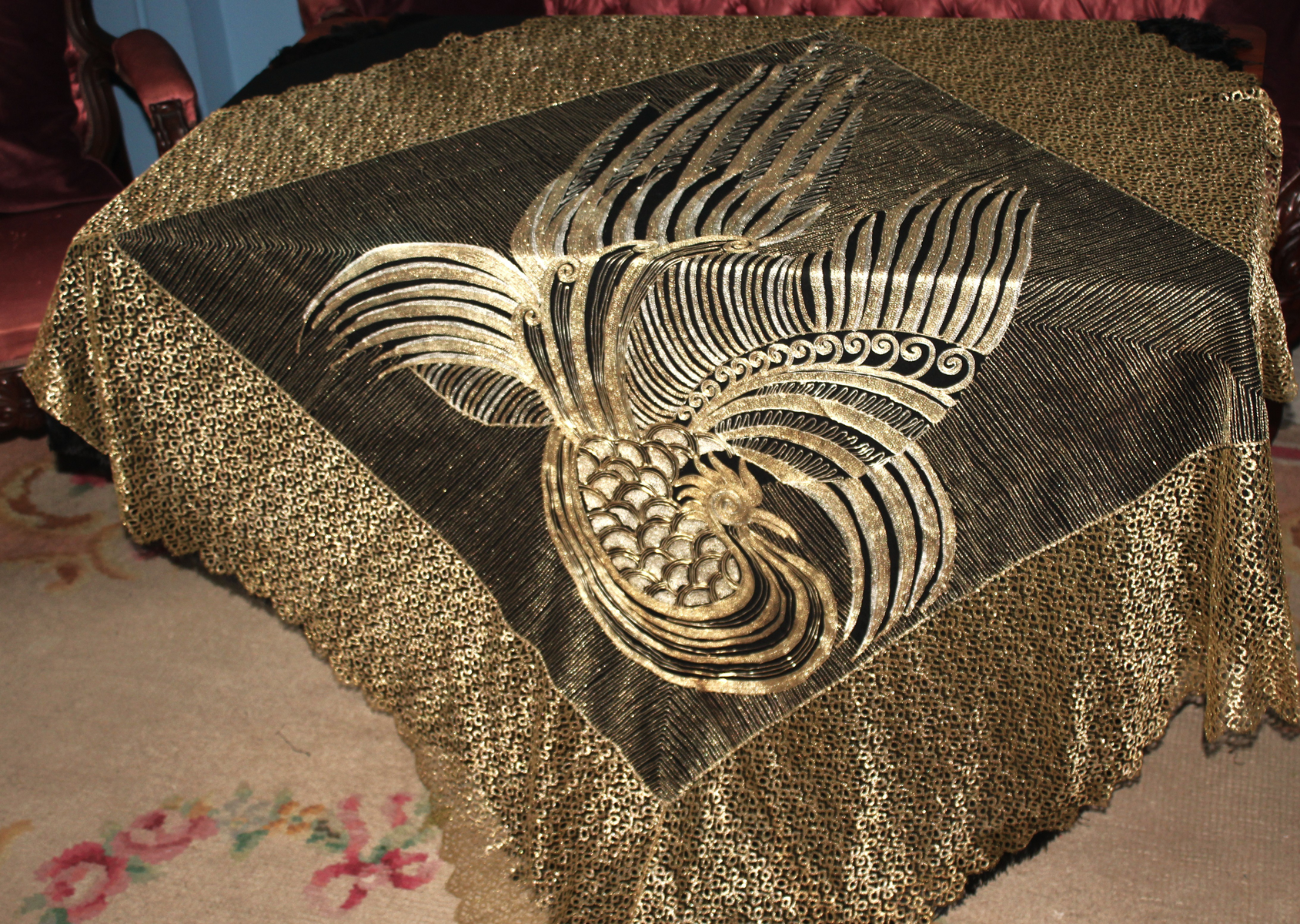 Rarísimo mantón o Chal antiguo Chino, bordado en laminas e hilos de oro y plata, de principios del Siglo XX, con motivos bordado de un Ave Fénix , con plumas, cresta, alas, volutas, etc. El ave fénix en la cultura china, conocida como Feng Huang, que representa la virtud, la gracias, la unión del Yin y el Yang, y el poder femenino de la emperatriz..