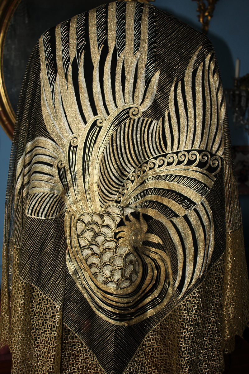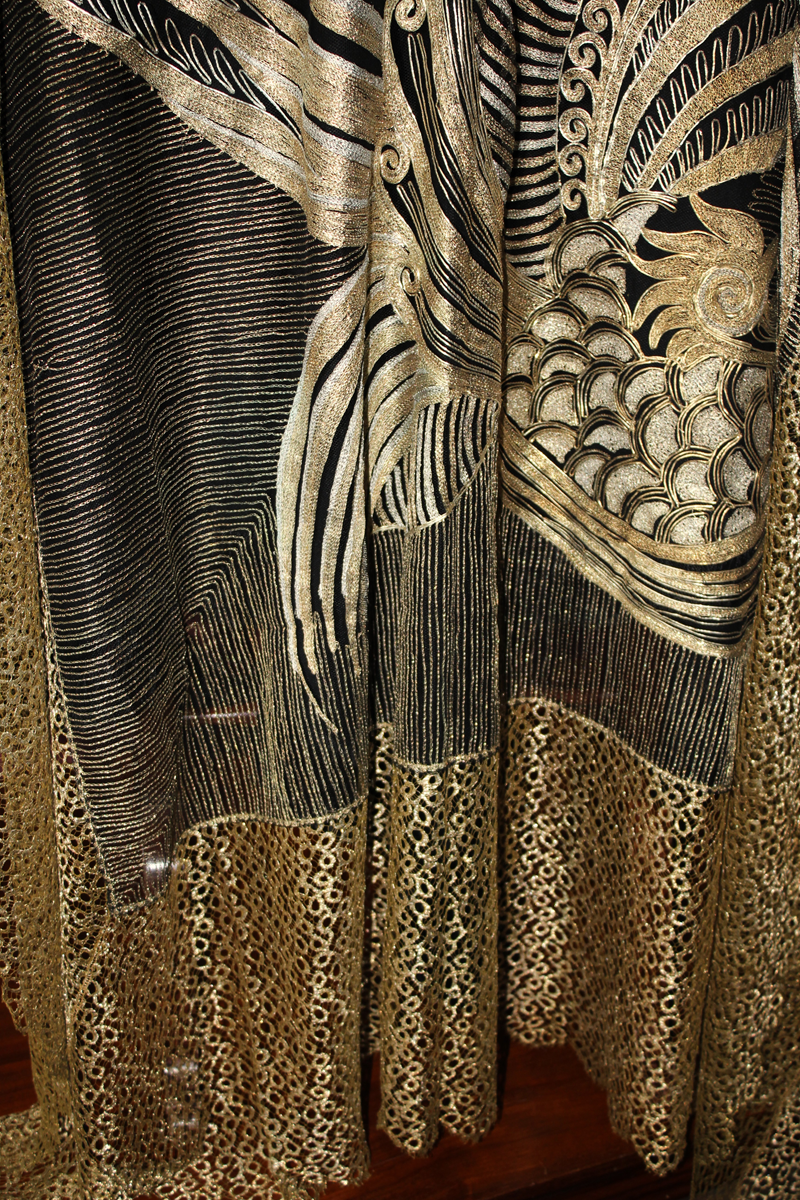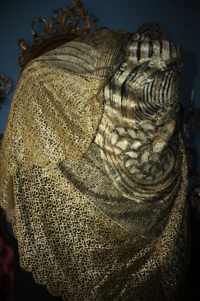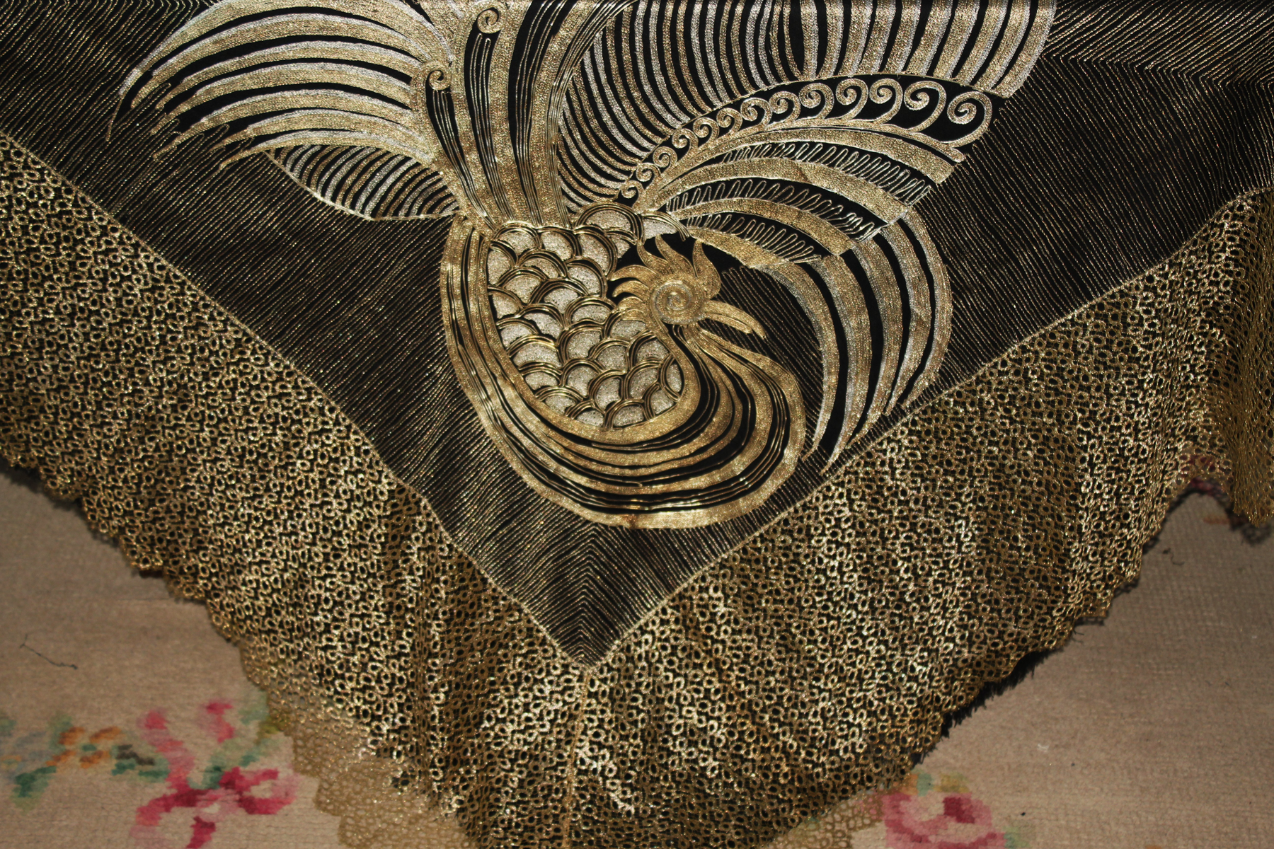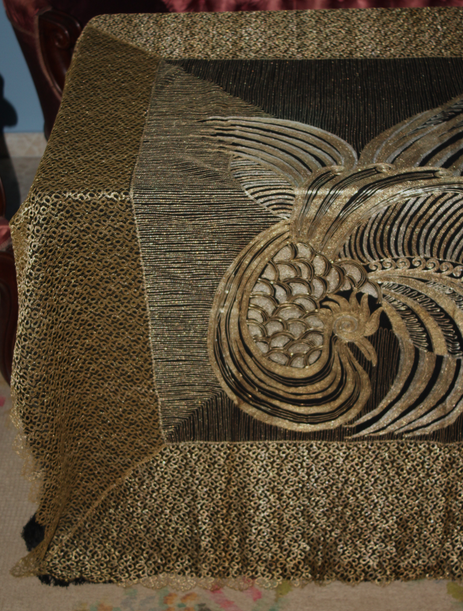 Es un chal antiguo , muy trabajado, de los años 20/30, con reminiscencia de los textiles chinos bordados en oro y en plata, por lo que es un textil suntuoso y lujoso.