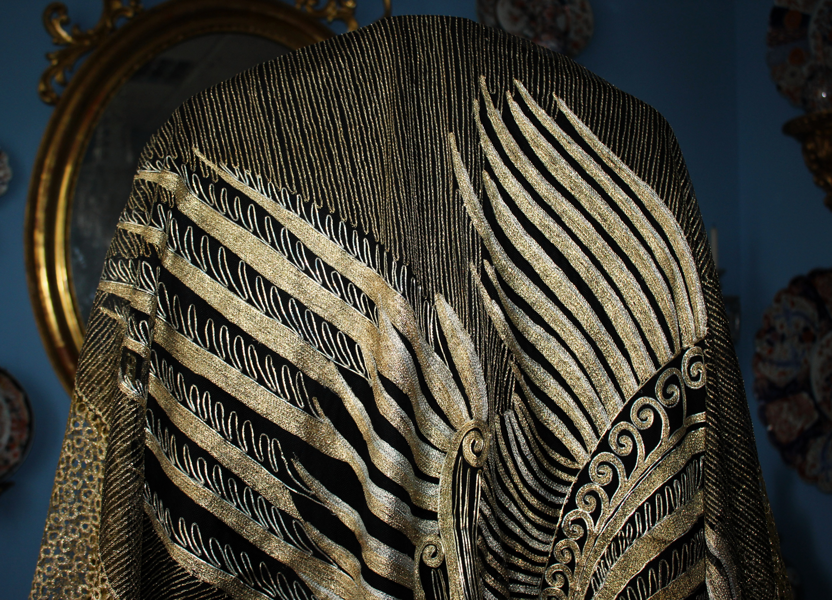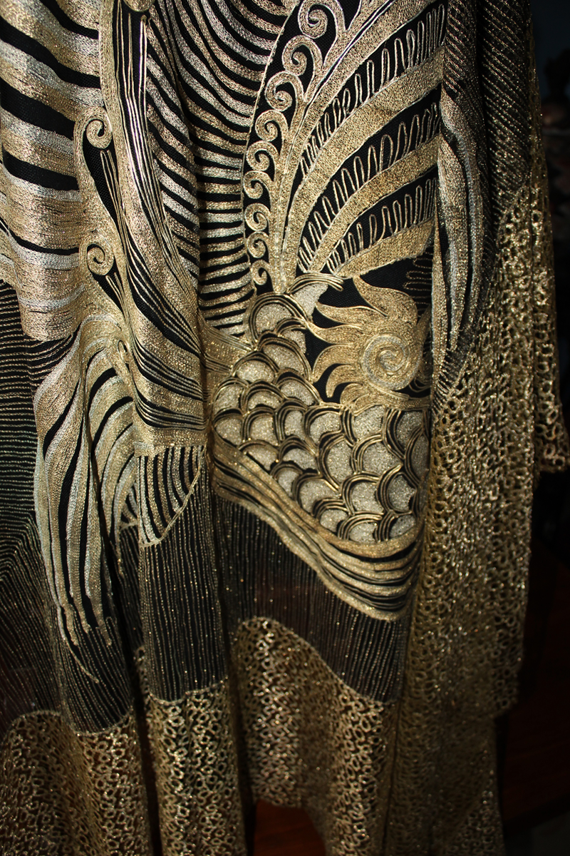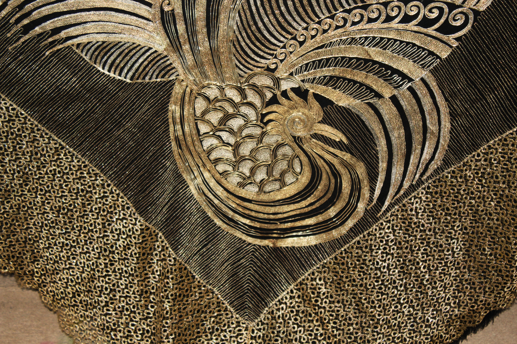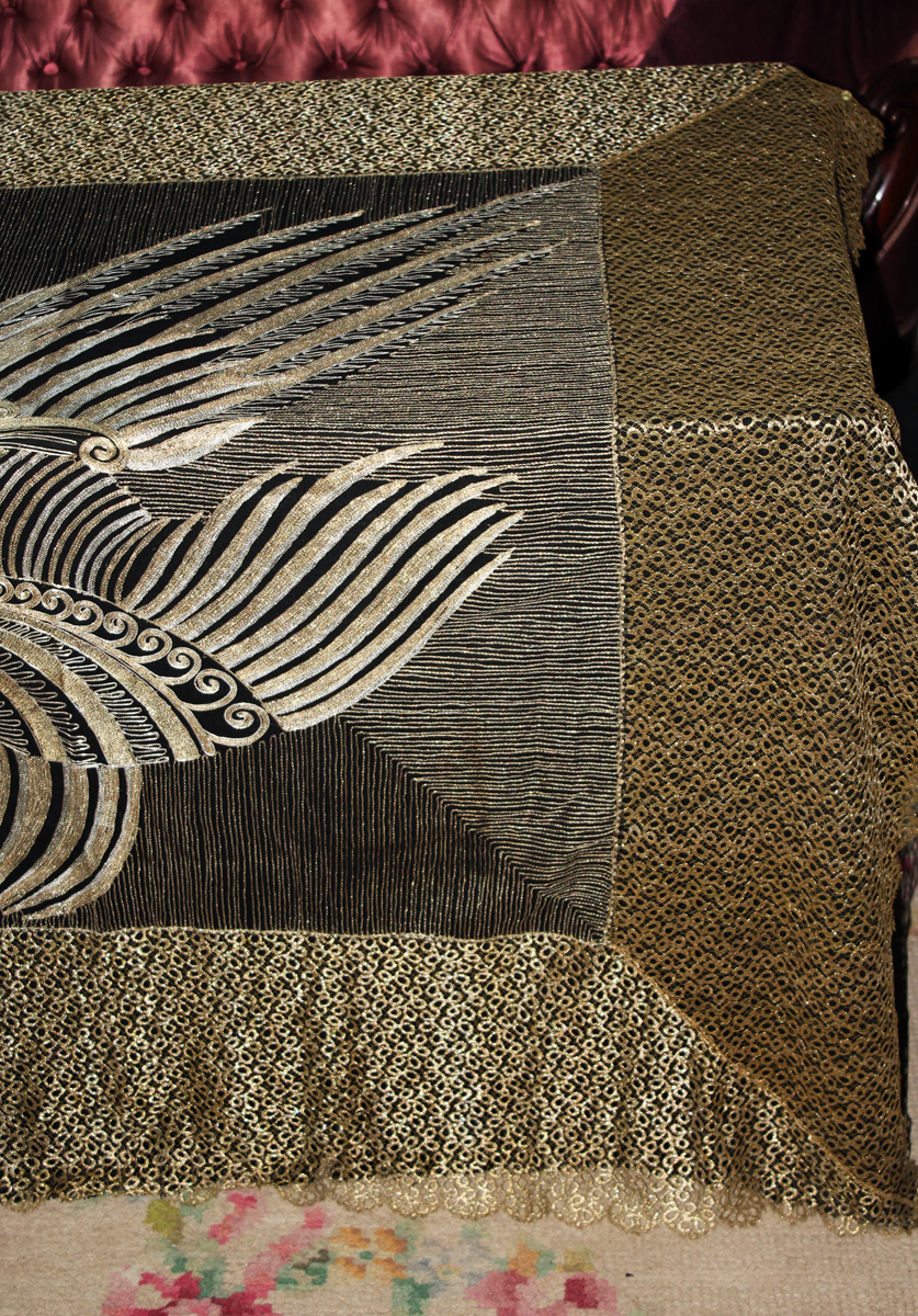 Es un chal antiguo , muy trabajado, de los años 20/30, con reminiscencia de los textiles chinos bordados en oro y en plata, por lo que es un textil suntuoso y lujoso.