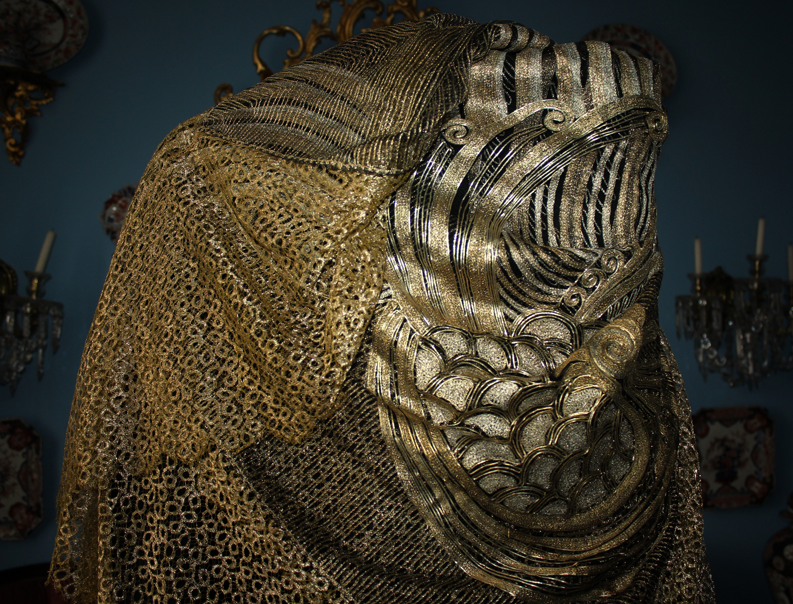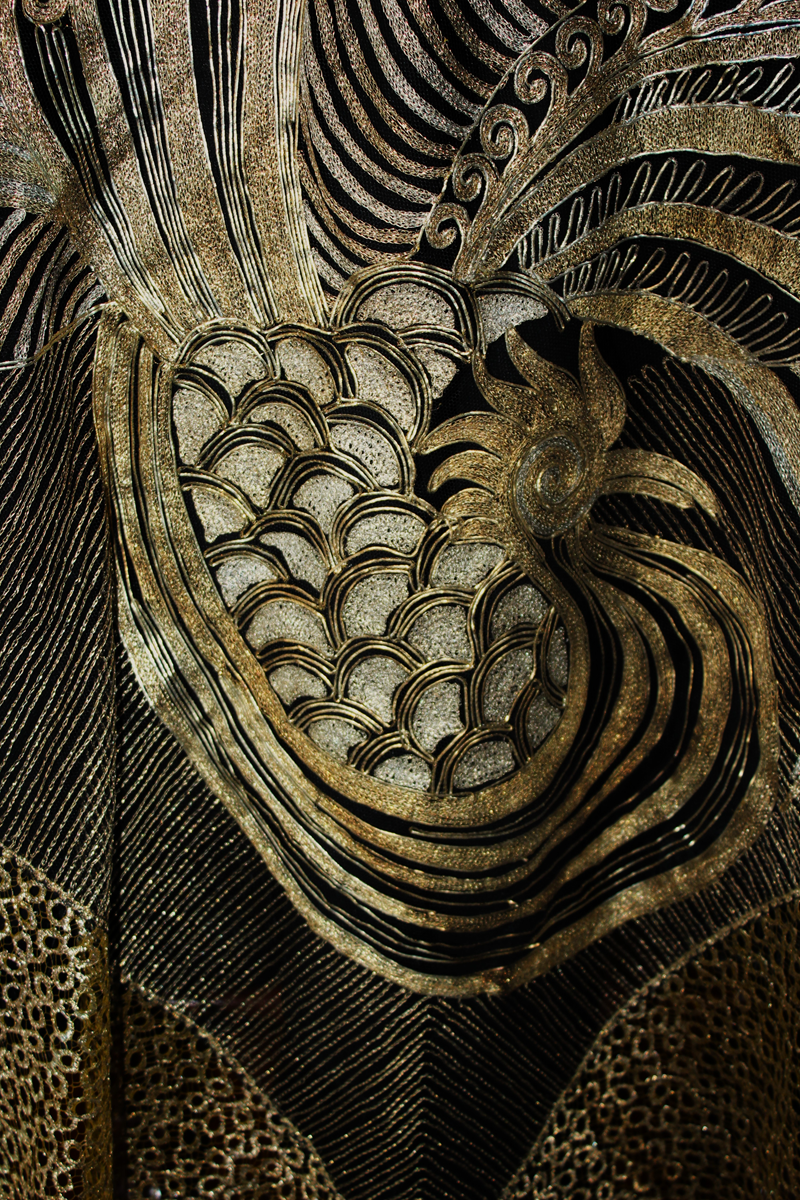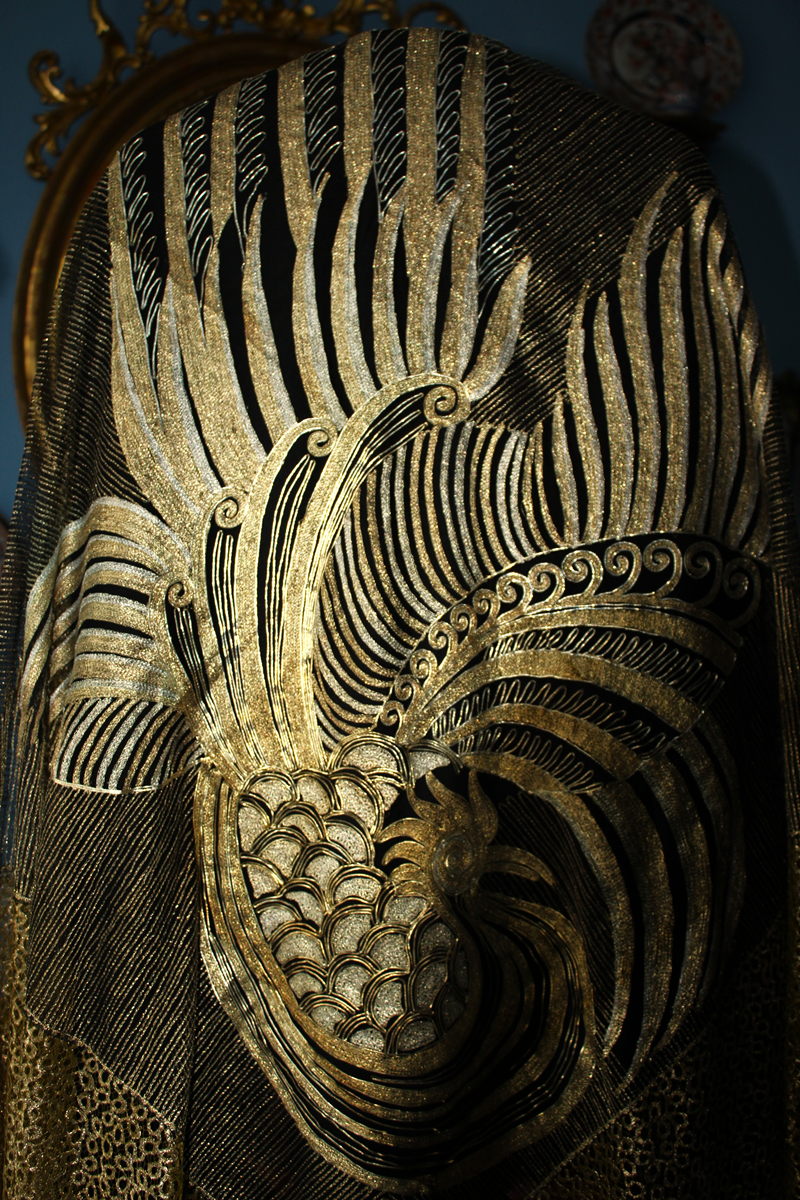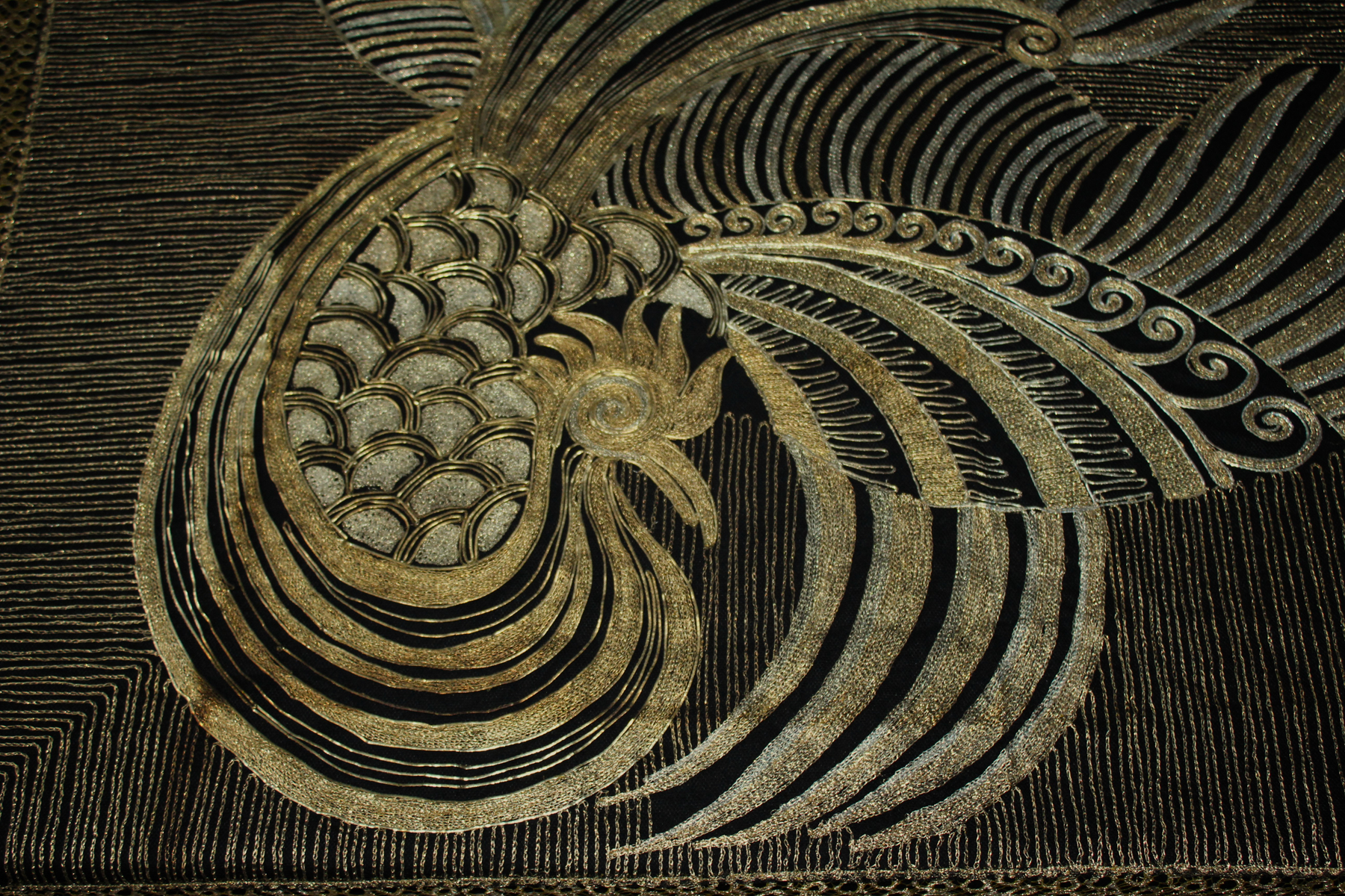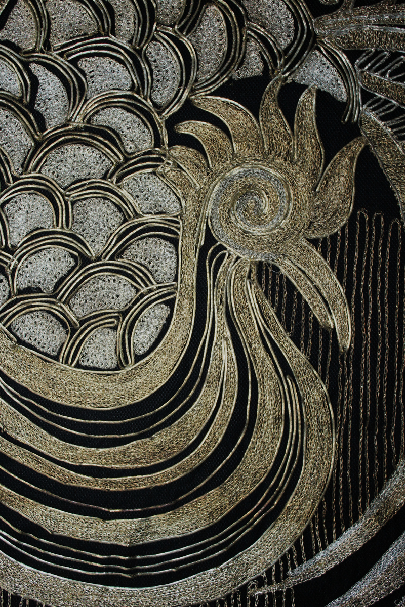Es un chal antiguo , muy trabajado, de los años 20/30, con reminiscencia de los textiles chinos bordados en oro y en plata, por lo que es un textil suntuoso y lujoso.