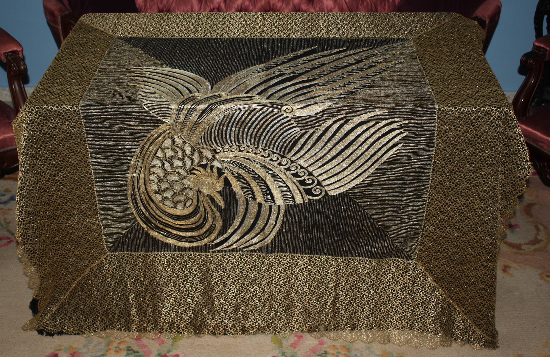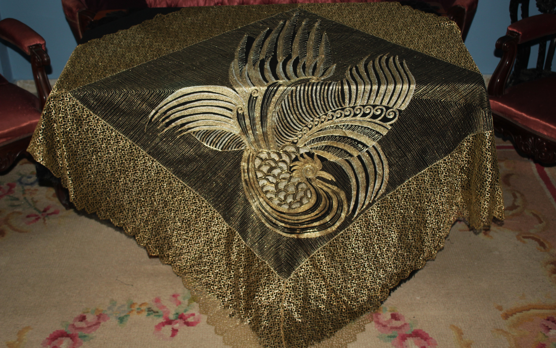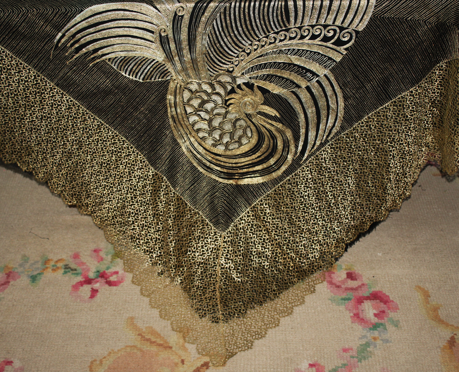 El diseño magnífico y muy conseguido con la utilización de los diferentes tonos de los hilos de oro y de los de plata,. Una obra de arte y refinamiento. De buen gusto. Medidas 130 cm por 130 cm. Pieza de colección y muy rara.