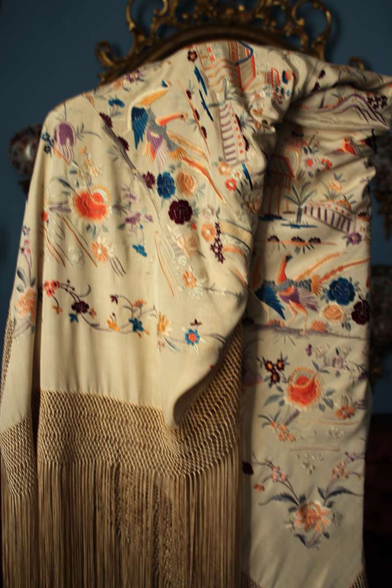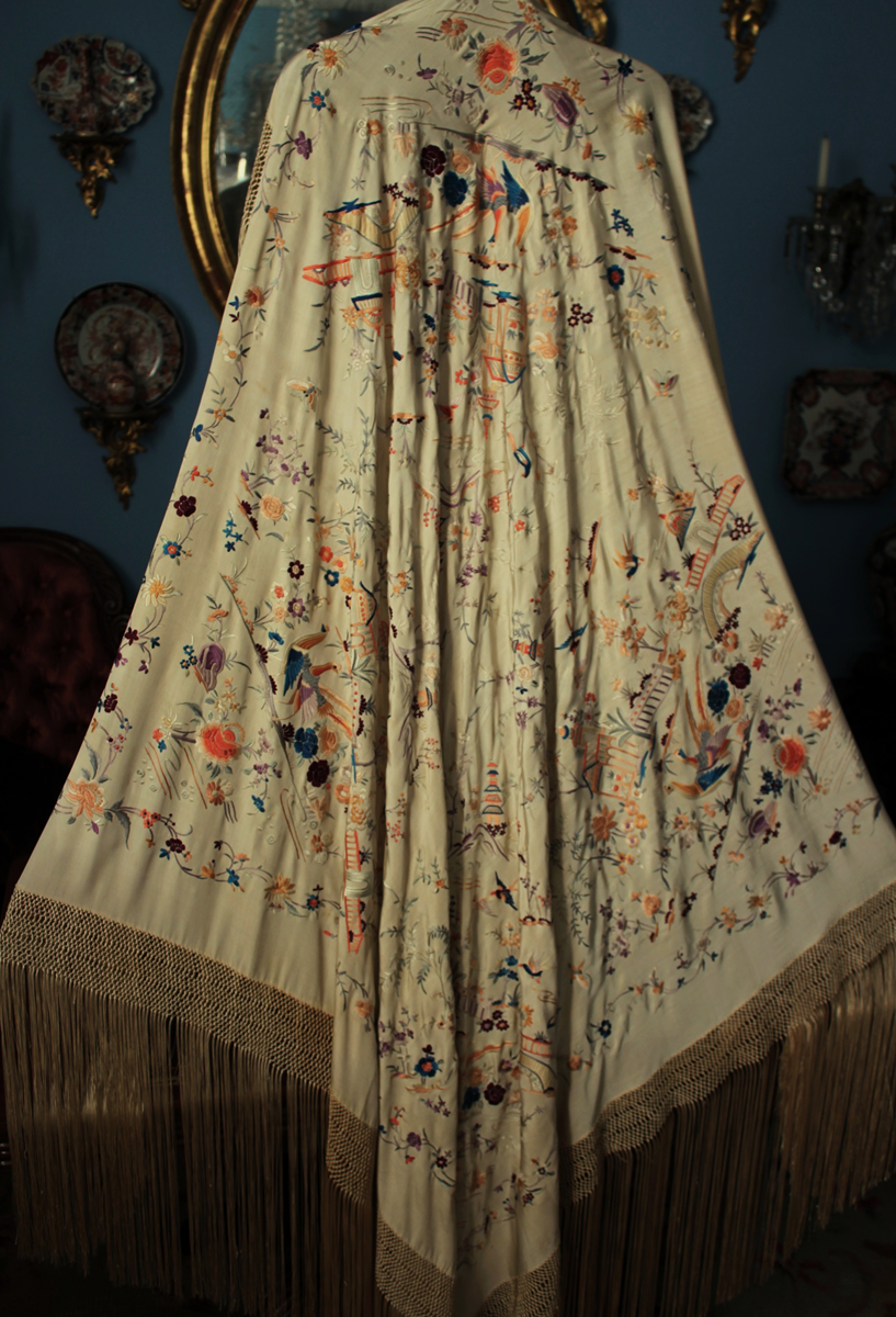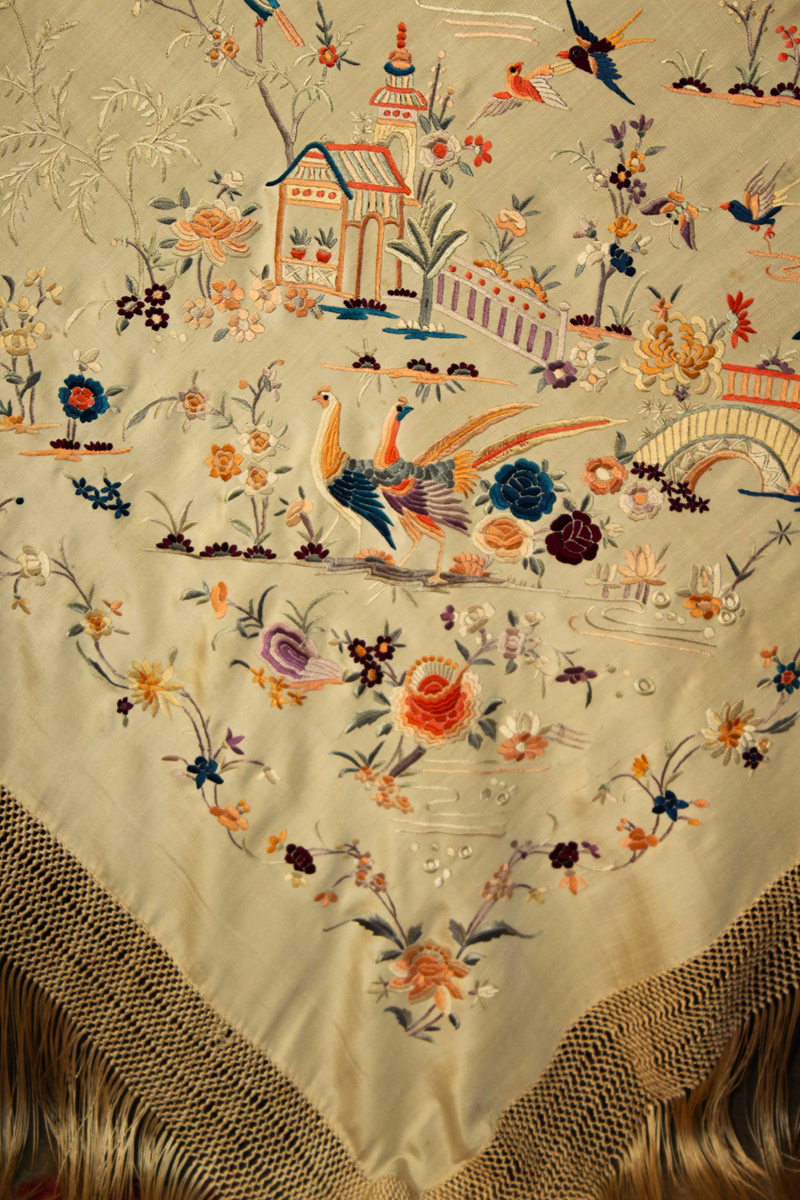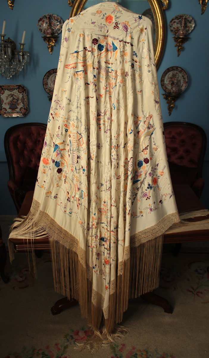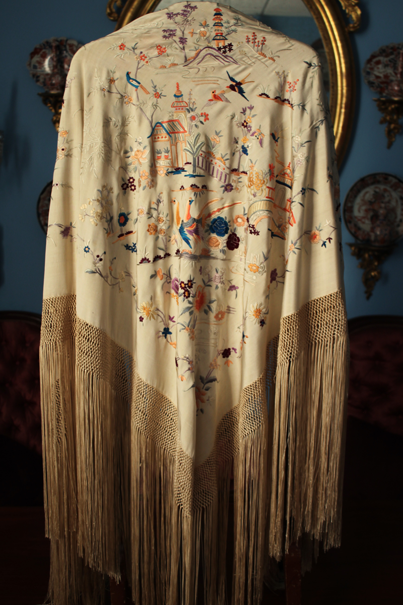 Mantón de Manila antiguo de finales del siglo XIX y principios del Siglo XX, de Chinosseries, bordado a mano en seda beige tostada. Motivos de flores, hojas ,ramas, pagodas, templos, vallas, puentes, mariposas, aves, pájaros destacando entre todos ellos los faisanes.