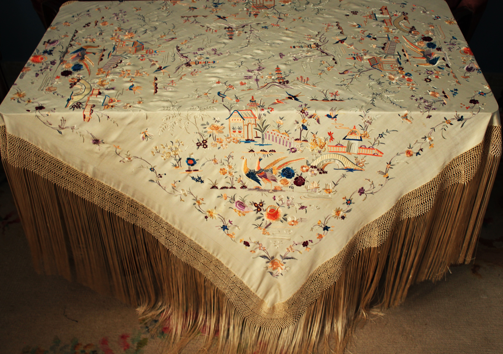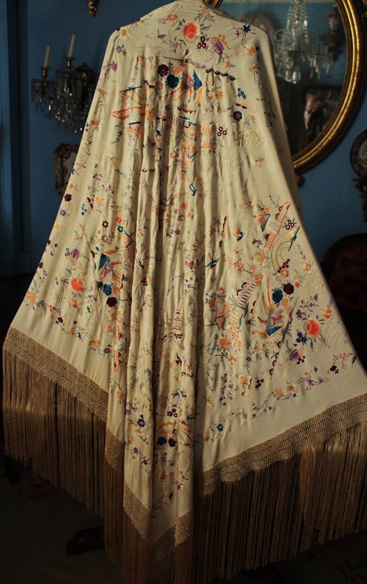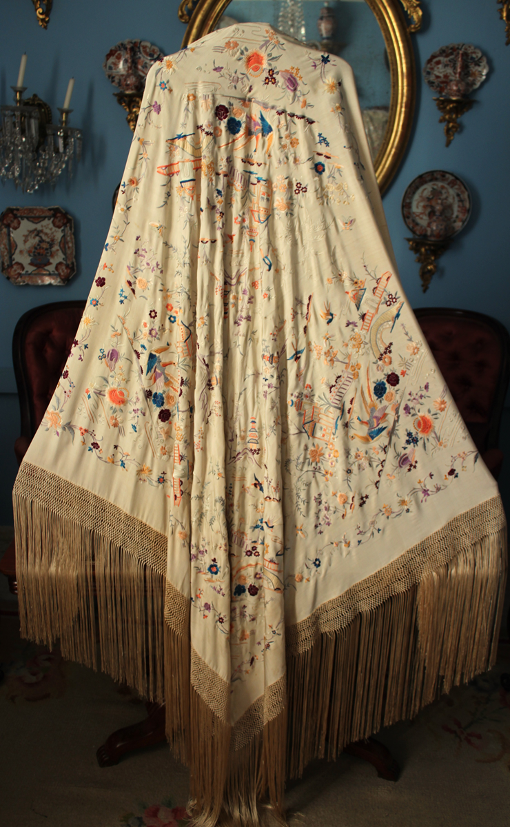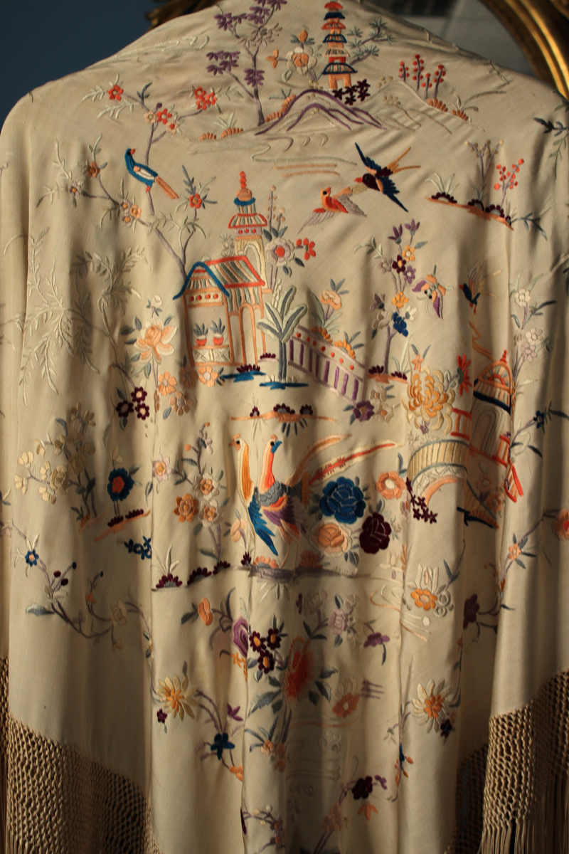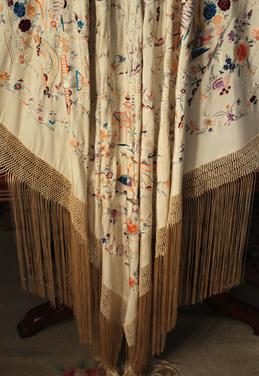 Mantón de Manila antiguo de finales del siglo XIX y principios del Siglo XX, de Chinosseries, bordado a mano en seda beige tostada. Motivos de flores, hojas ,ramas, pagodas, templos, vallas, puentes, mariposas, aves, pájaros destacando entre todos ellos los faisanes.