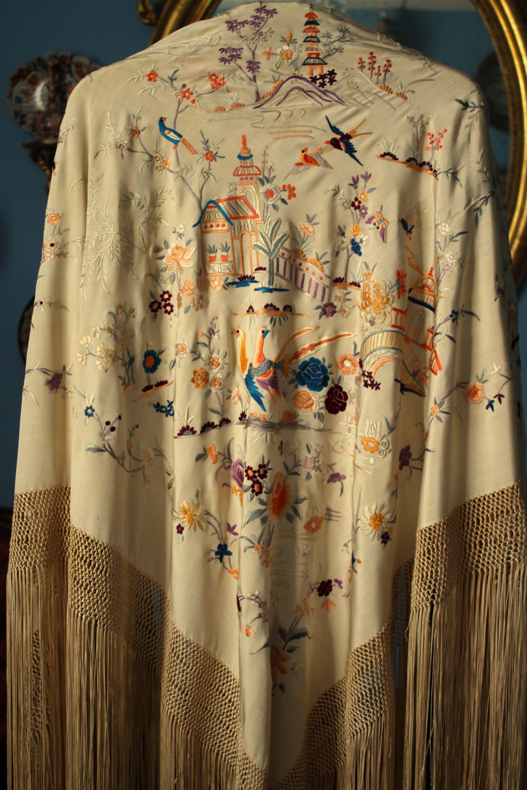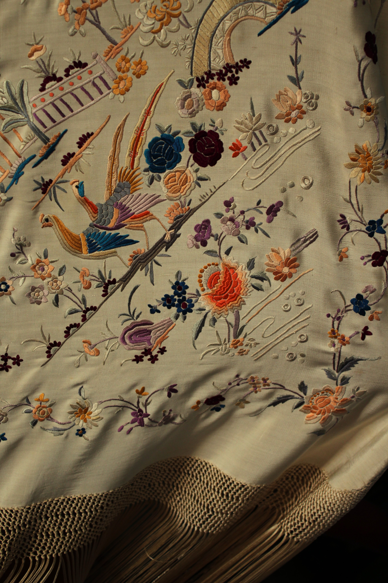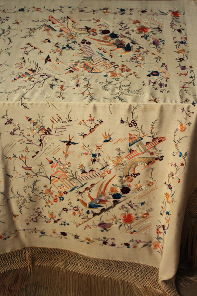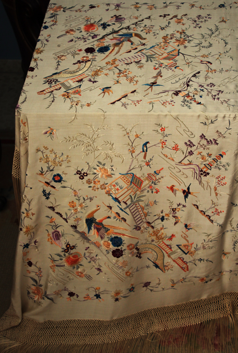 Mantón de Manila antiguo de finales del siglo XIX y principios del Siglo XX, de Chinosseries, bordado a mano en seda beige tostada. Motivos de flores, hojas ,ramas, pagodas, templos, vallas, puentes, mariposas, aves, pájaros destacando entre todos ellos los faisanes.
