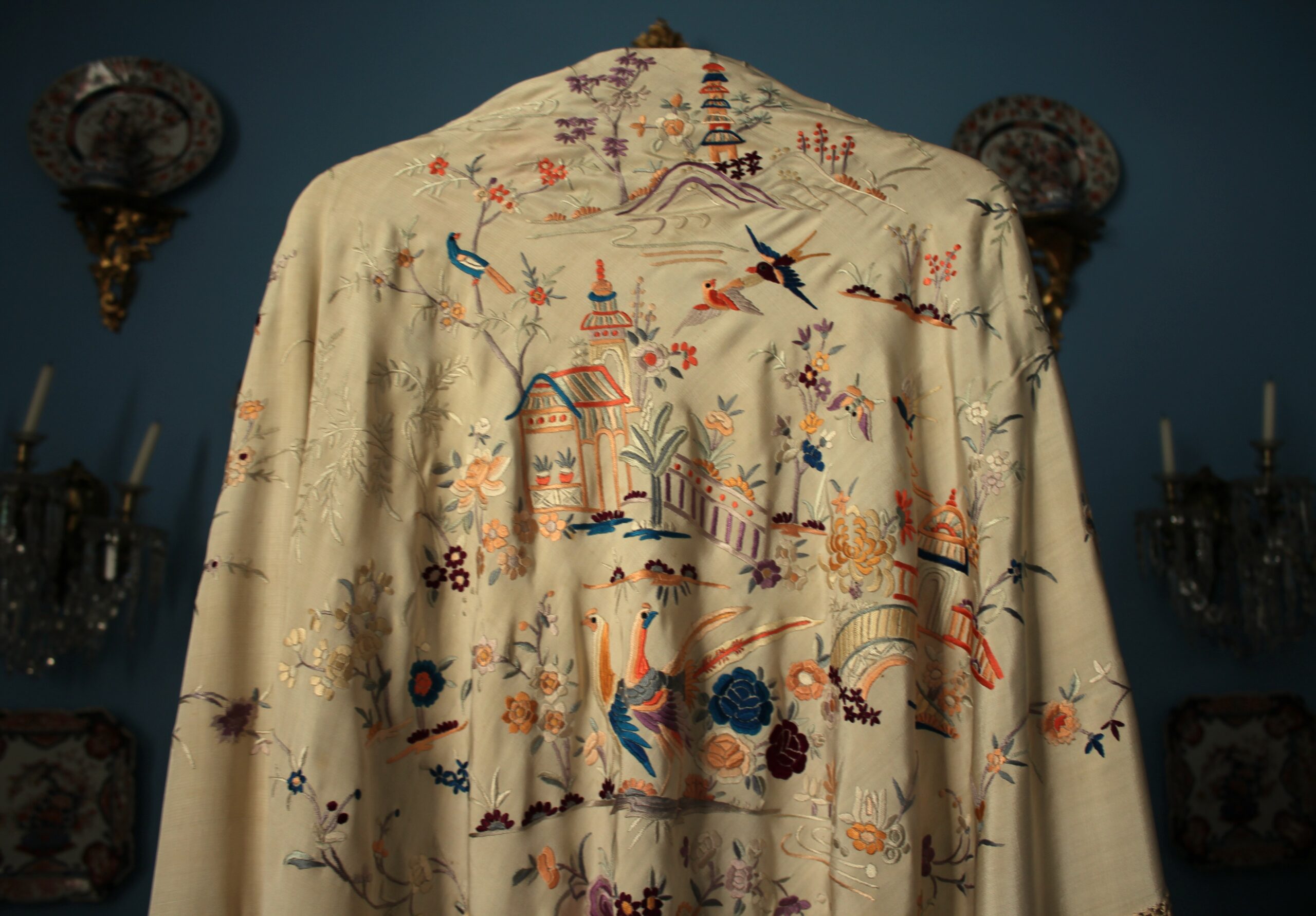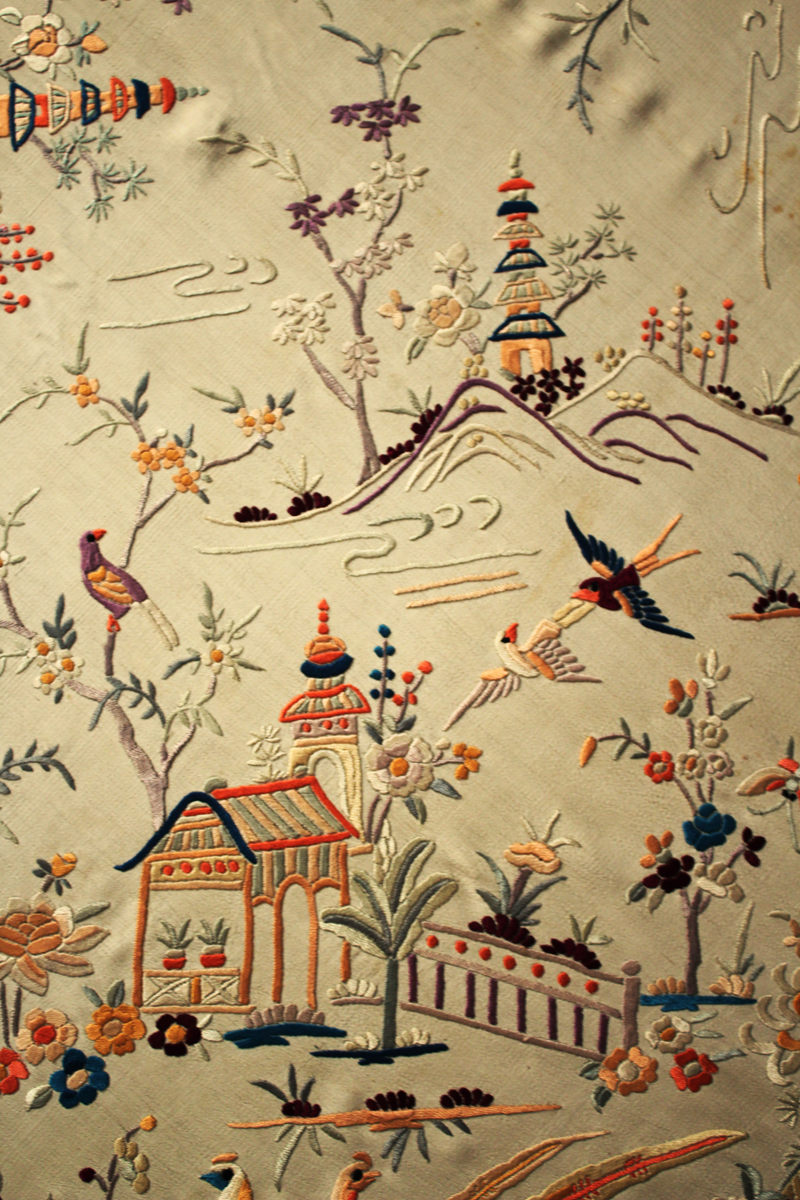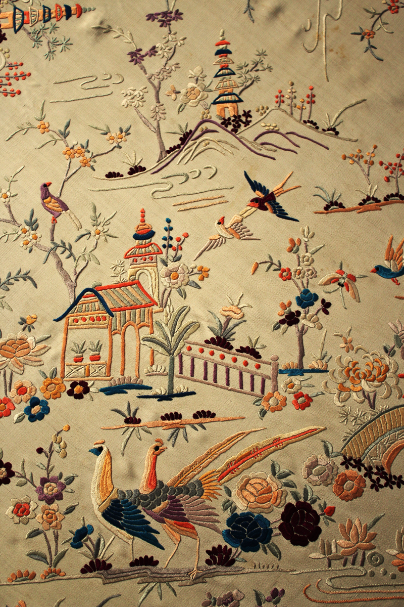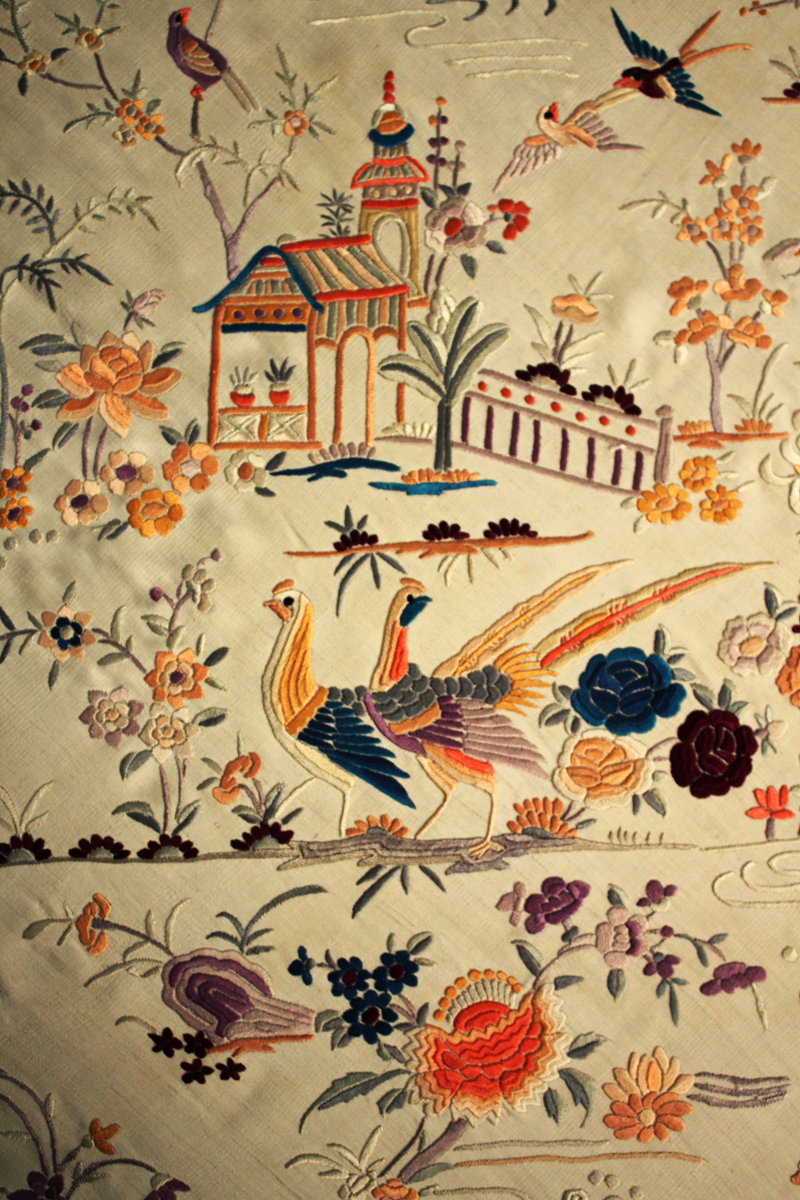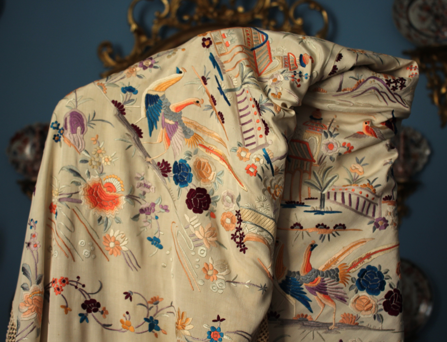 Mantón de Manila antiguo de finales del siglo XIX y principios del Siglo XX, de Chinosseries, bordado a mano en seda beige tostada. Motivos de flores, hojas ,ramas, pagodas, templos, vallas, puentes, mariposas, aves, pájaros destacando entre todos ellos los faisanes.