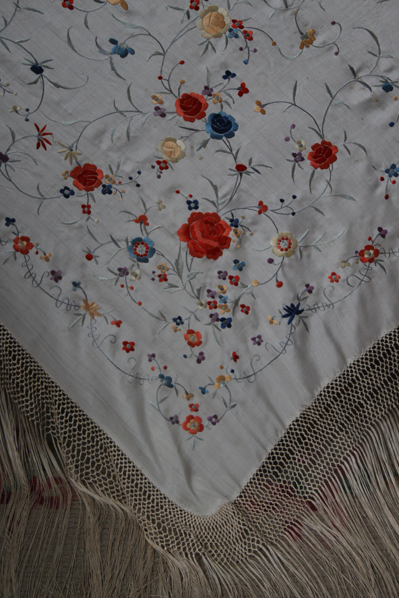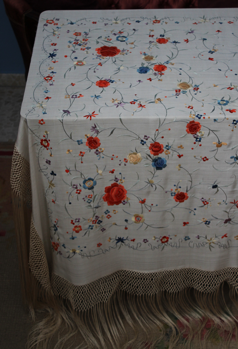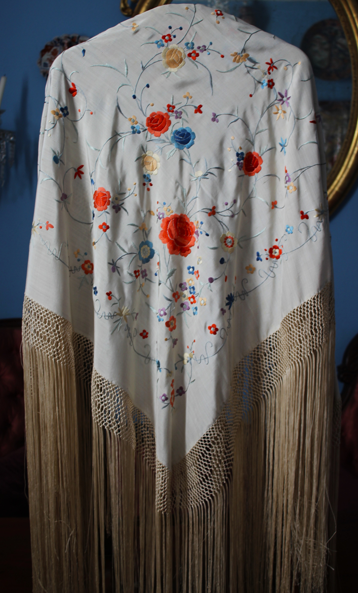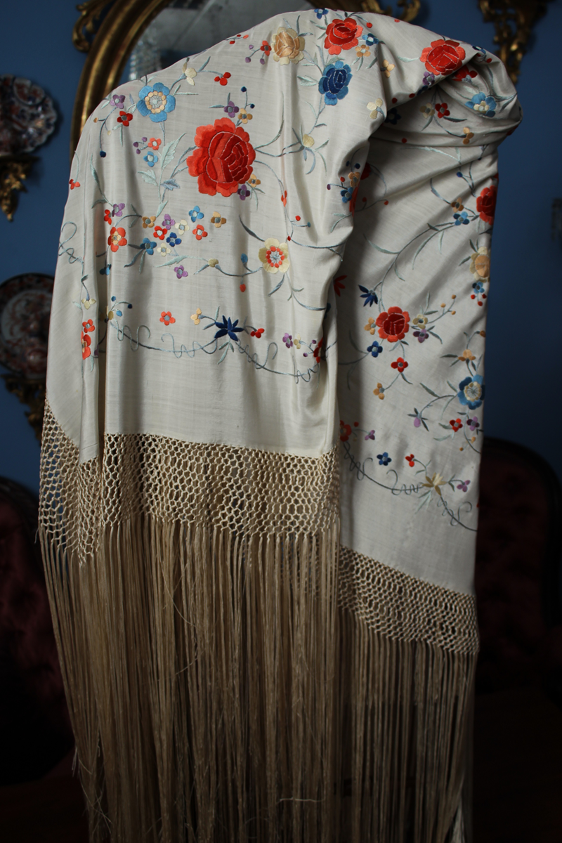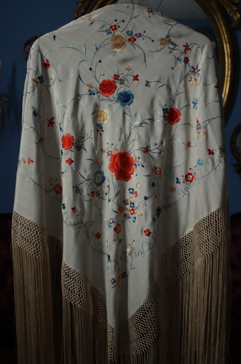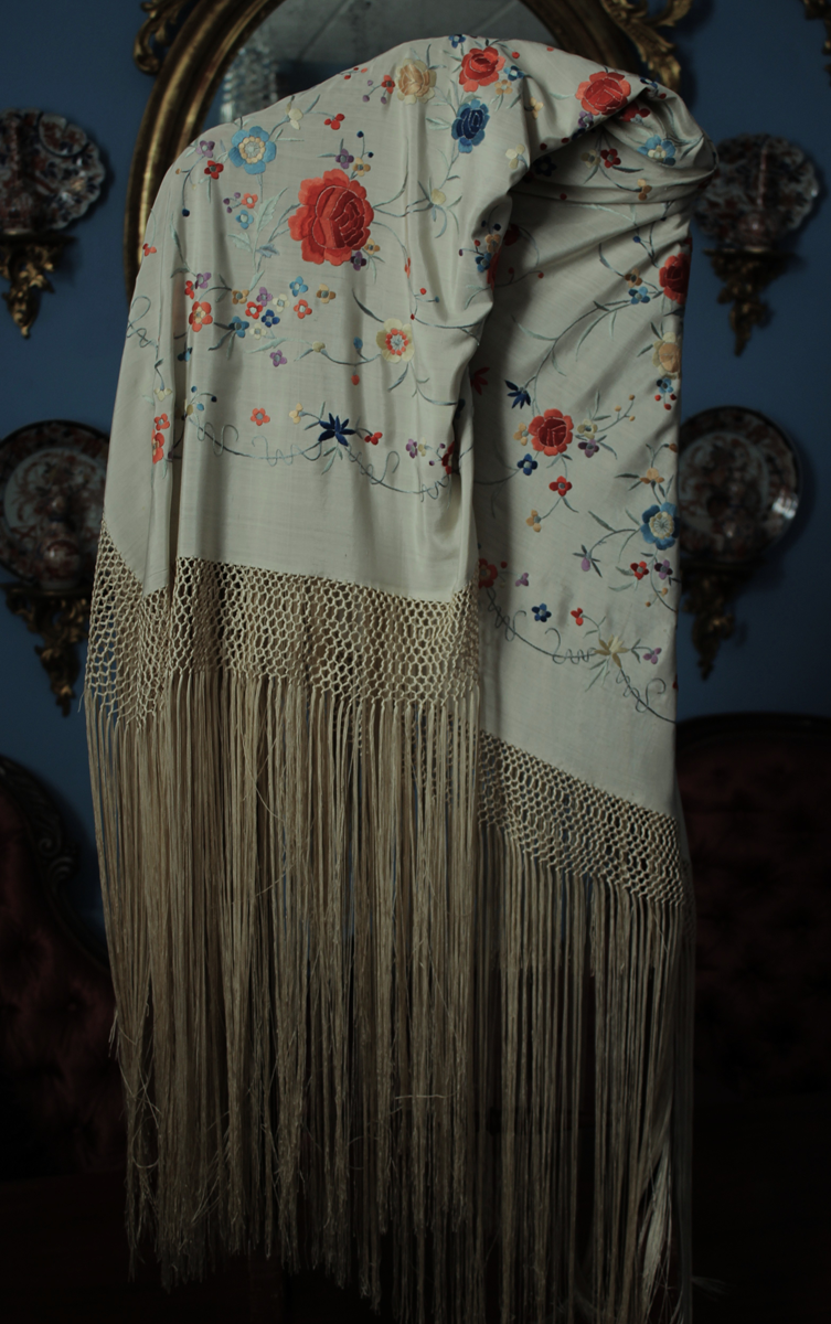 Mantón de Manila  antiguo de finales del siglo XIX y principios del Siglo XX, bordado a mano en seda beige. Motivos de flores, hojas y ramas. Los colores de las flores son rojas, naranjas y azules.