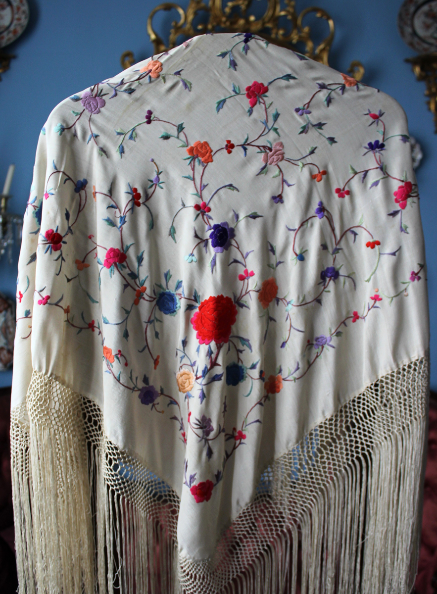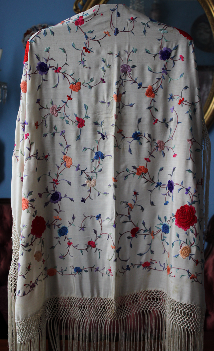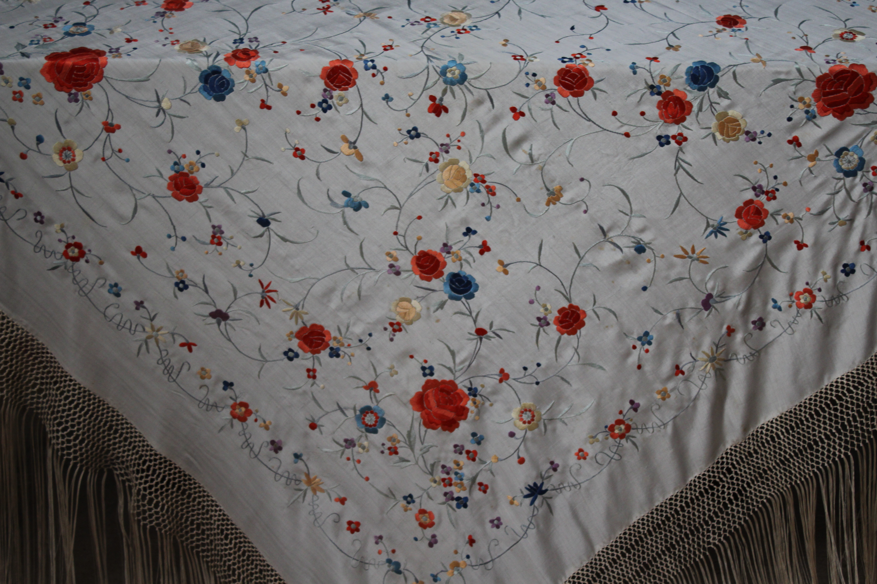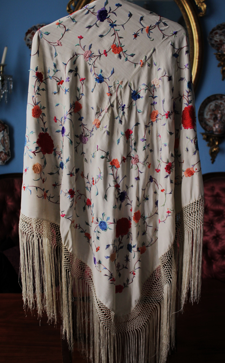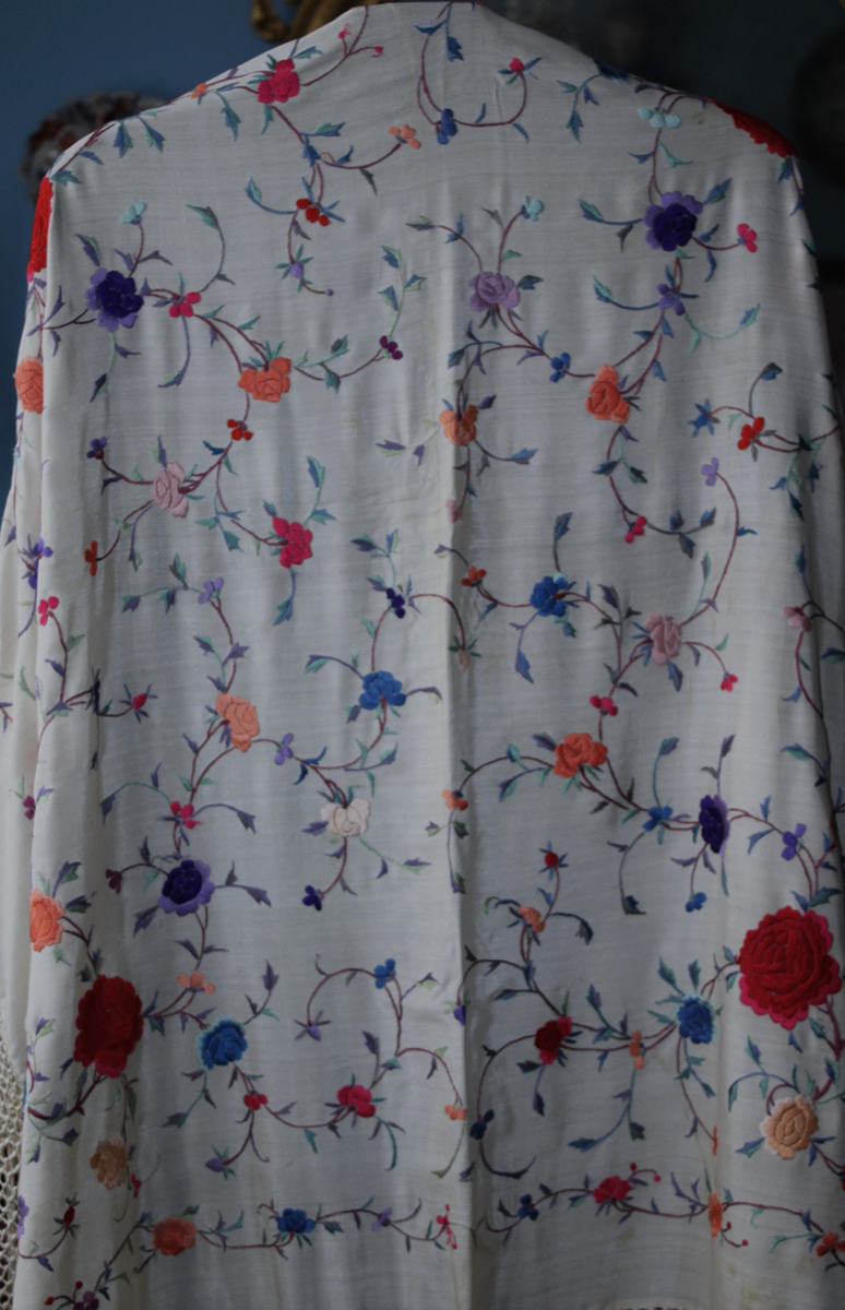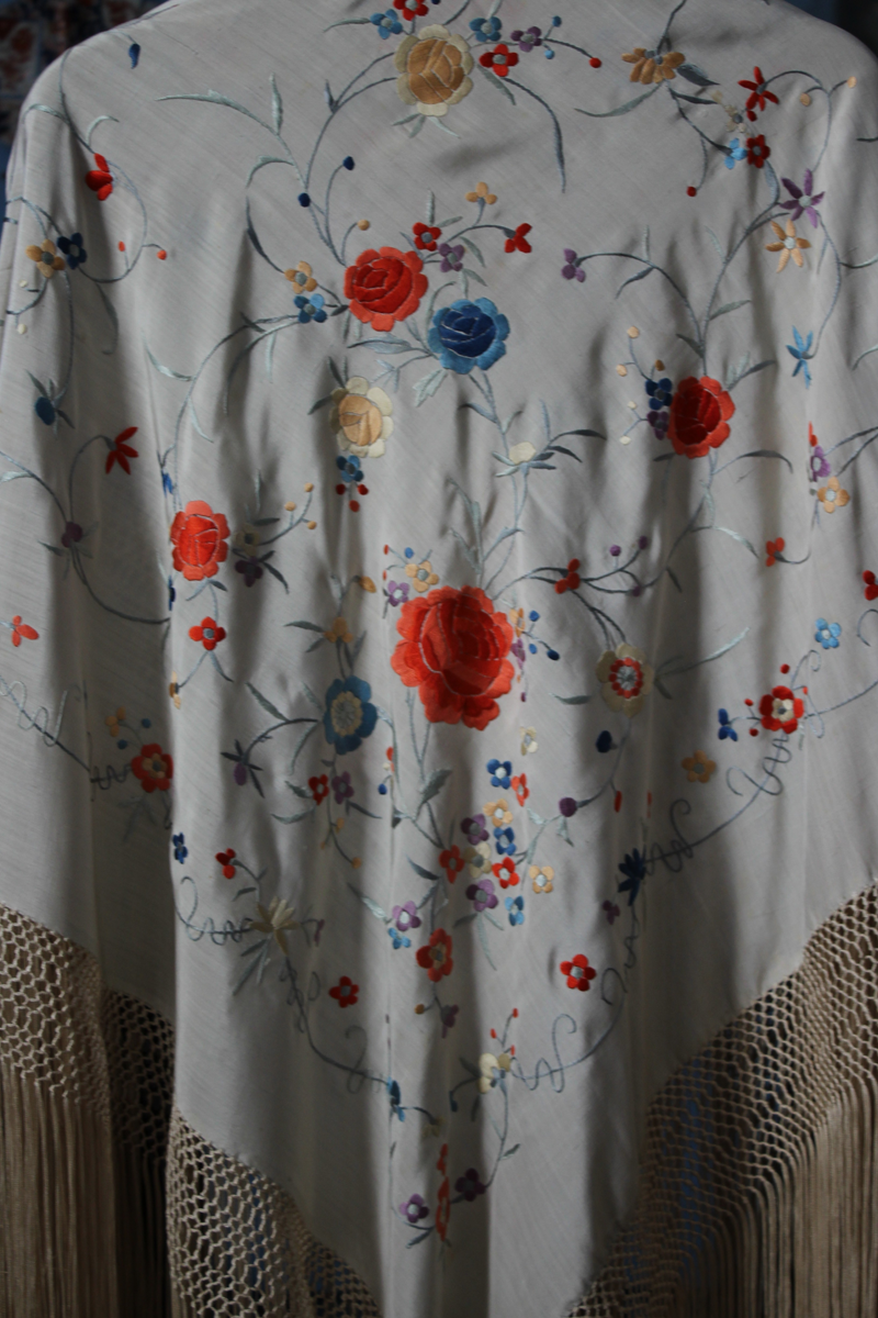 Mantón de Manila  antiguo de finales del siglo XIX y principios del Siglo XX, bordado a mano en seda beige. Motivos de flores, hojas y ramas. Los colores de las flores son rojas, naranjas y azules.