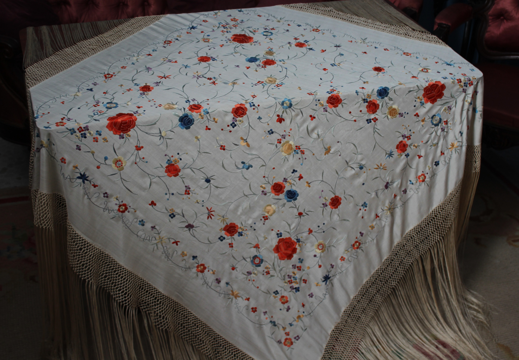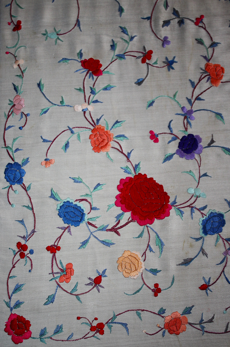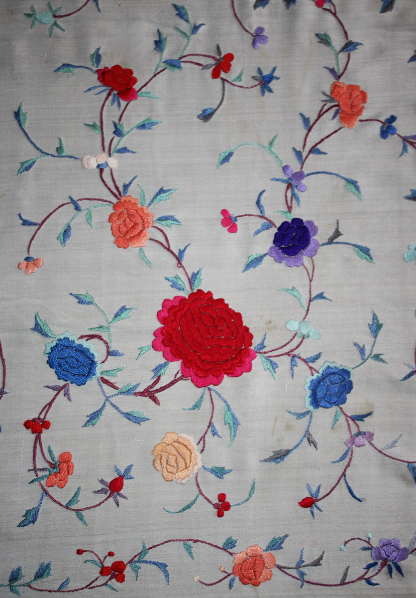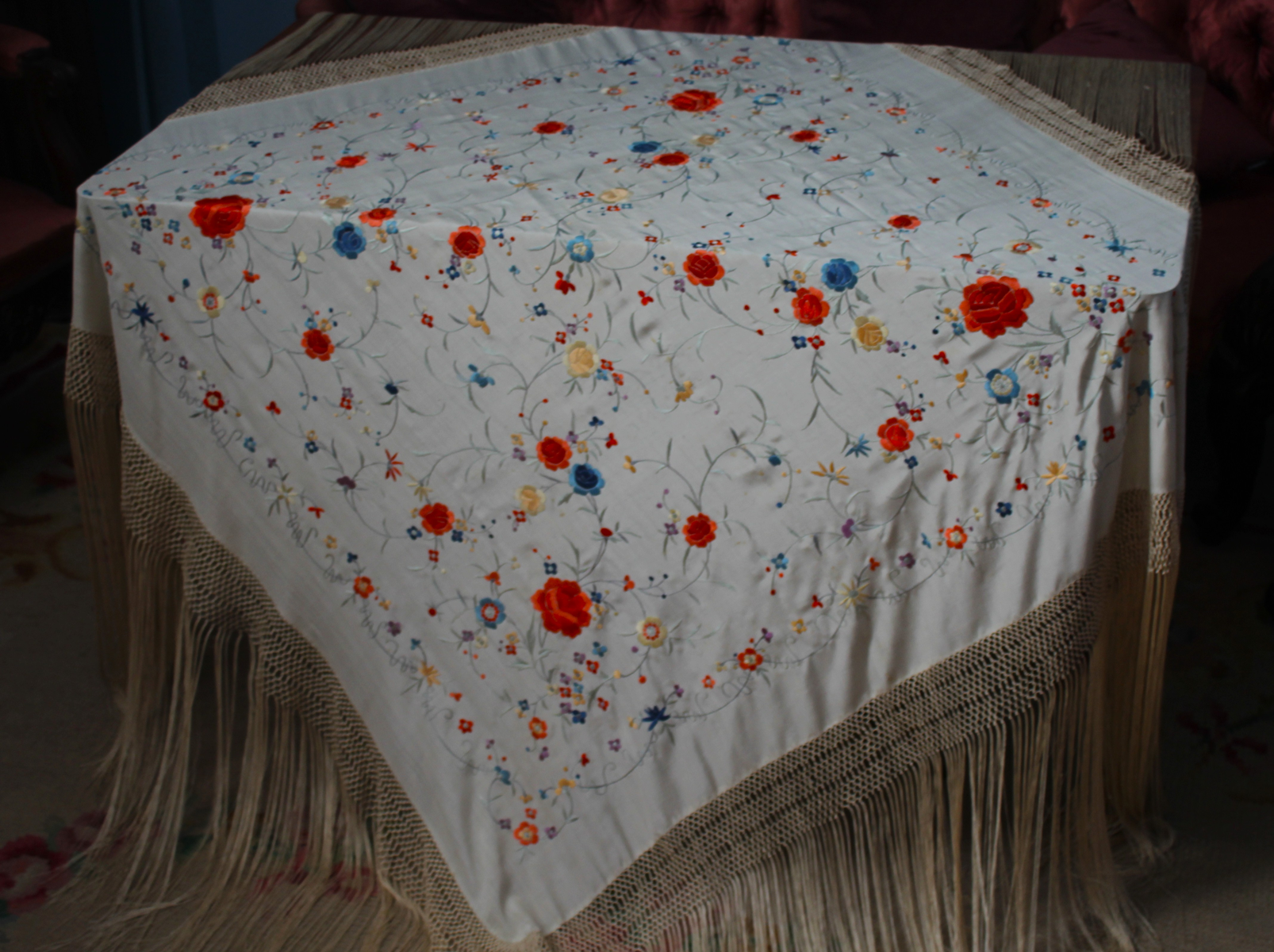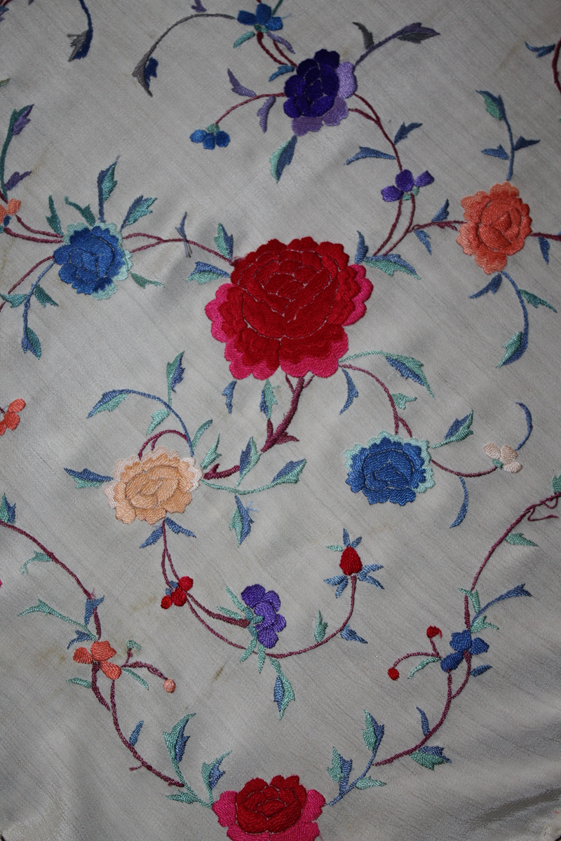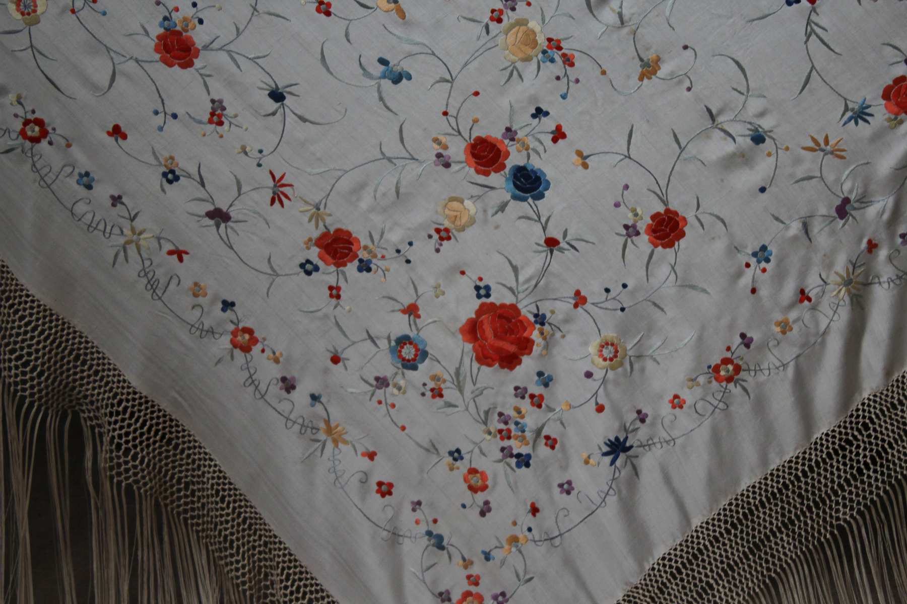 Mantón de Manila  antiguo de finales del siglo XIX y principios del Siglo XX, bordado a mano en seda beige. Motivos de flores, hojas y ramas. Los colores de las flores son rojas, naranjas y azules.