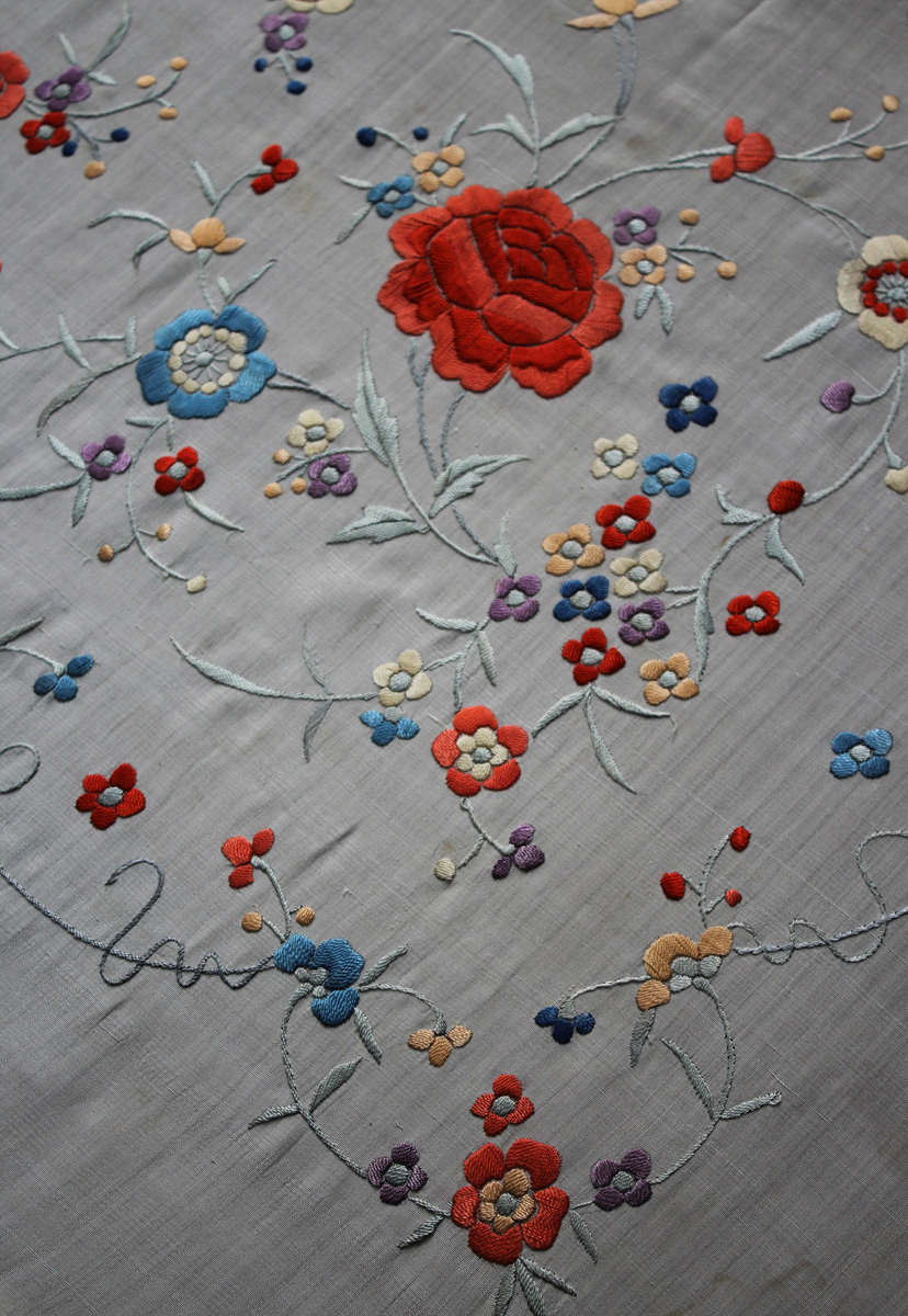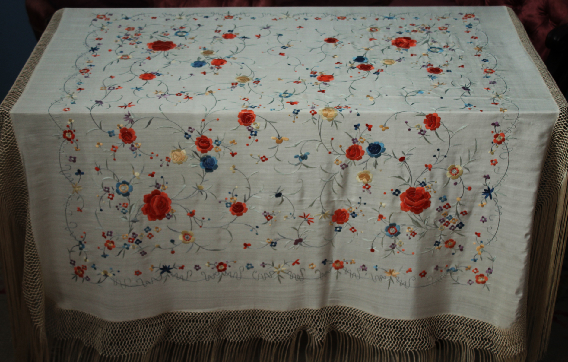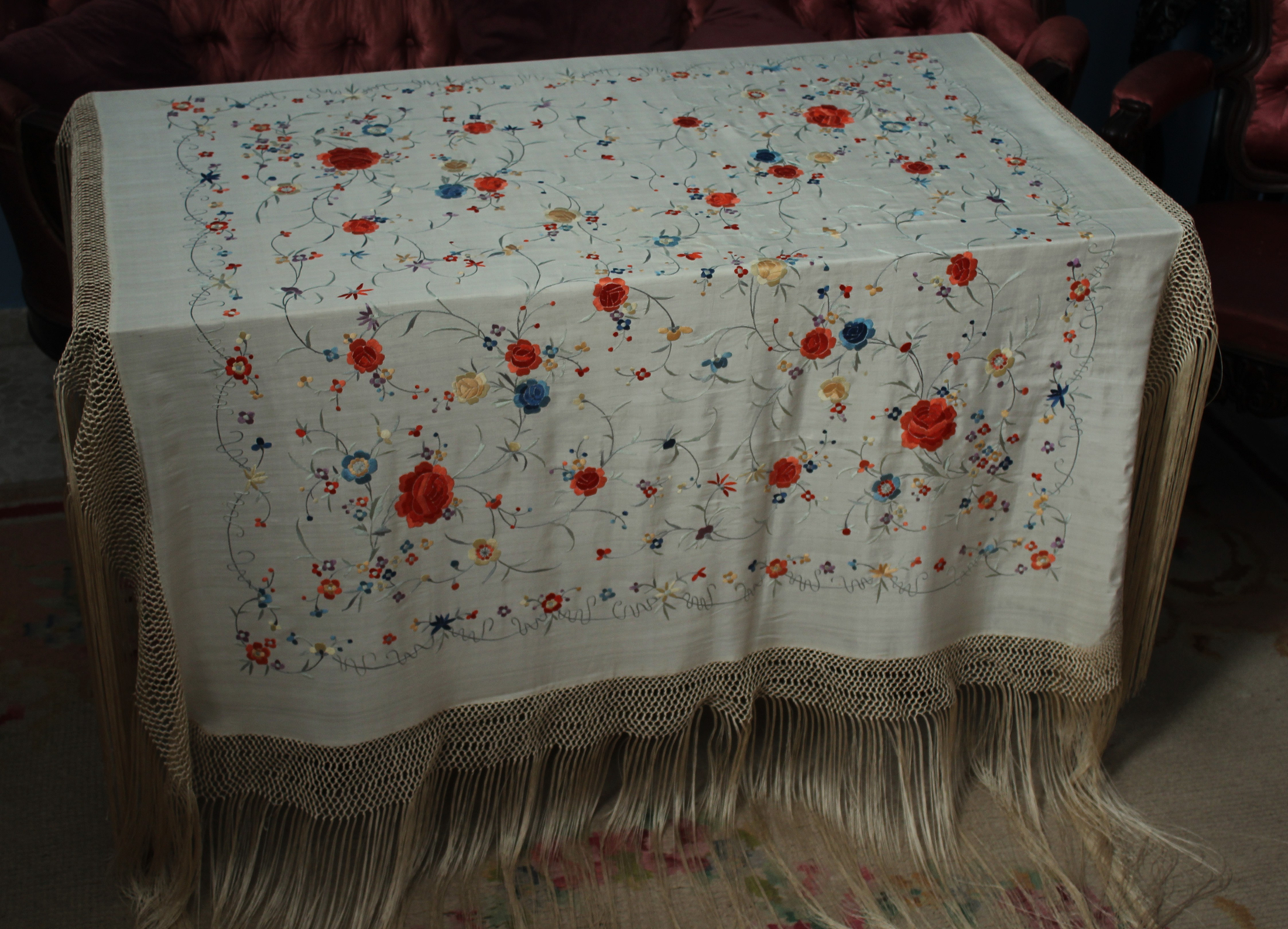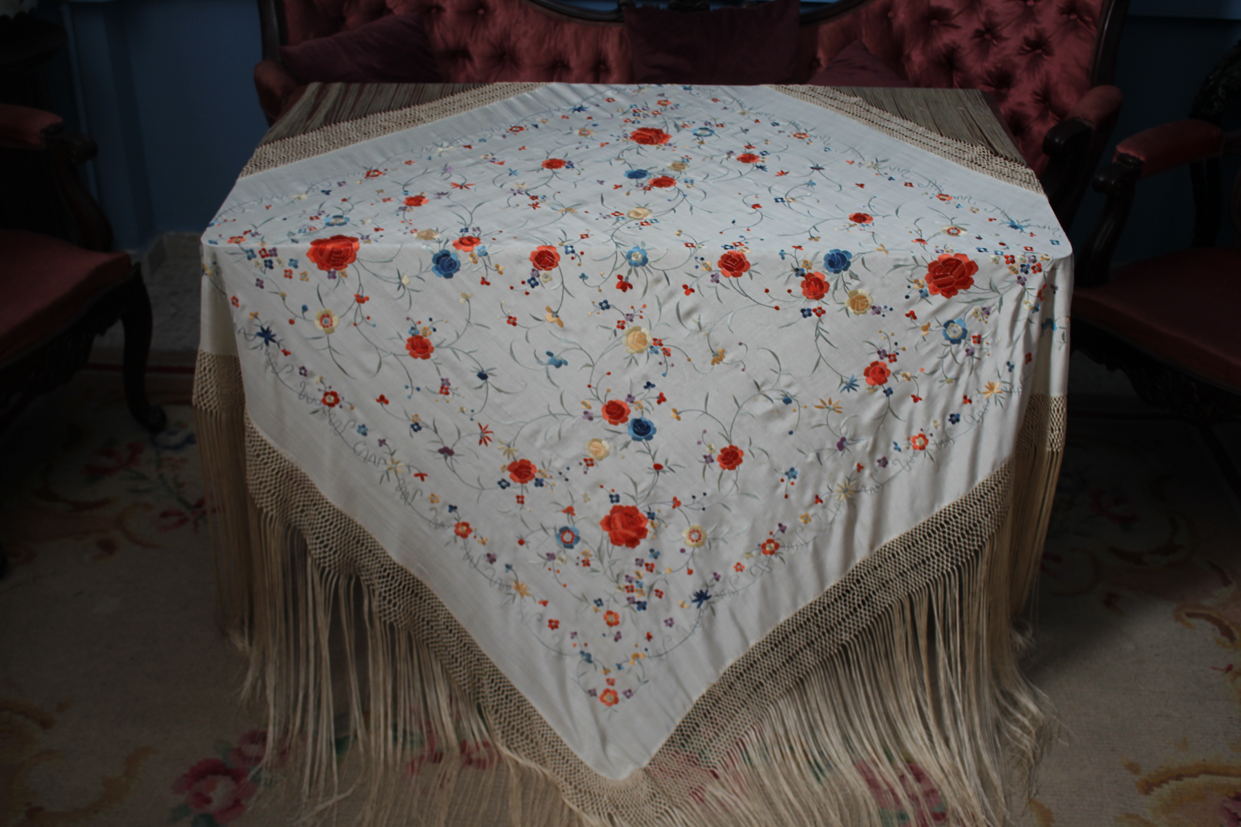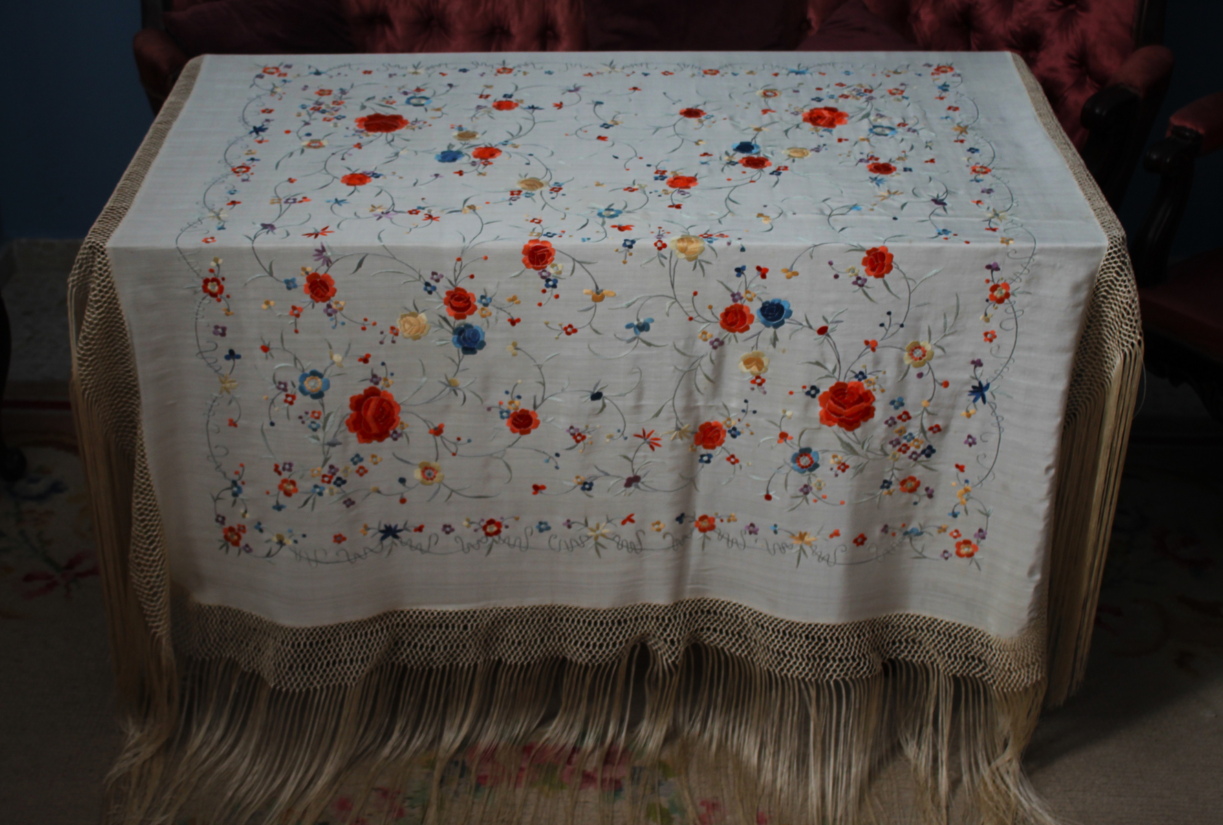 Mantón de Manila  antiguo de finales del siglo XIX y principios del Siglo XX, bordado a mano en seda beige. Motivos de flores, hojas y ramas. Los colores de las flores son rojas, naranjas y azules.