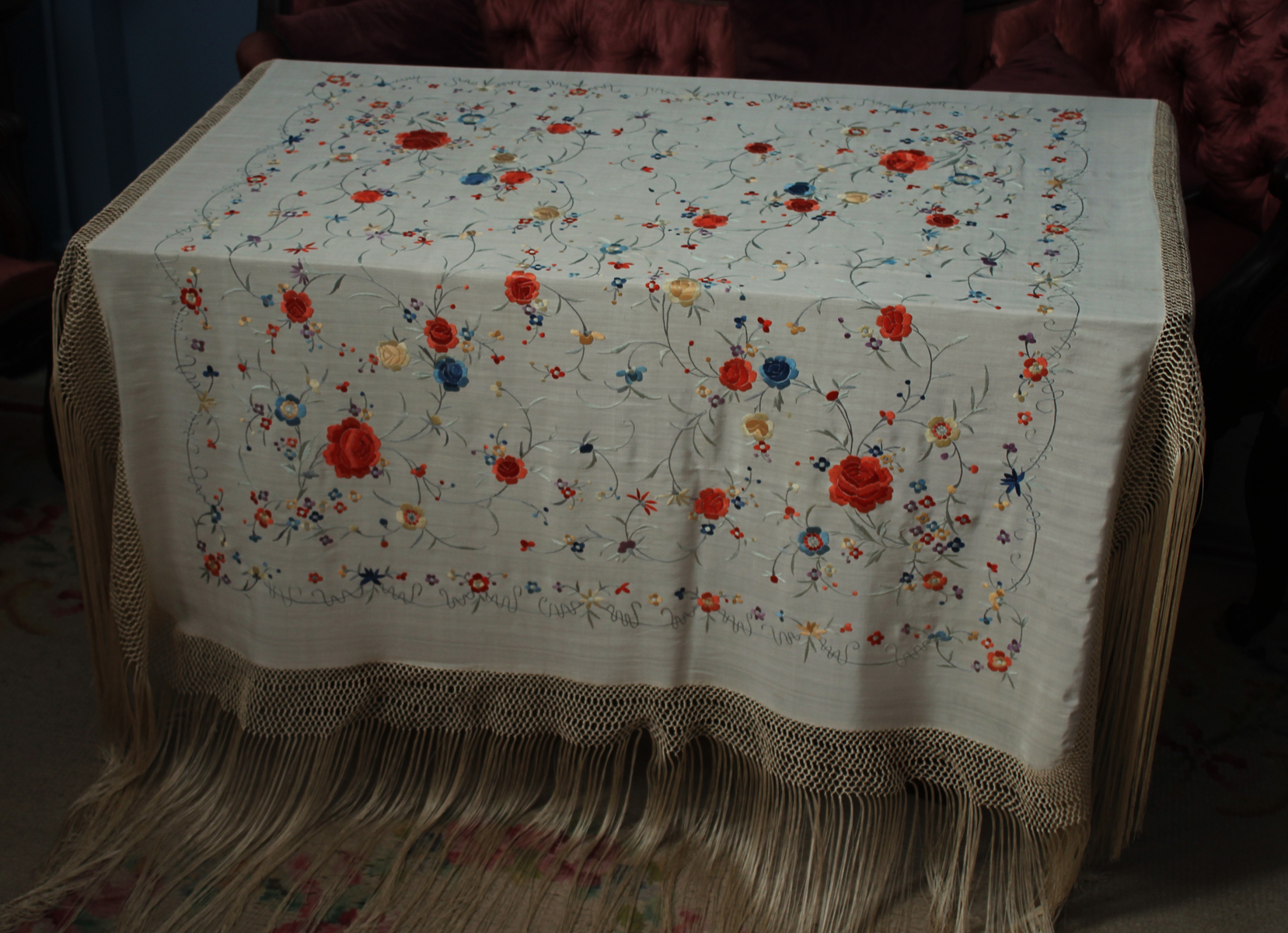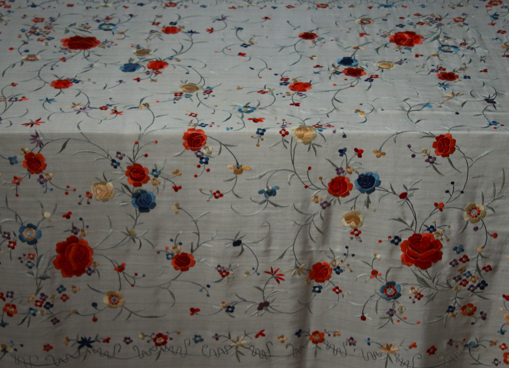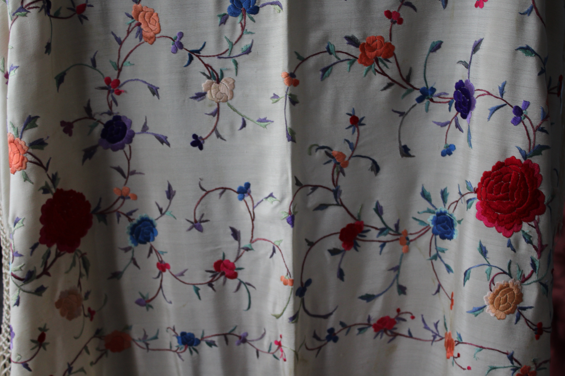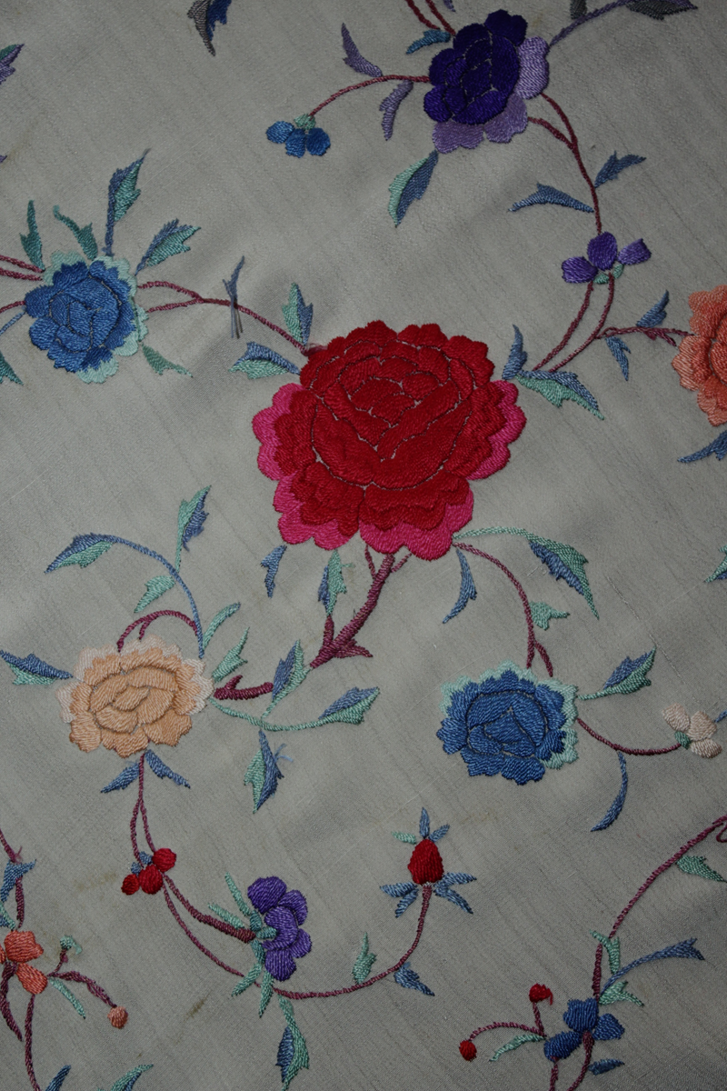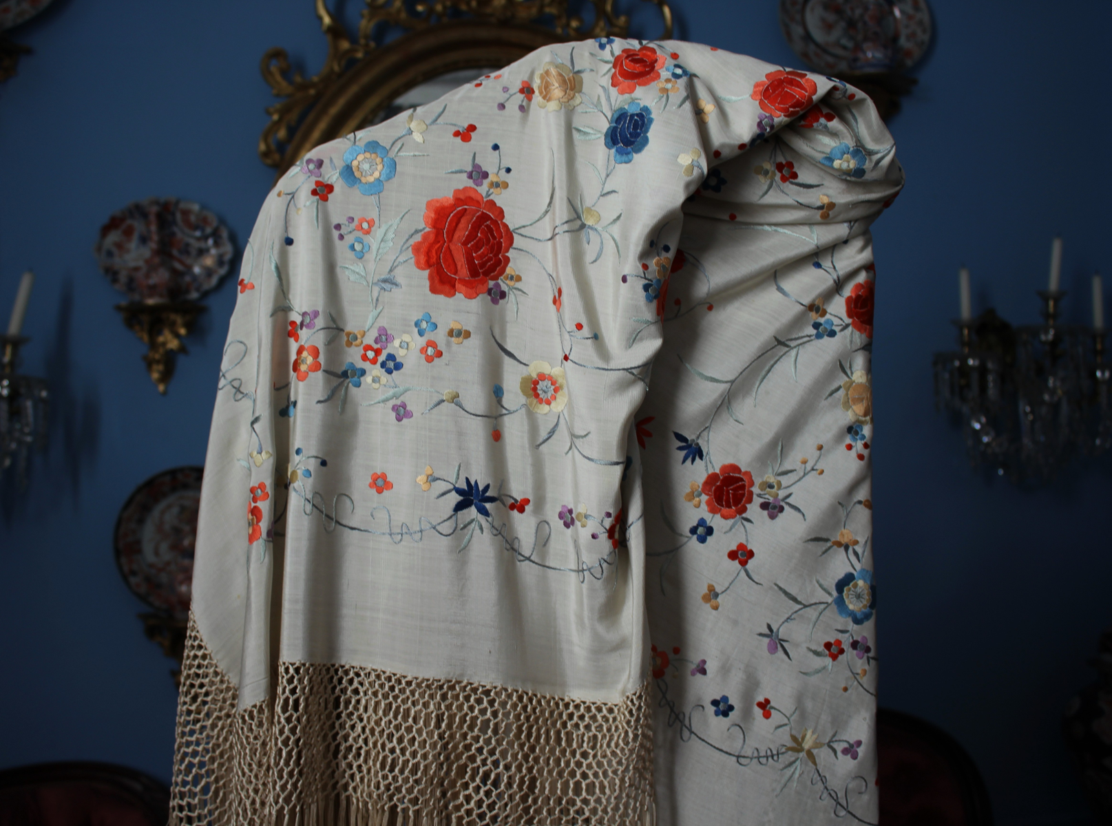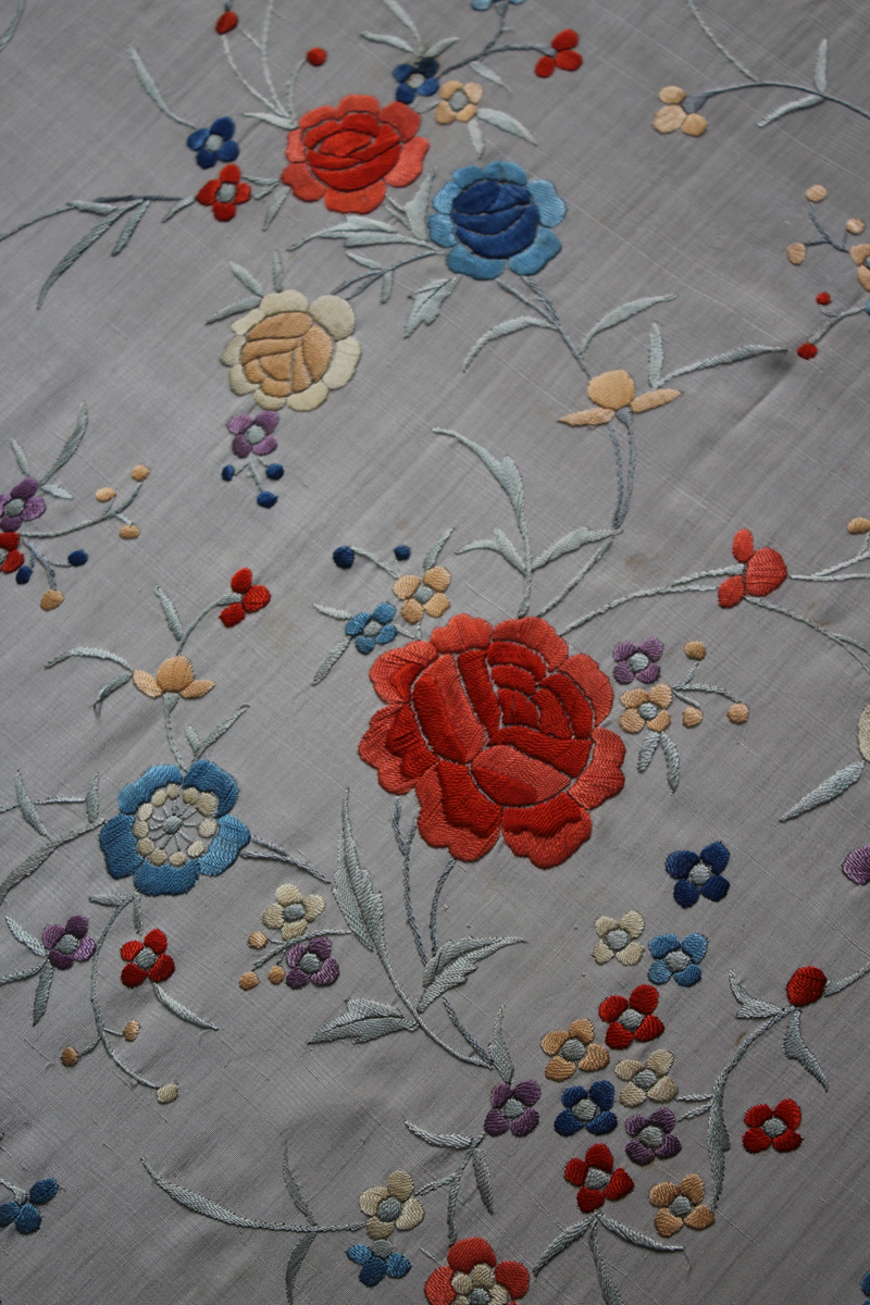 Mantón de Manila  antiguo de finales del siglo XIX y principios del Siglo XX, bordado a mano en seda beige. Motivos de flores, hojas y ramas. Los colores de las flores son rojas, naranjas y azules.