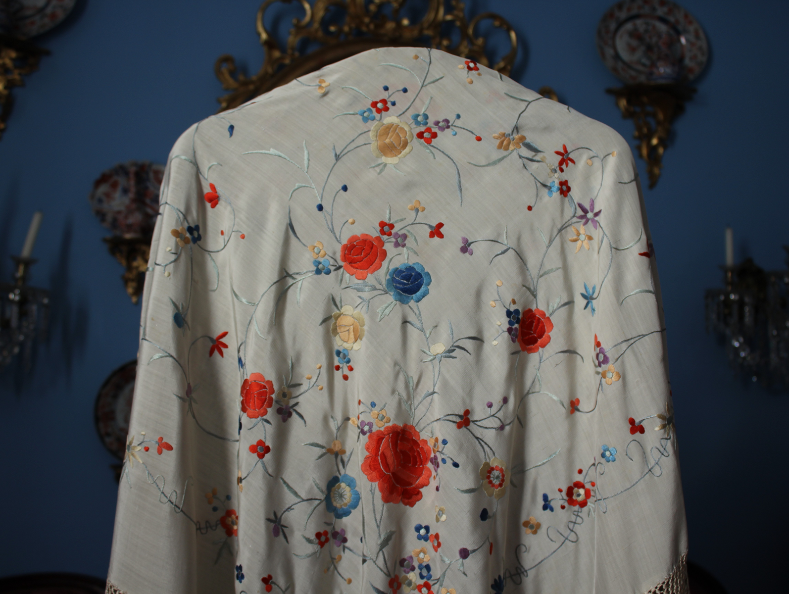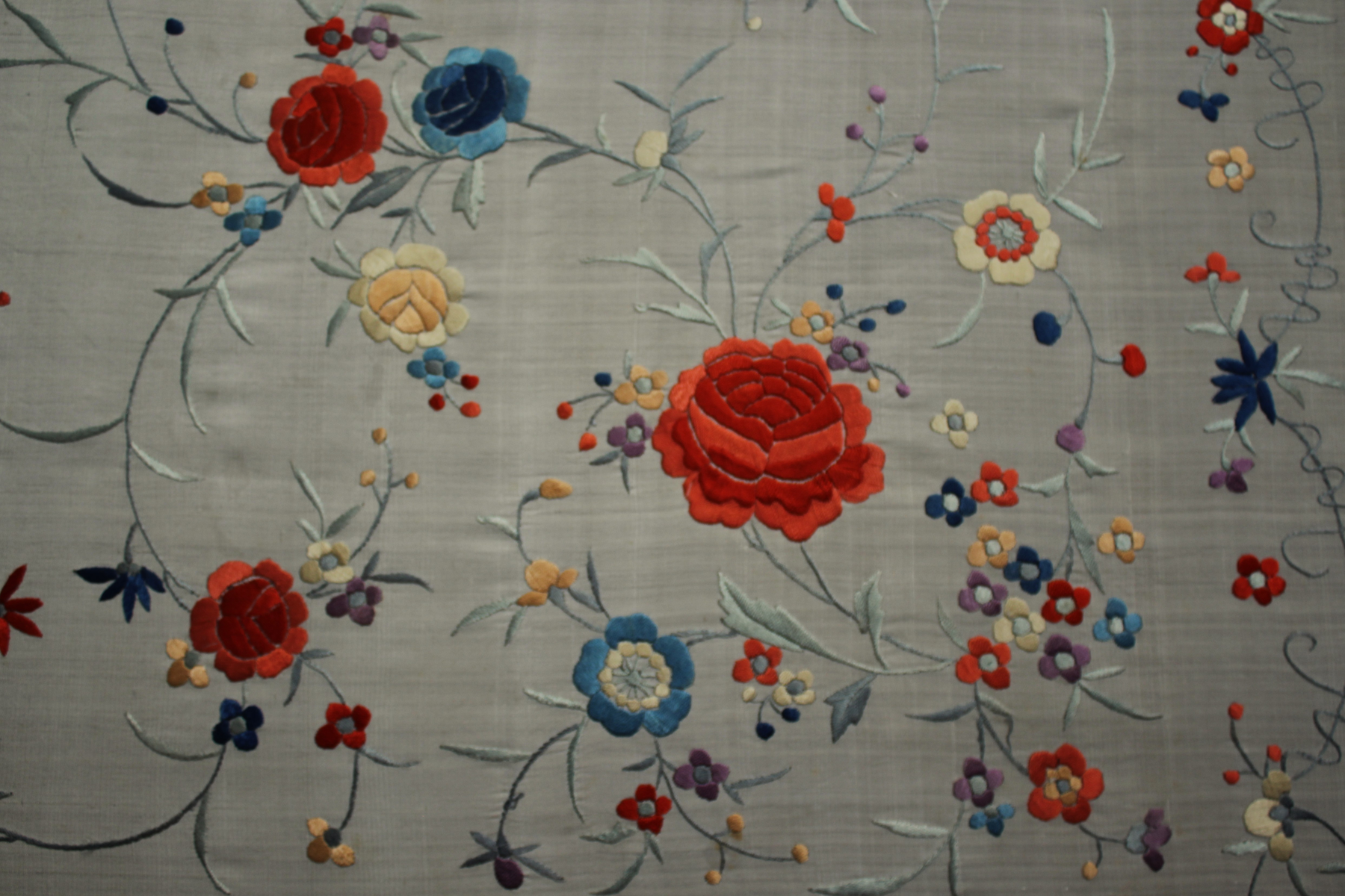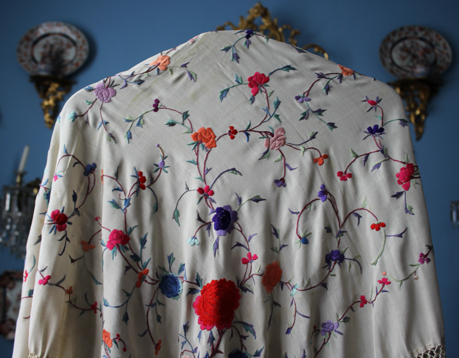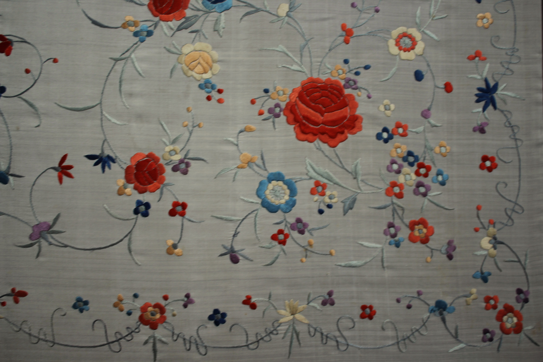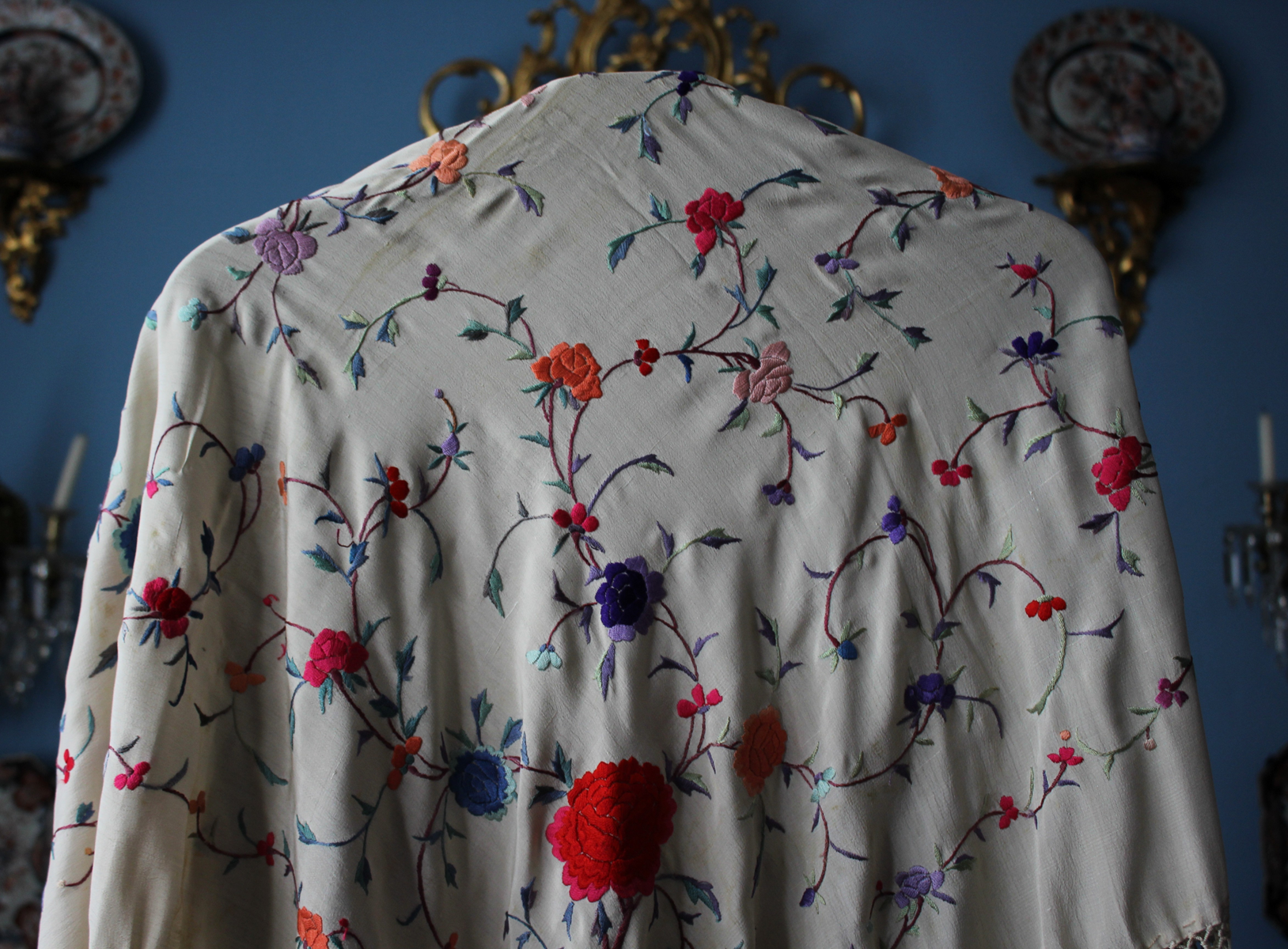 Mantón de Manila  antiguo de finales del siglo XIX y principios del Siglo XX, bordado a mano en seda beige. Motivos de flores, hojas y ramas. Los colores de las flores son rojas, naranjas y azules.