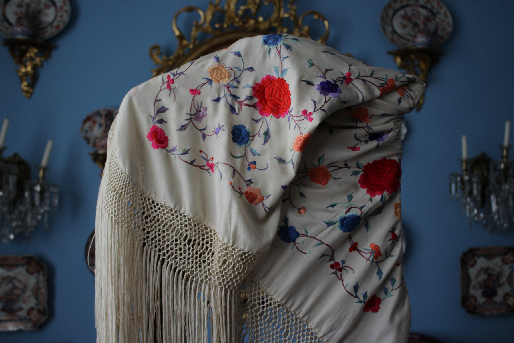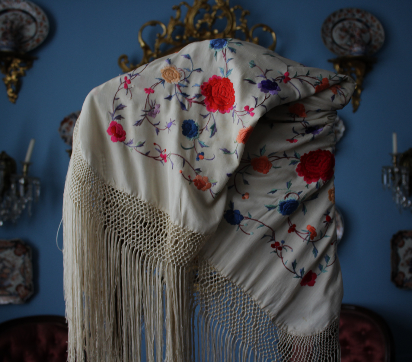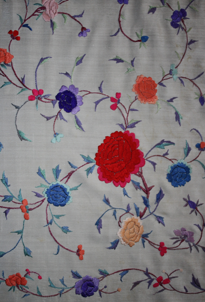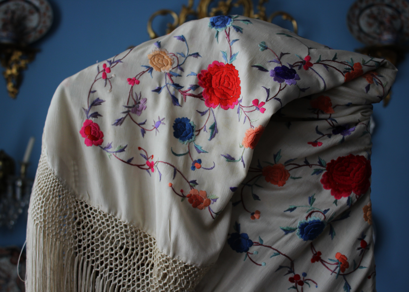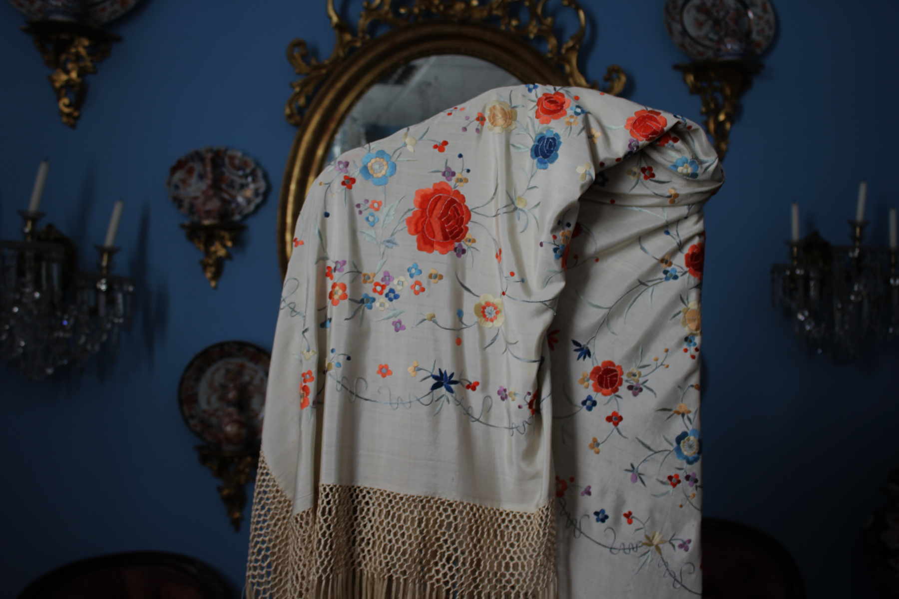 Mantón de Manila  antiguo de finales del siglo XIX y principios del Siglo XX, bordado a mano en seda beige. Motivos de flores, hojas y ramas. Los colores de las flores son rojas, naranjas y azules.