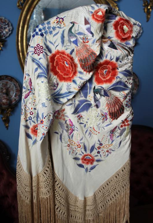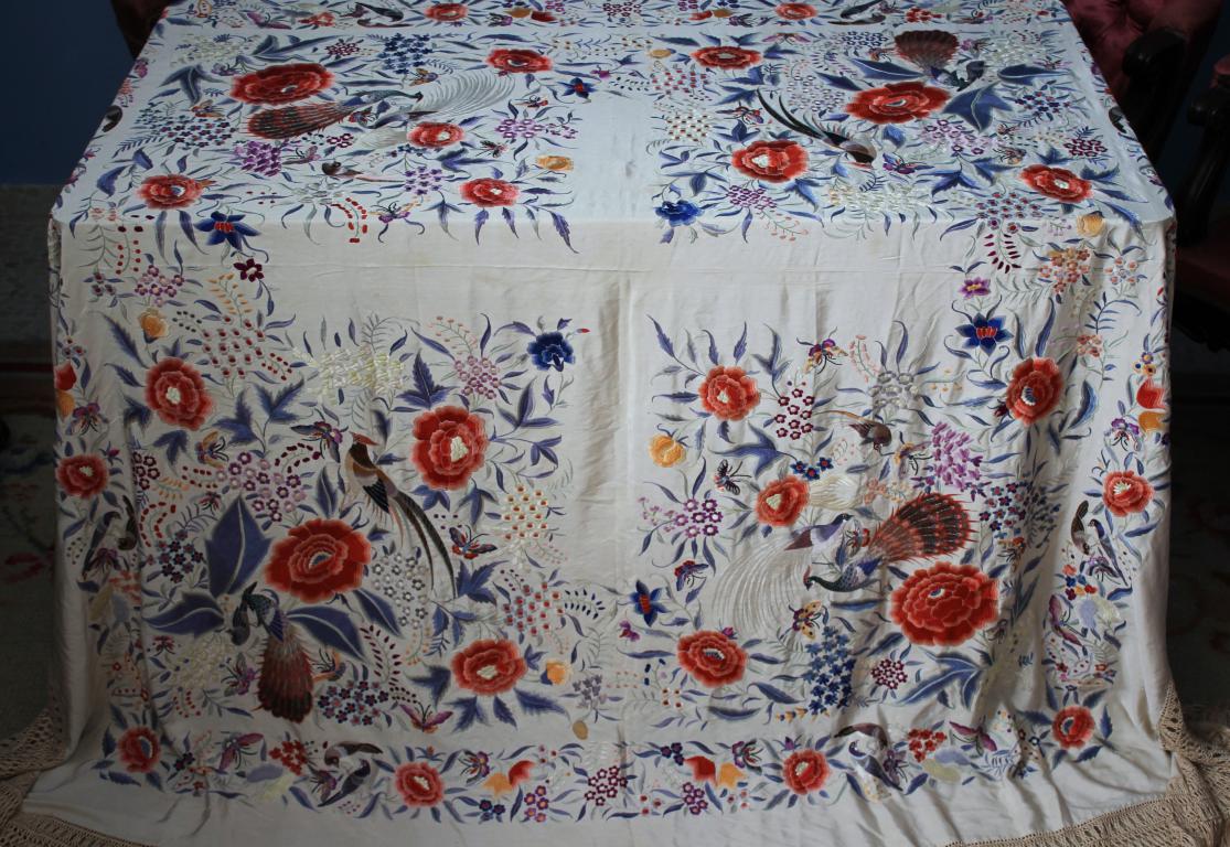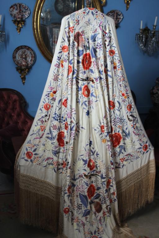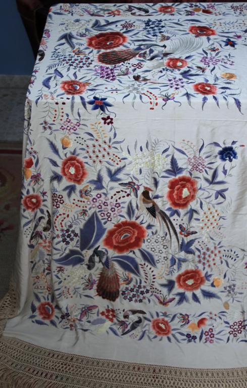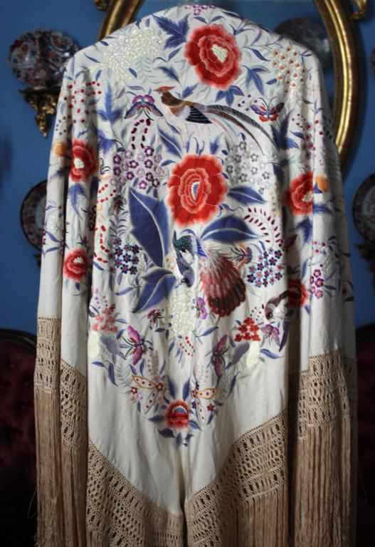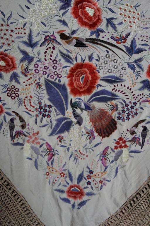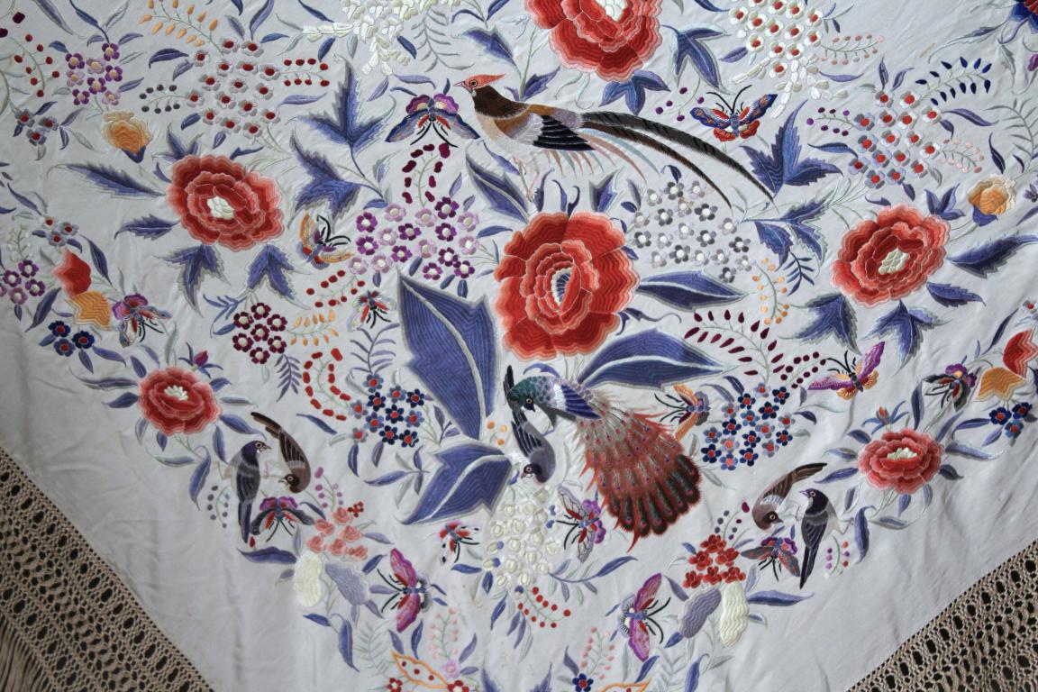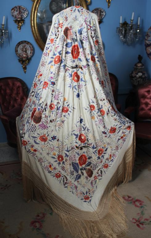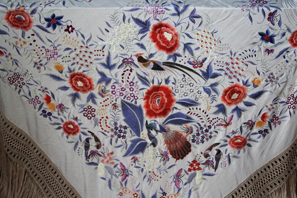 Extraordinario mantón de Manila Imperio antiguo del ultimo tercio del XIX (1870), de los denominados cantoneses. Bordado a mano sobre seda de color beige nacarada. Motivo de flores y aves, todas rodeadas de hojas y flores más pequeñas, bordado en colores azules, naranjas, verdes, , malva, rosa, lila, gris, etc.