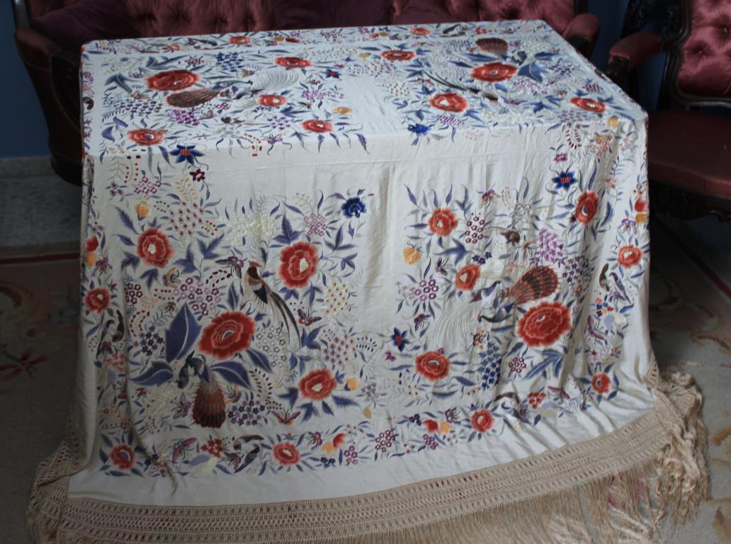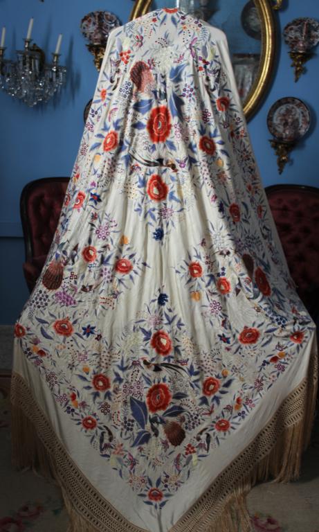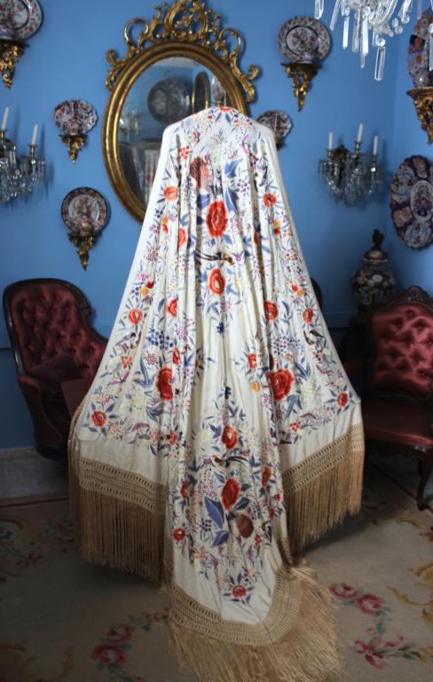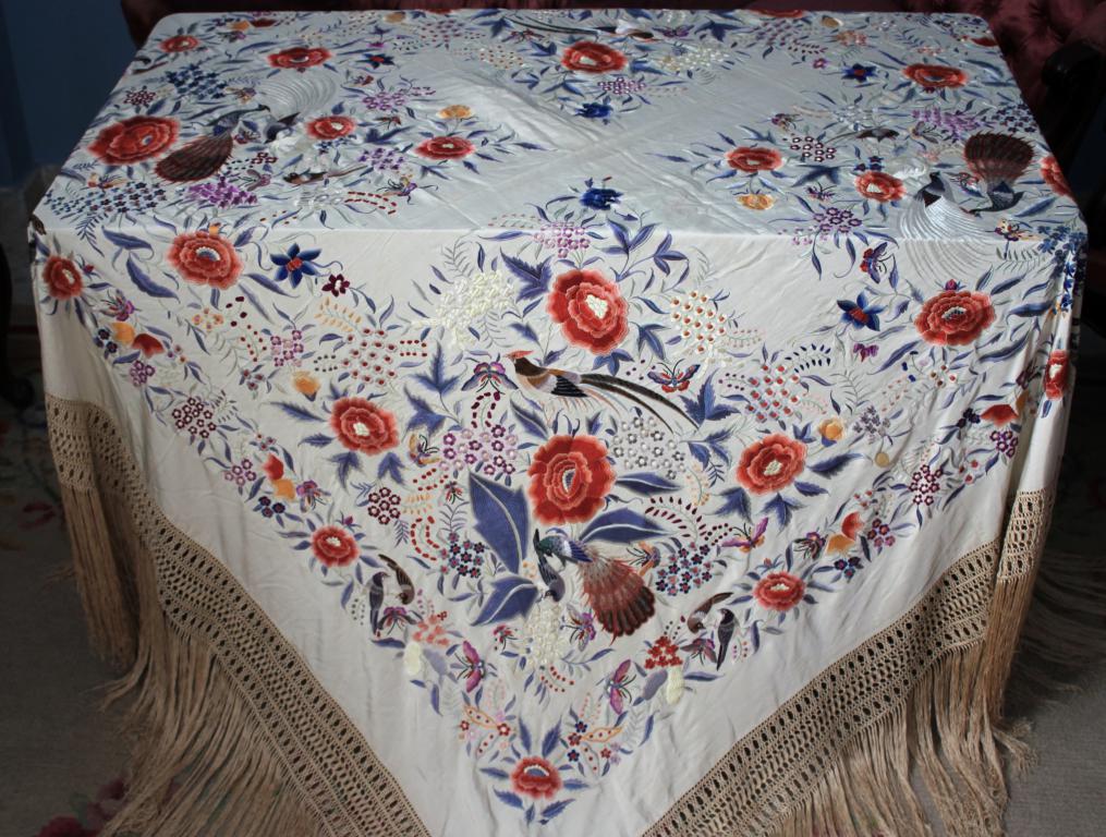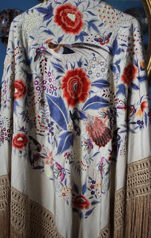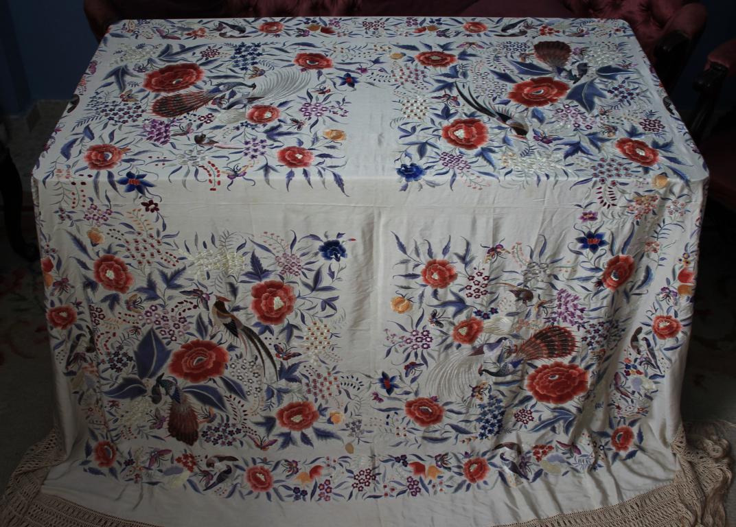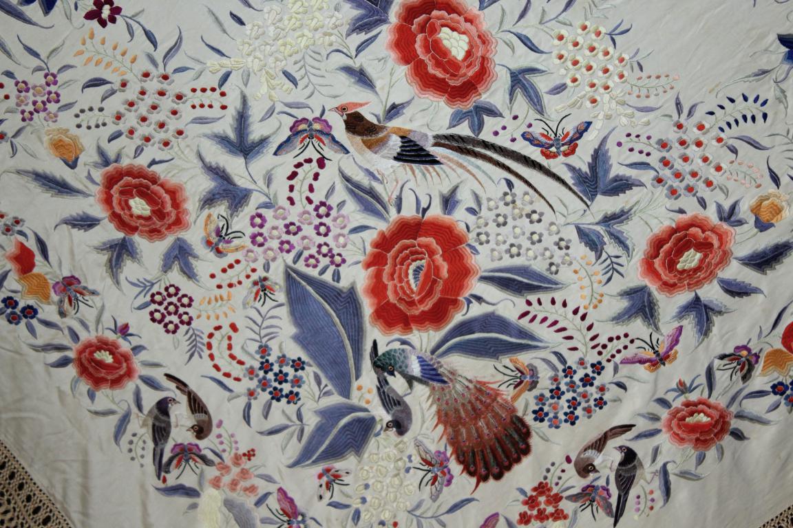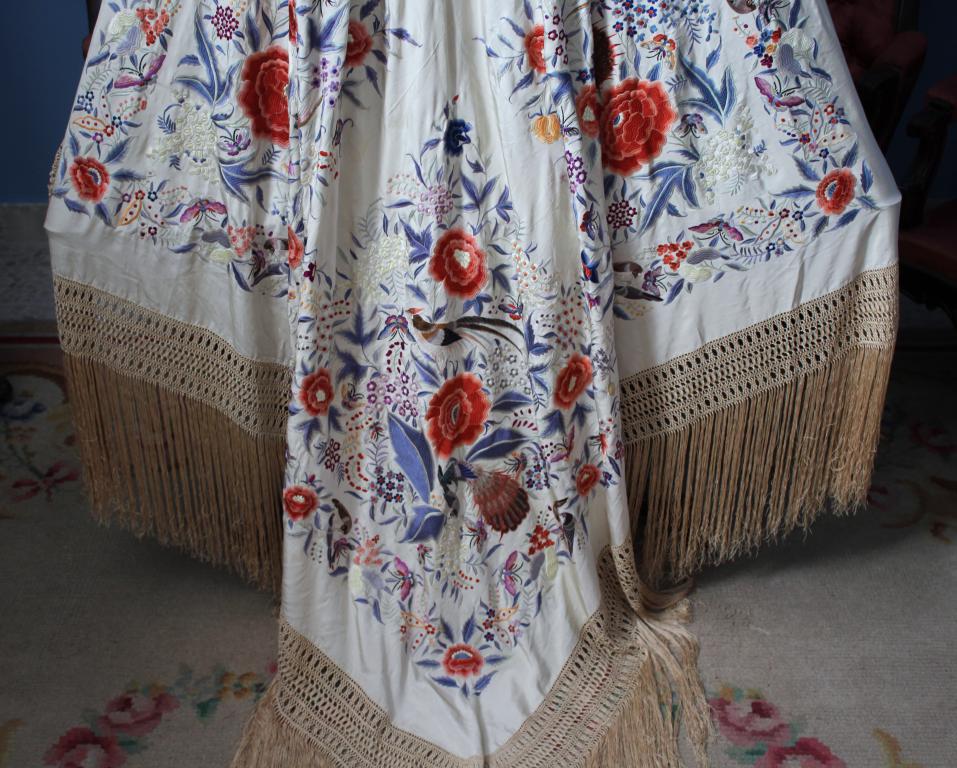 Extraordinario mantón de Manila Imperio antiguo del ultimo tercio del XIX (1870), de los denominados cantoneses. Bordado a mano sobre seda de color beige nacarada. Motivo de flores y aves, todas rodeadas de hojas y flores más pequeñas, bordado en colores azules, naranjas, verdes, , malva, rosa, lila, gris, etc.