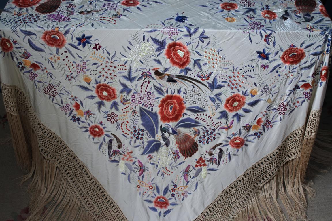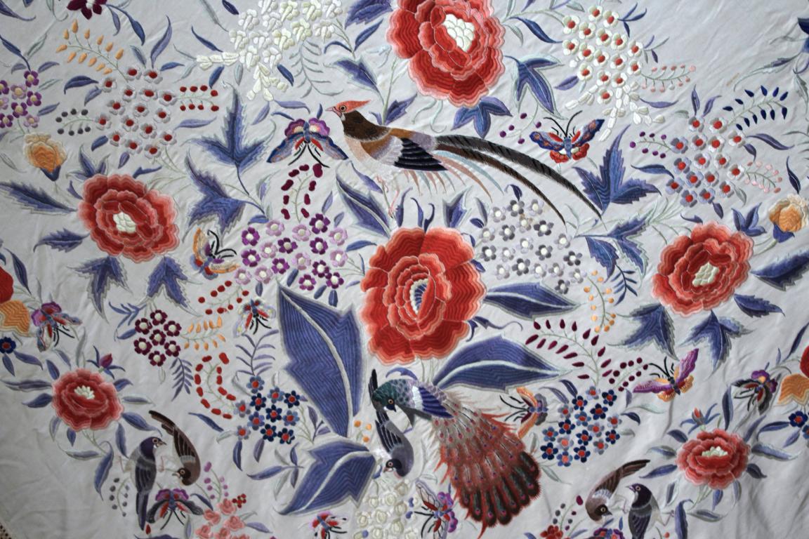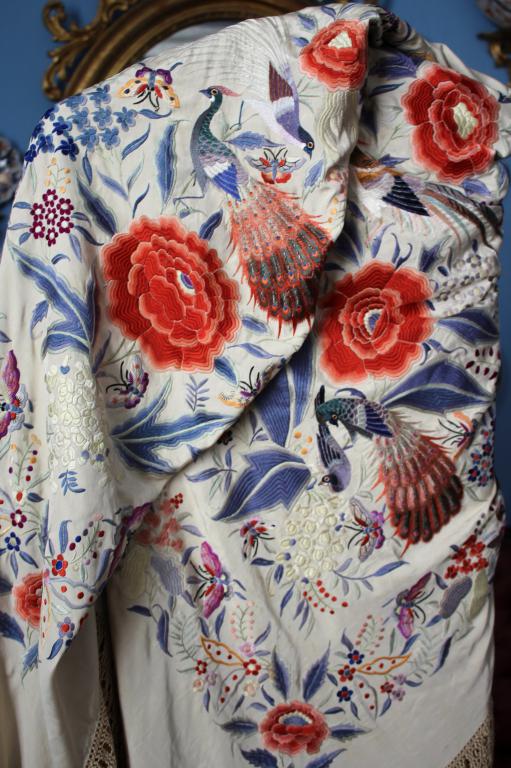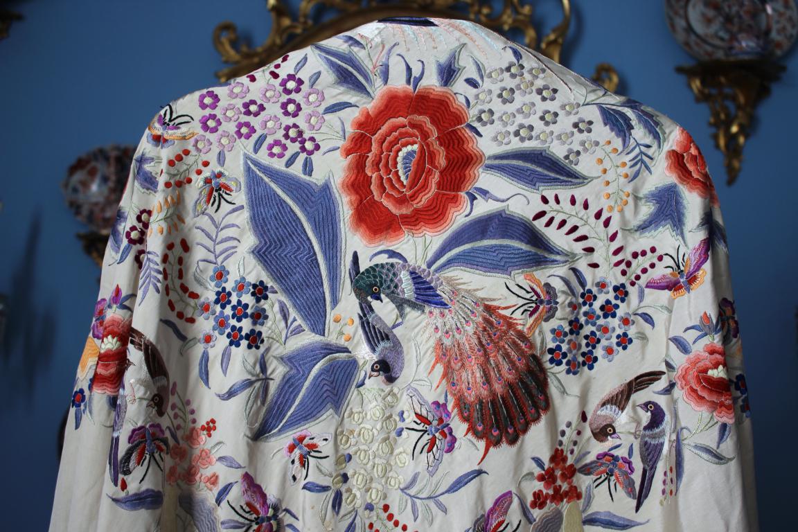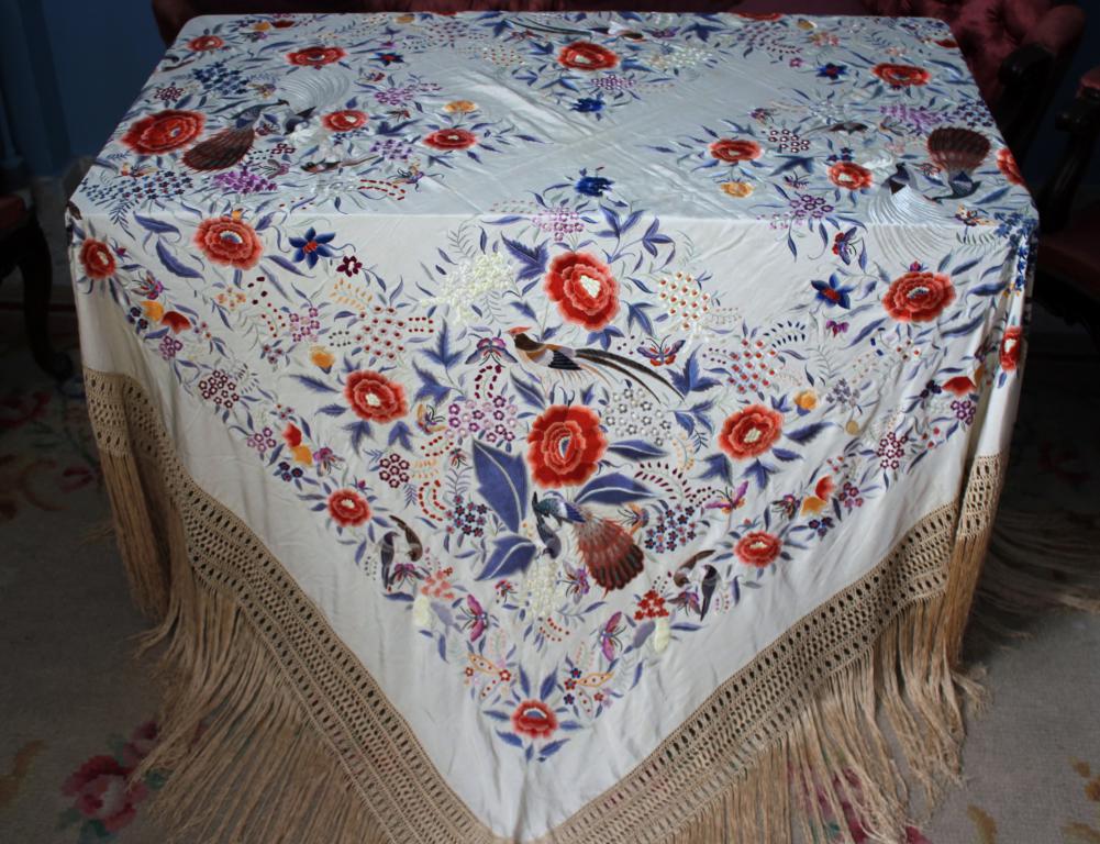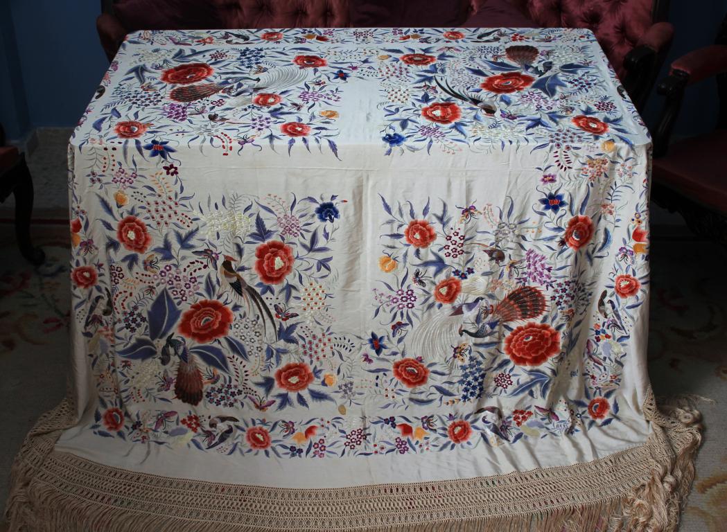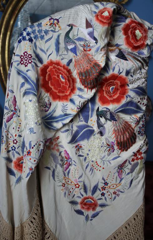 Extraordinario mantón de Manila Imperio antiguo del ultimo tercio del XIX (1870), de los denominados cantoneses. Bordado a mano sobre seda de color beige nacarada. Motivo de flores y aves, todas rodeadas de hojas y flores más pequeñas, bordado en colores azules, naranjas, verdes, , malva, rosa, lila, gris, etc.
