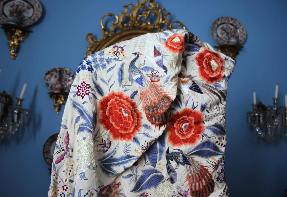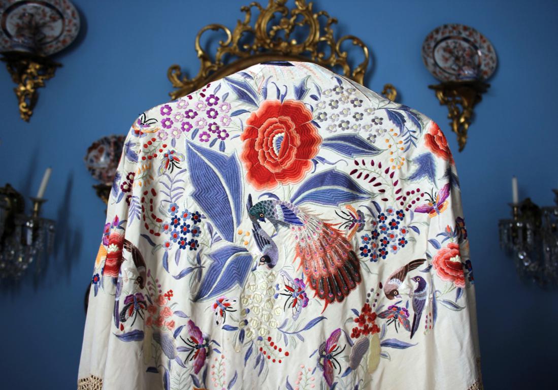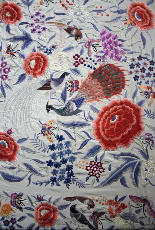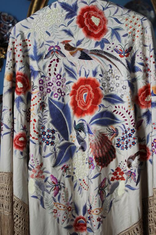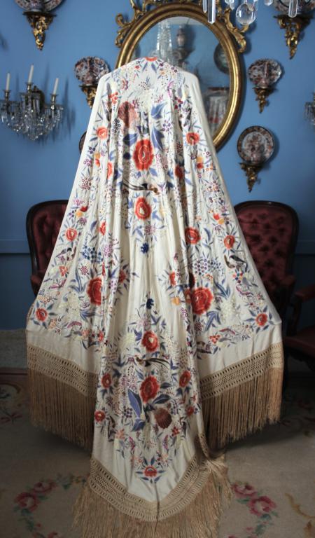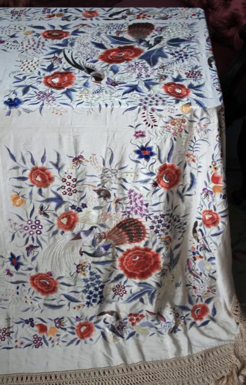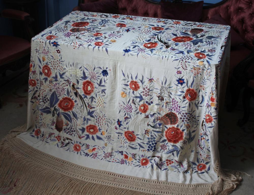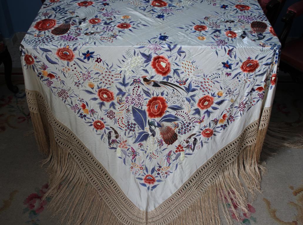 Extraordinario mantón de Manila Imperio antiguo del ultimo tercio del XIX (1870), de los denominados cantoneses. Bordado a mano sobre seda de color beige nacarada. Motivo de flores y aves, todas rodeadas de hojas y flores más pequeñas, bordado en colores azules, naranjas, verdes, , malva, rosa, lila, gris, etc.