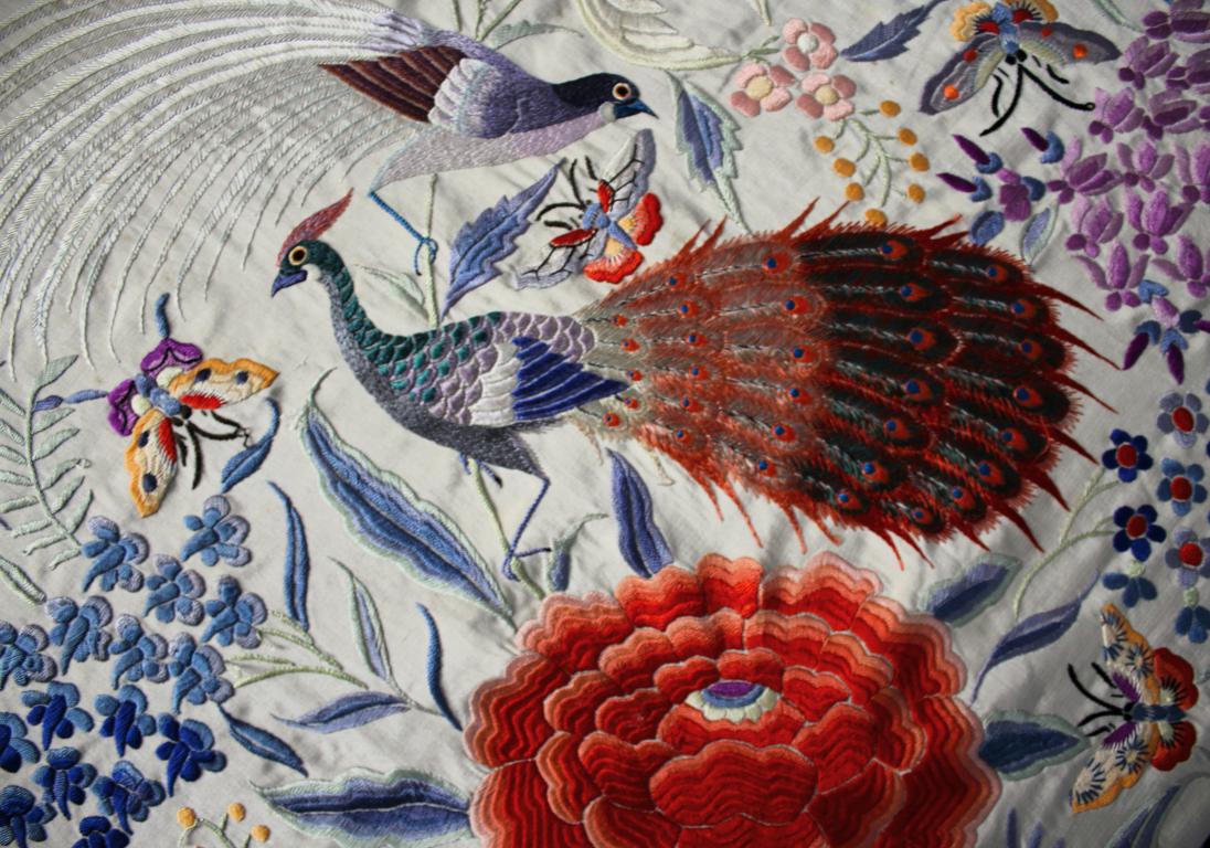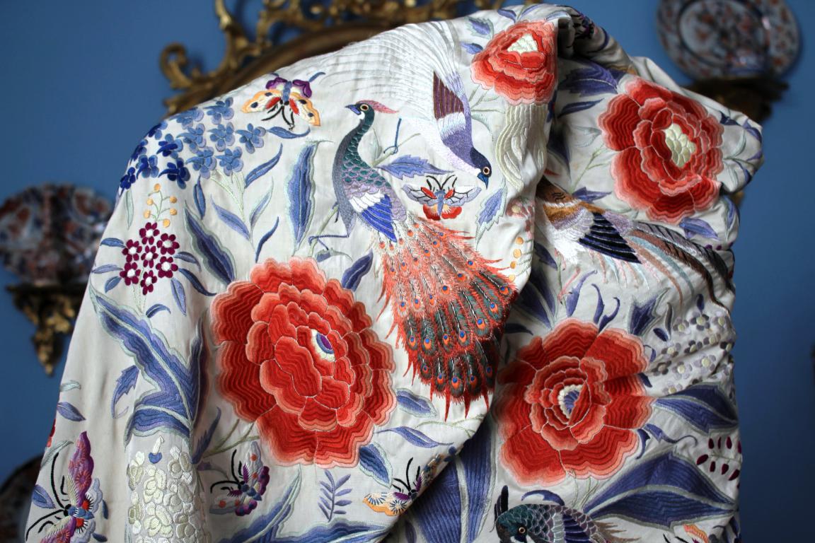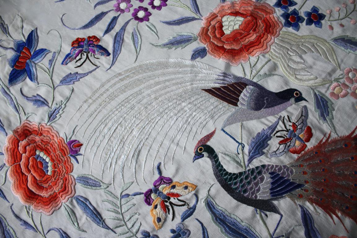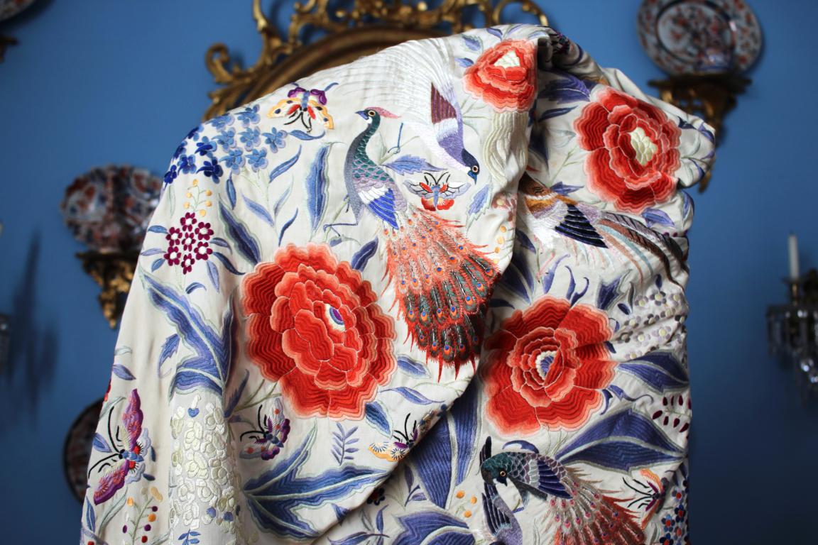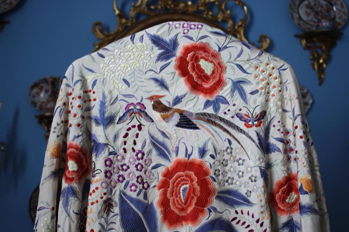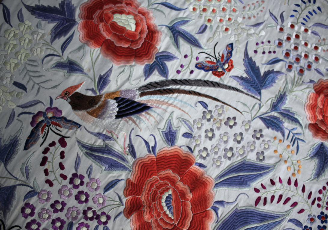 Extraordinario mantón de Manila Imperio antiguo del ultimo tercio del XIX (1870), de los denominados cantoneses. Bordado a mano sobre seda de color beige nacarada. Motivo de flores y aves, todas rodeadas de hojas y flores más pequeñas, bordado en colores azules, naranjas, verdes, , malva, rosa, lila, gris, etc.