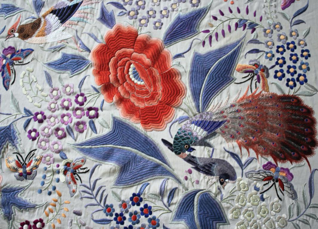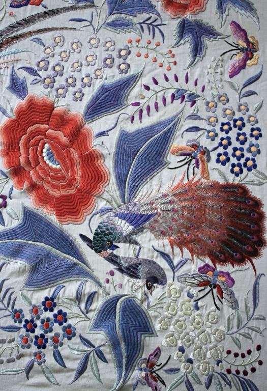 Una cenefa recorre todo el borde del mismo, con un motivo de flores, hojas y aves entrelazadas, teniendo en sus cuatros esquinas unos grandes ramos florales con un diseño maravilloso, donde destacan una composición cromática magnifica y grandes aves del paraiso con colas de vistosos plumaje, y pavos reales de vistoso plumaje. El bordado es apretado, y de puntada corta, no distinguiéndose el derecho del revés, lo que le hace tener un efecto el bordado de relieve o de pintado.